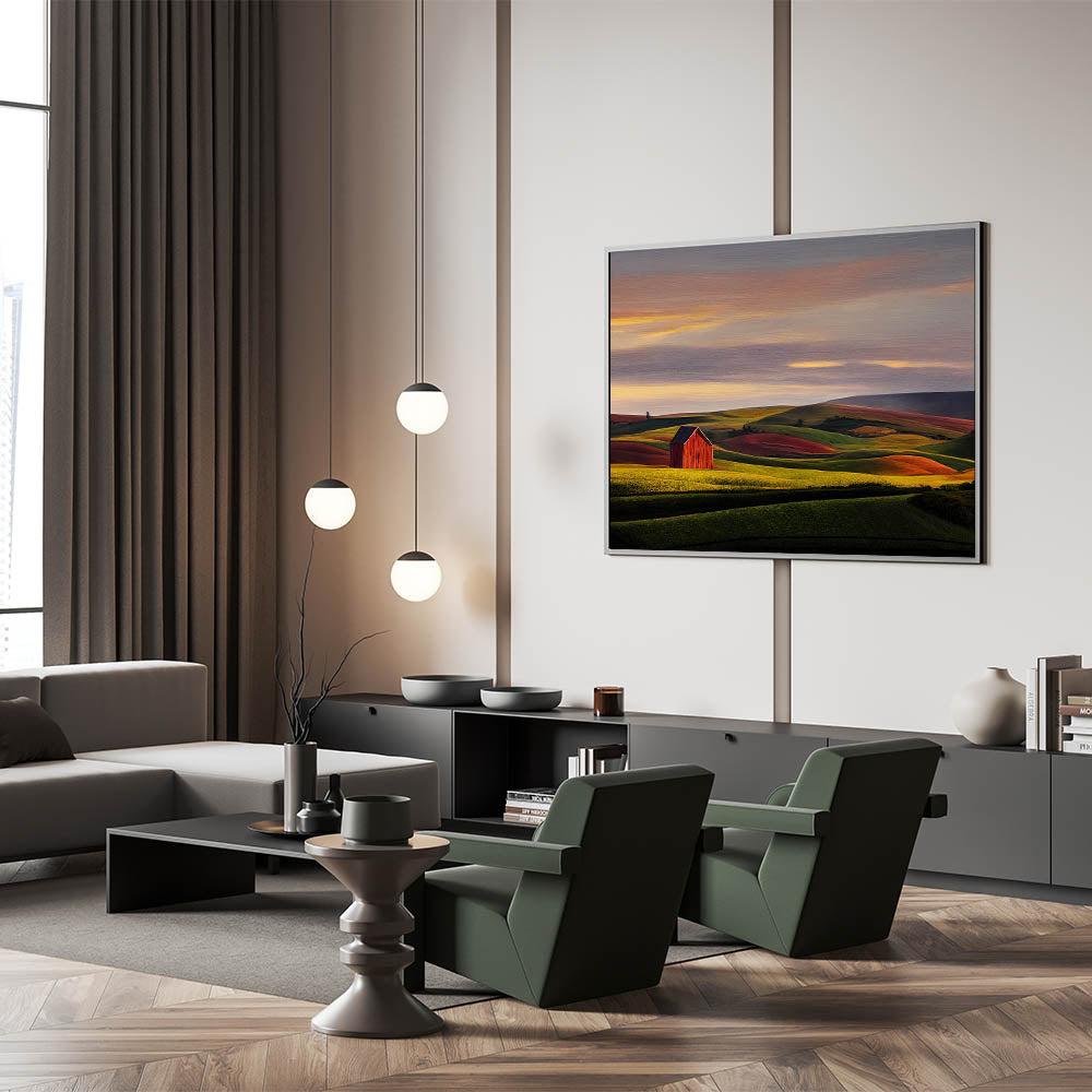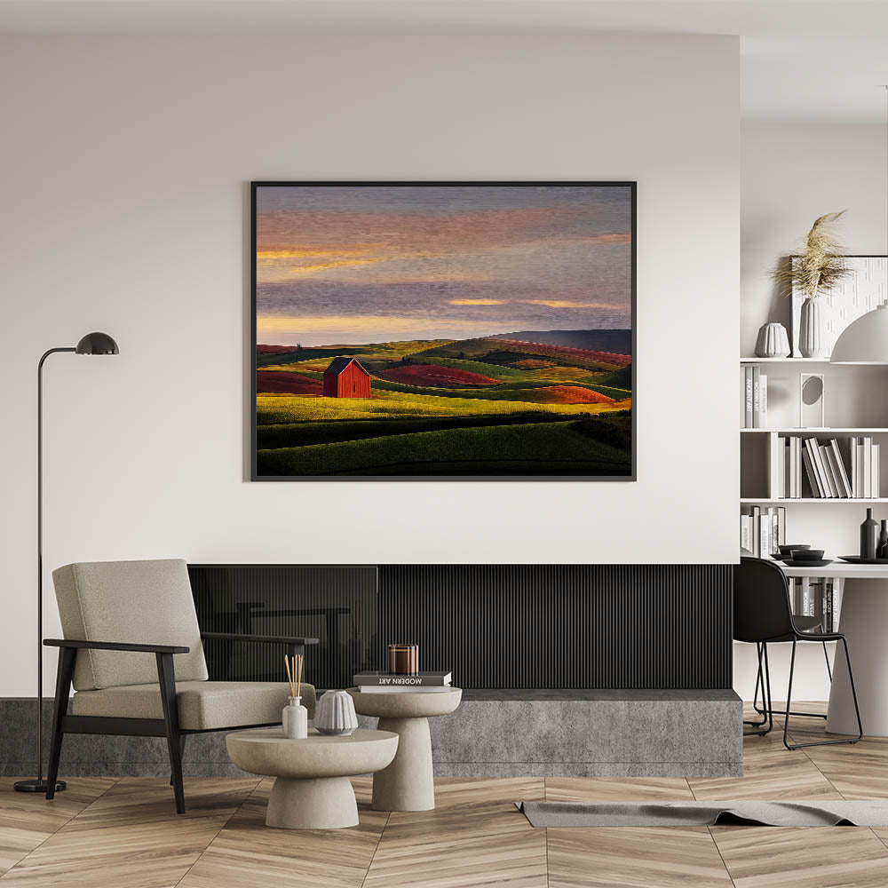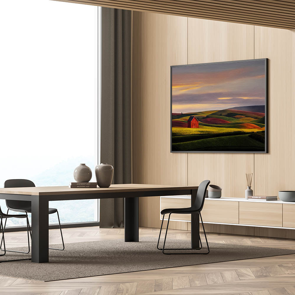 This vibrant piece of Idaho landscape art showcases a picturesque red barn nestled in the rolling hills of Idaho. Bathed in the warm glow of sunrise, the vivid green and golden fields create a captivating contrast with the rustic barn, offering a peaceful and scenic view. Ideal for anyone who loves rustic decor or scenic Idaho prints, this artwork brings the charm of Idaho’s countryside into your home.