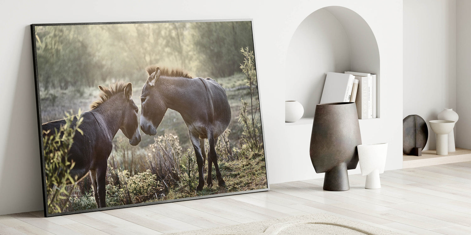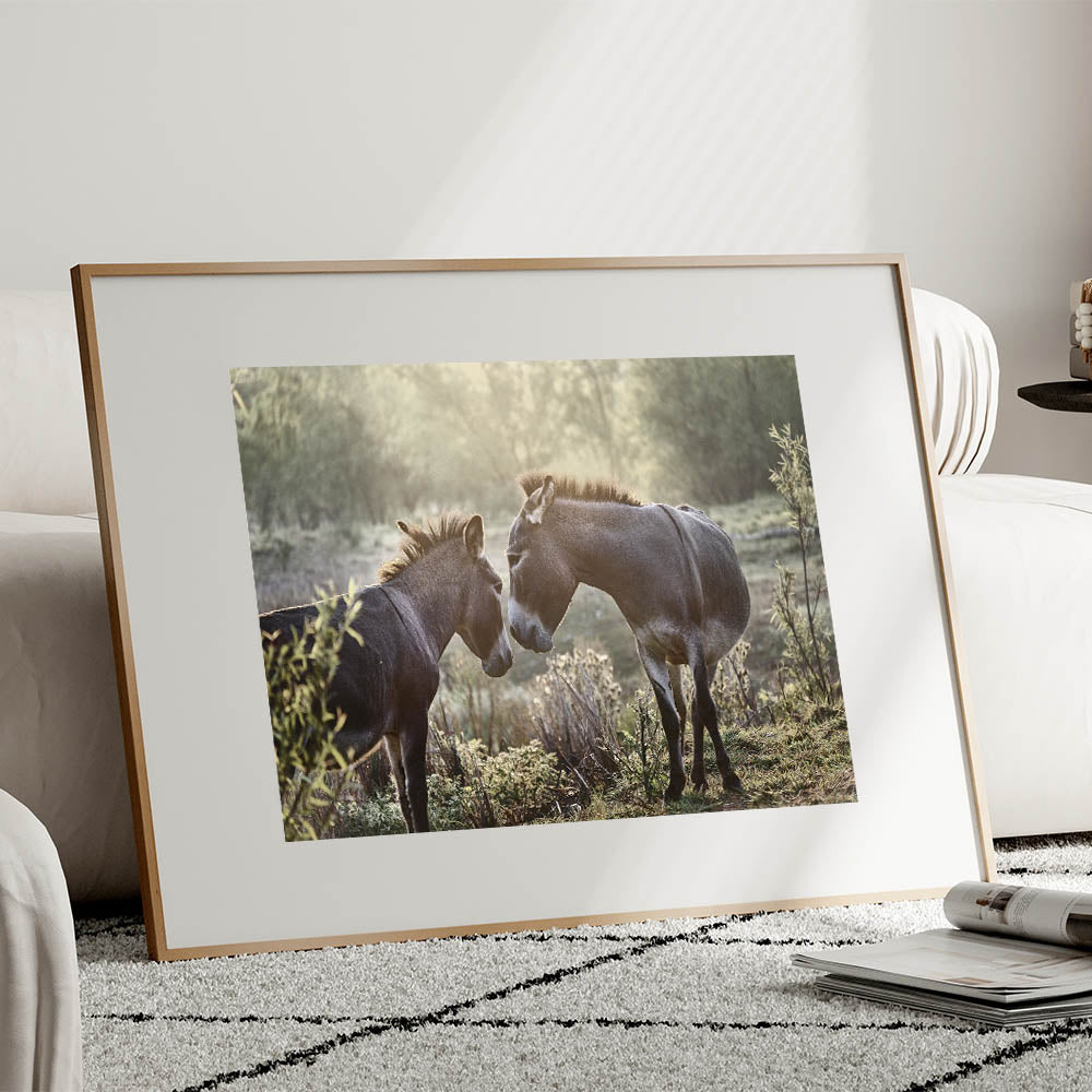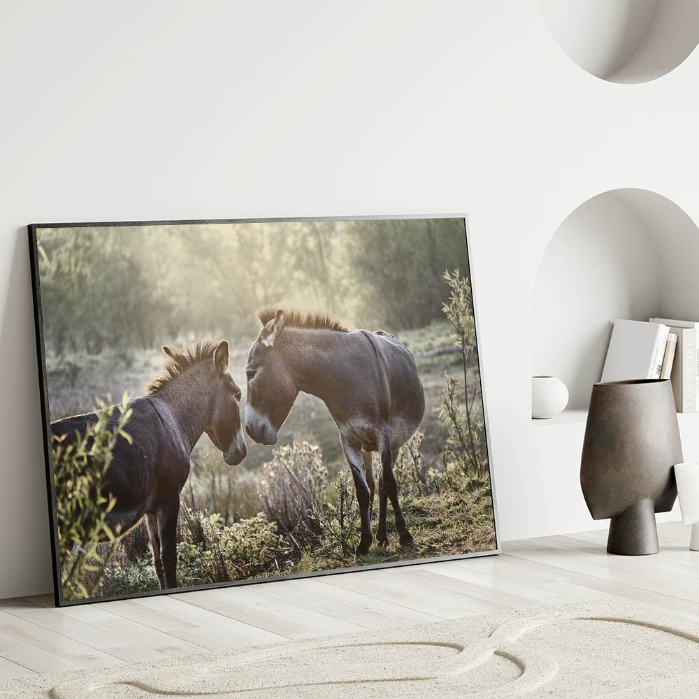 Capture the tranquil beauty of early morning light with this stunning Donkey Wall Art. Perfect for adding a touch of rustic charm to any space, this artwork showcases two donkeys sharing a peaceful moment, embodying the calmness of farm life.