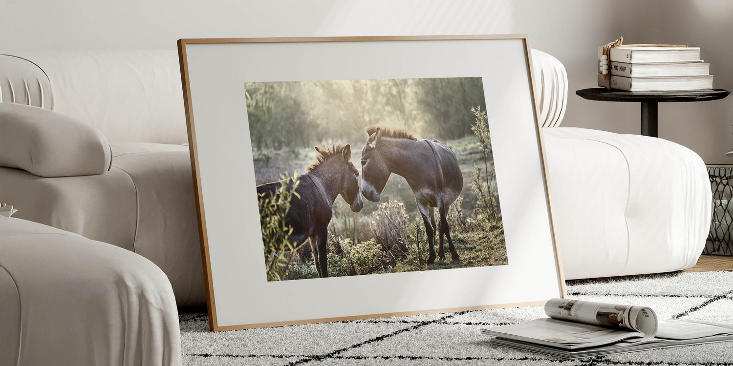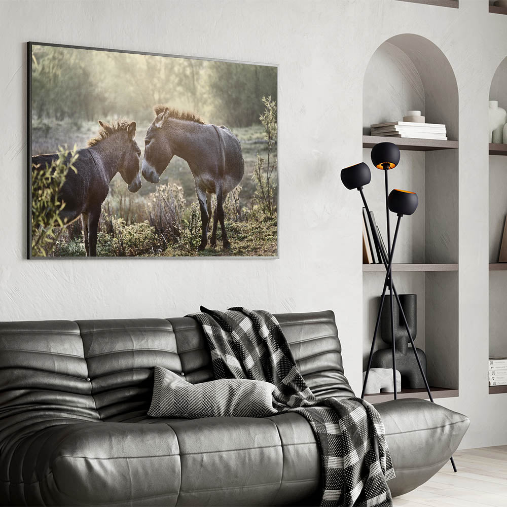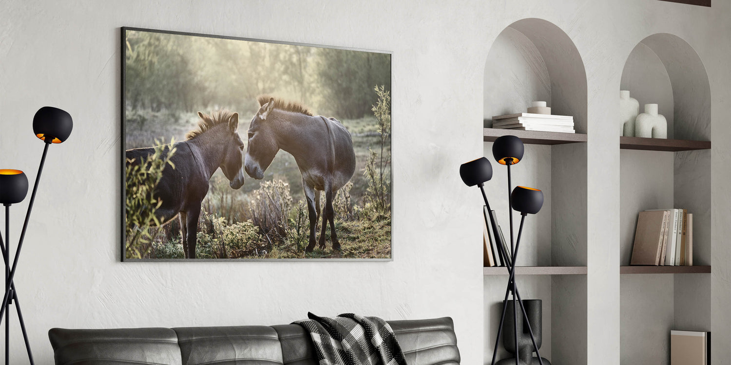 Capture the tranquil beauty of early morning light with this stunning Donkey Wall Art. Perfect for adding a touch of rustic charm to any space, this artwork showcases two donkeys sharing a peaceful moment, embodying the calmness of farm life.