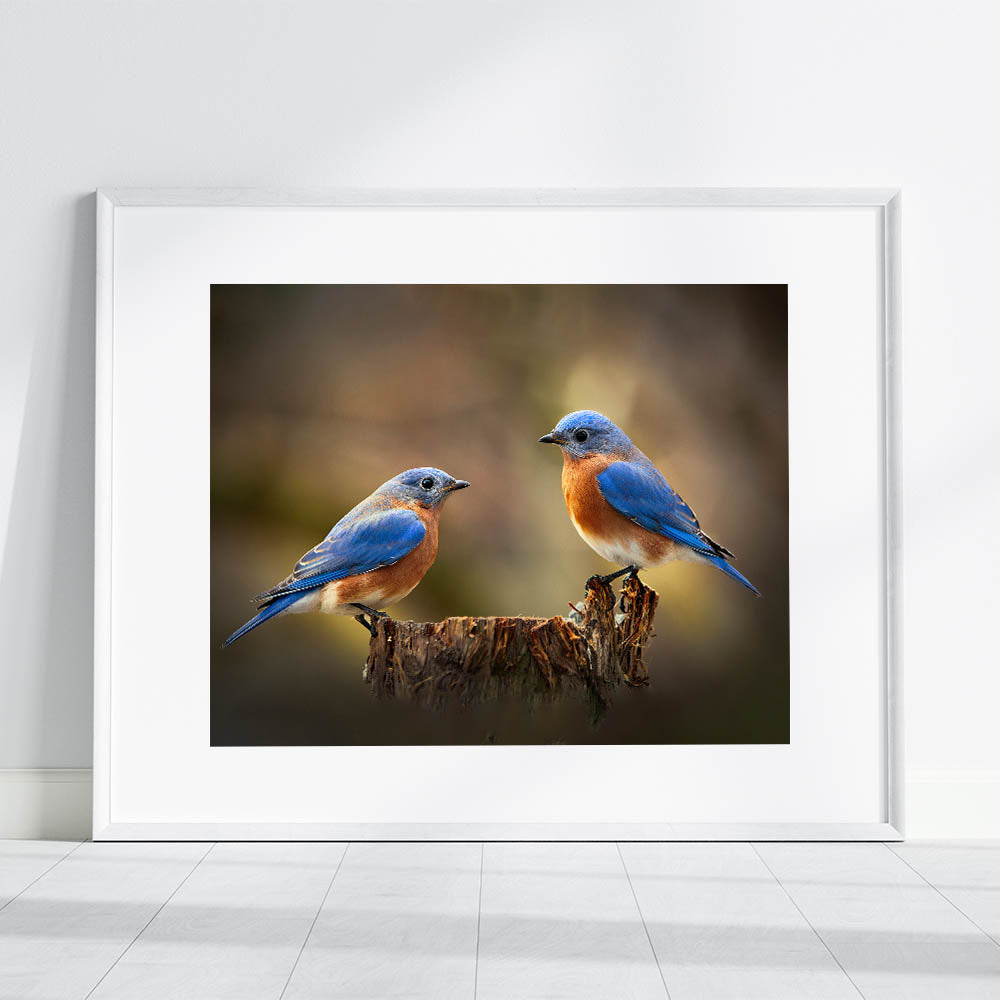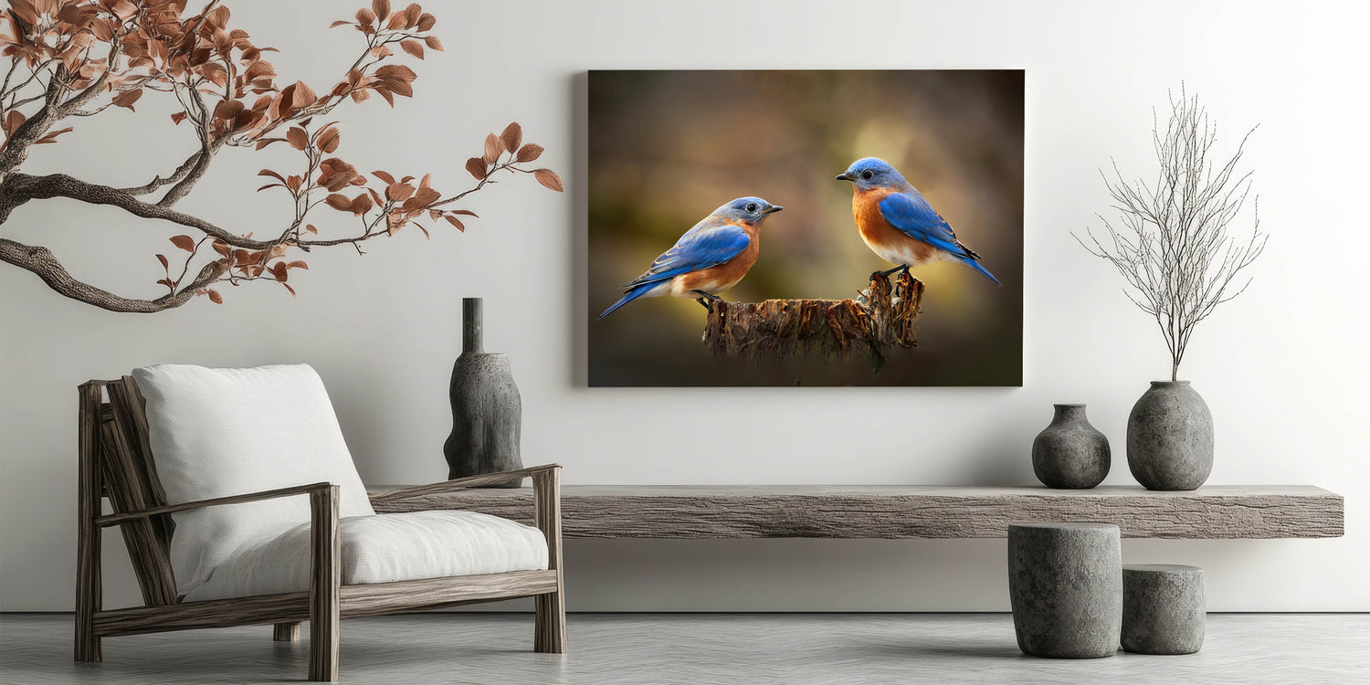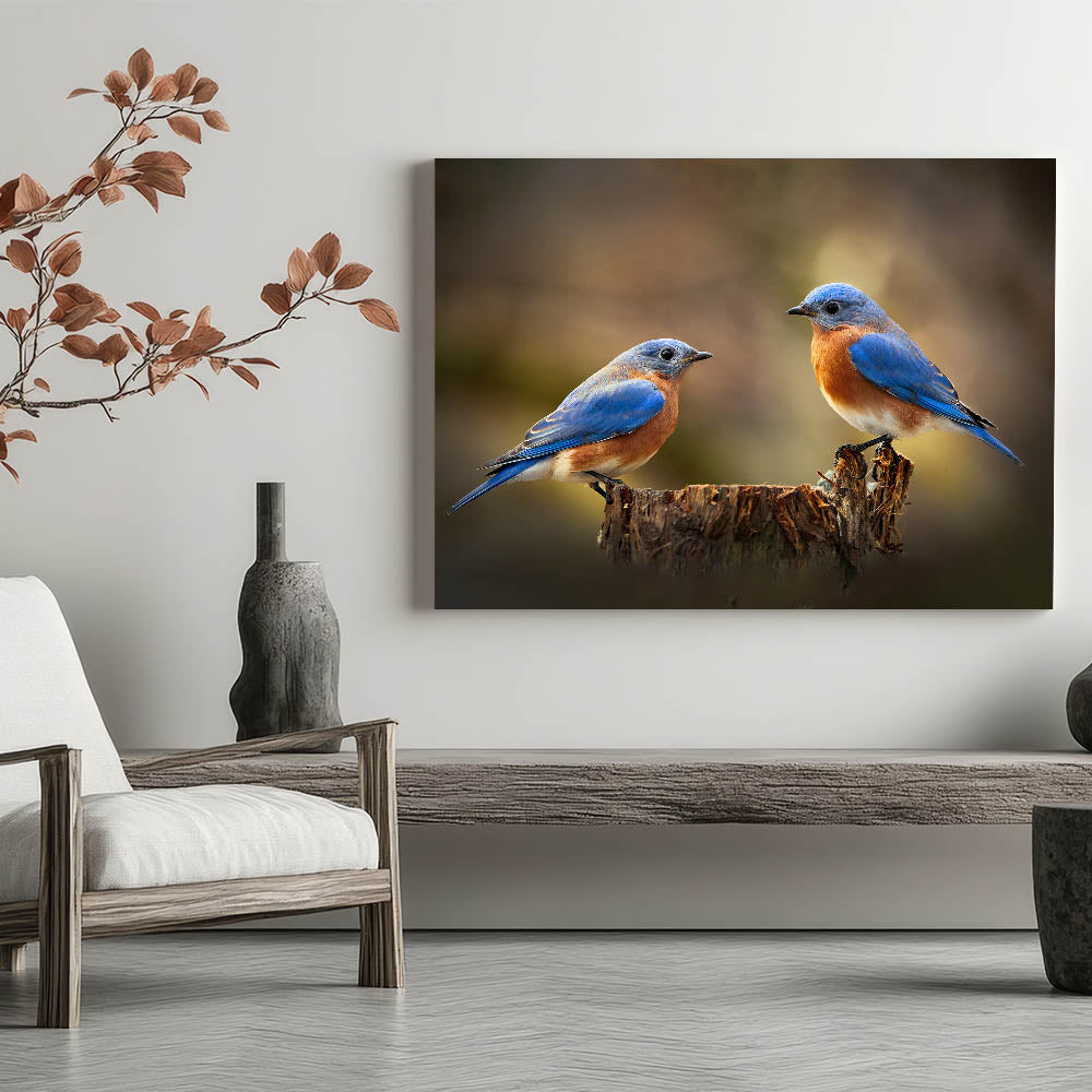Enhance your space with the calming beauty of this Serene Garden Birds Wall Art. Featuring a stunning photograph of two bluebirds perched opposite each other, this artwork captures a peaceful moment in nature. The rich blue and warm rust tones of the birds contrast beautifully with the soft, blurred background, creating a harmonious and inviting scene that will add a touch of tranquility to any room.