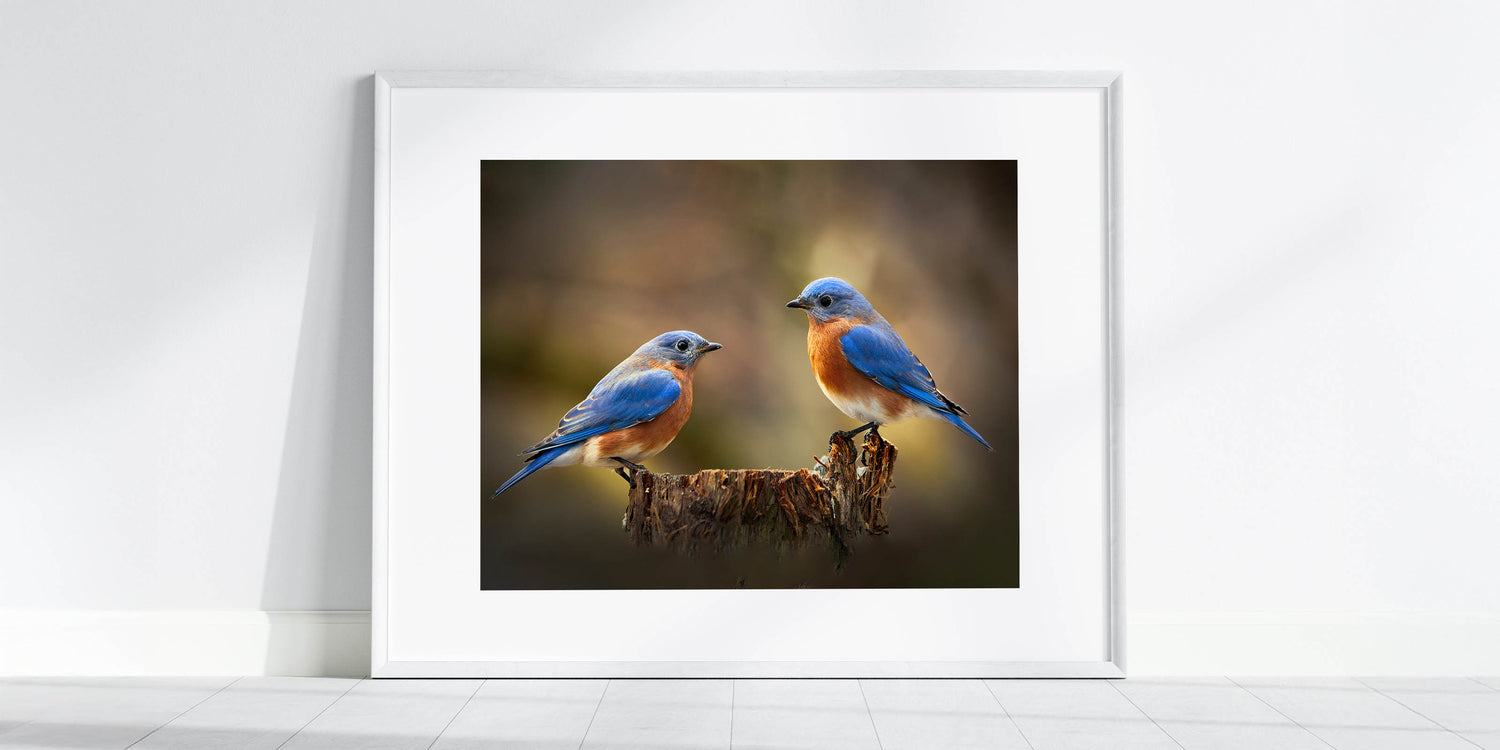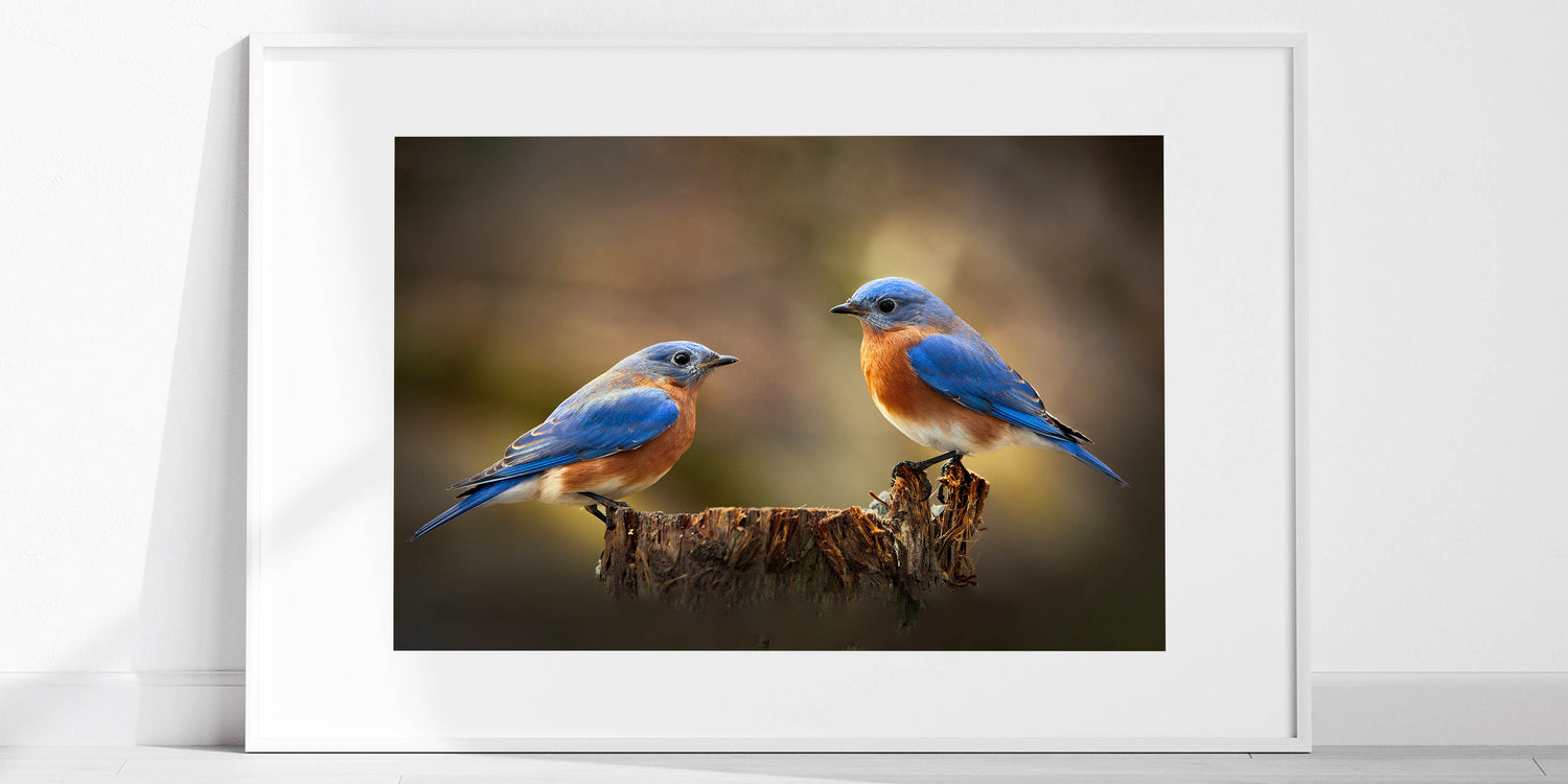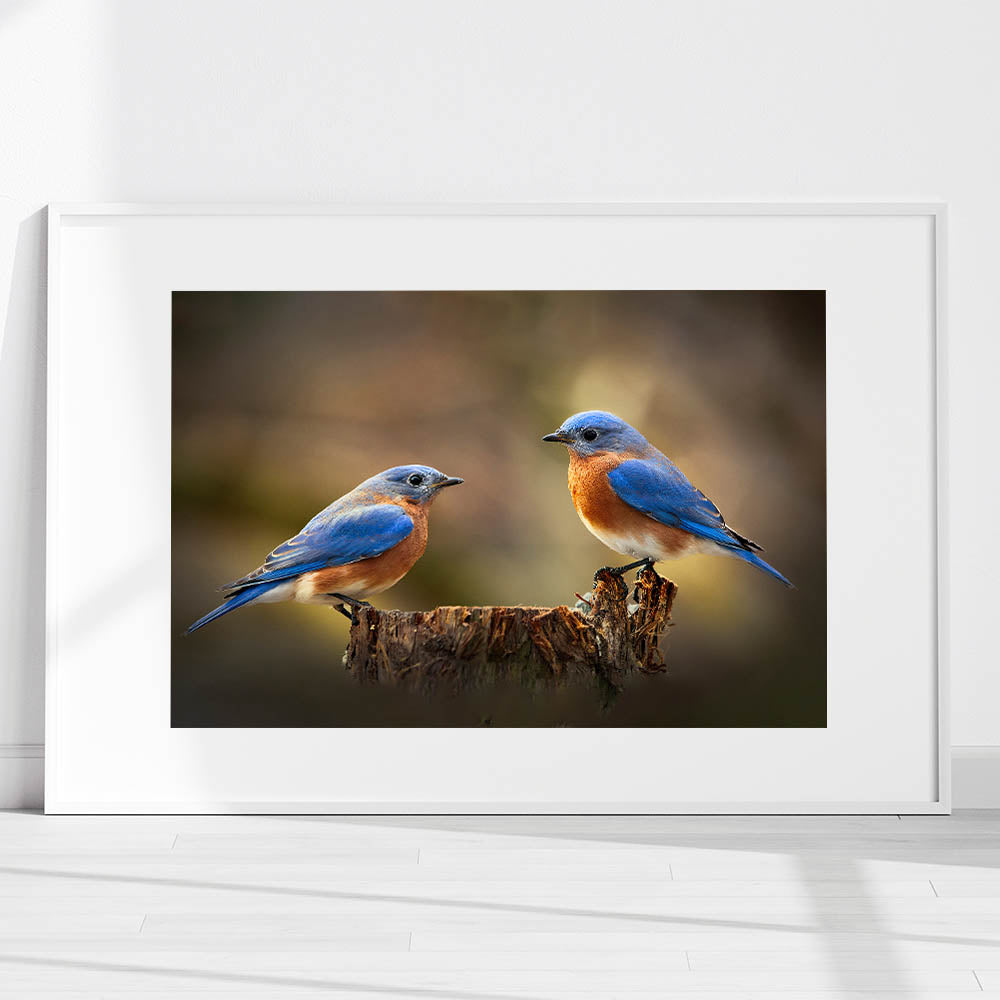 Enhance your space with the calming beauty of this Serene Garden Birds Wall Art. Featuring a stunning photograph of two bluebirds perched opposite each other, this artwork captures a peaceful moment in nature. The rich blue and warm rust tones of the birds contrast beautifully with the soft, blurred background, creating a harmonious and inviting scene that will add a touch of tranquility to any room.
