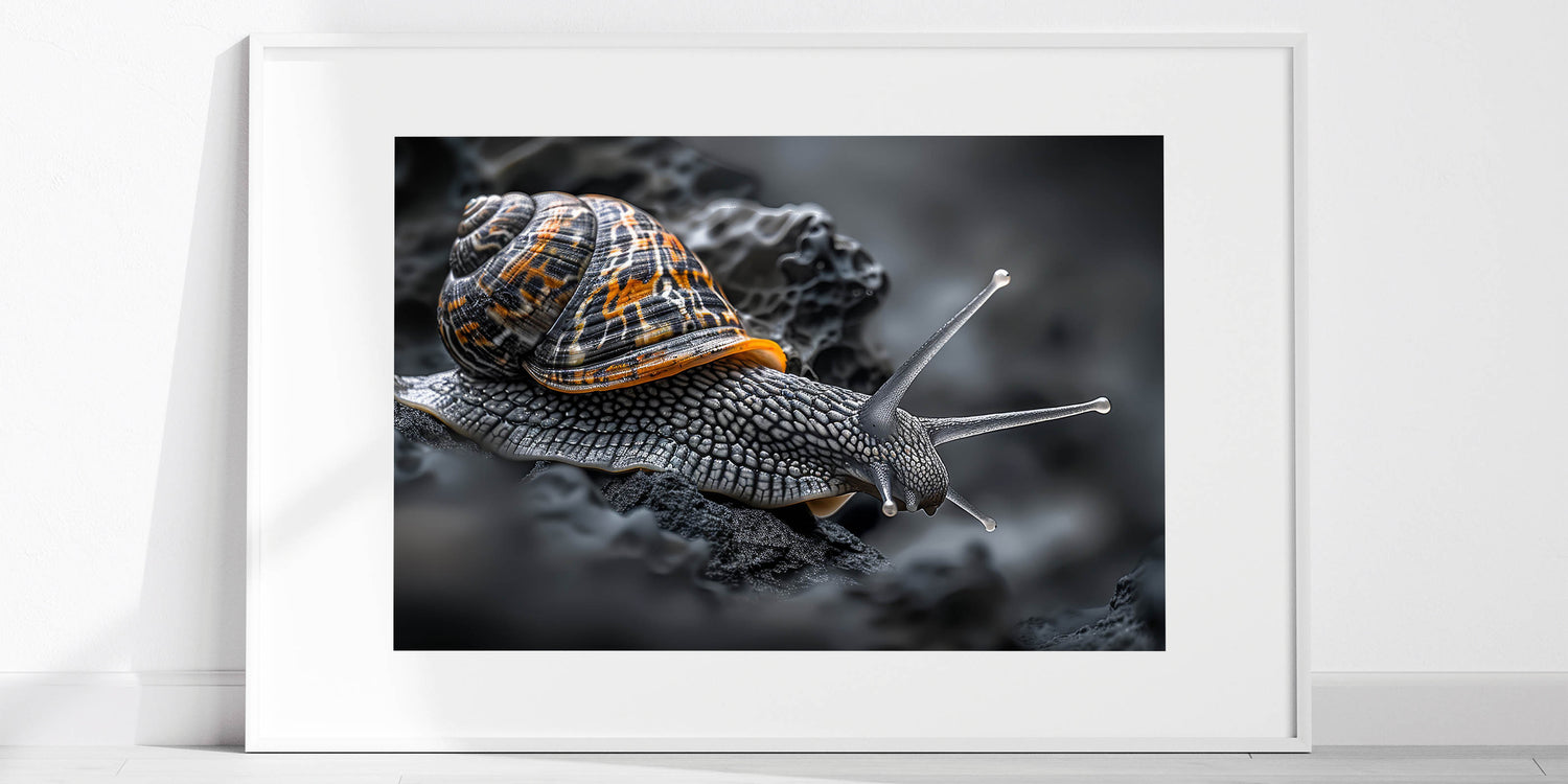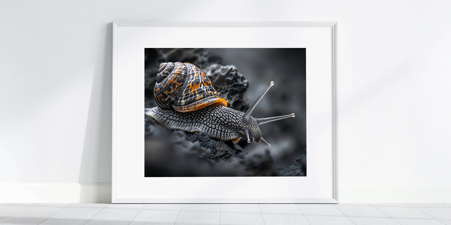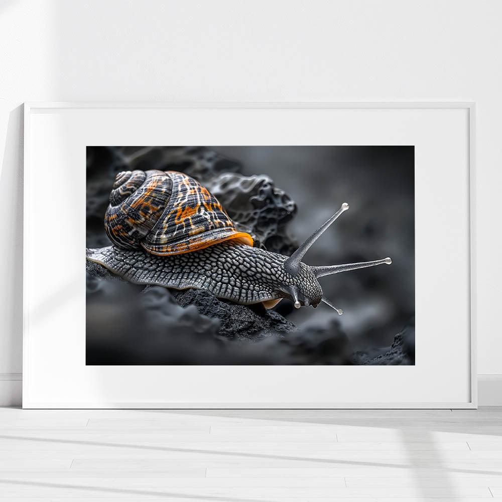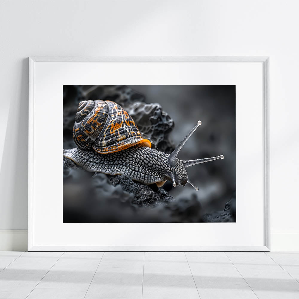 • Vivid Colors: The artwork showcases rich tones of black, gray, and orange, bringing the snail’s natural habitat to life.