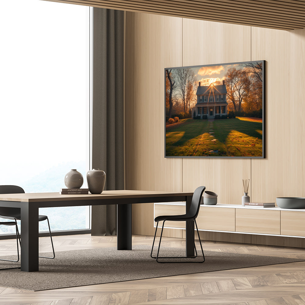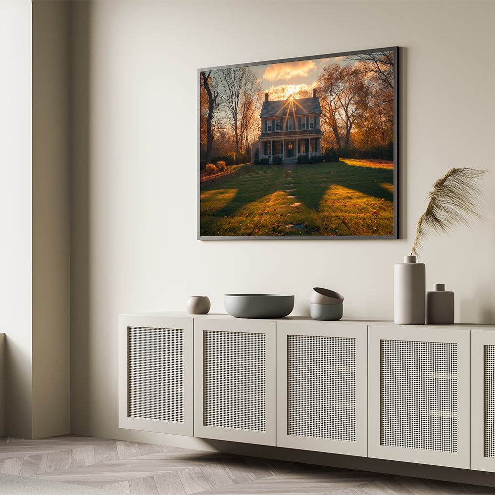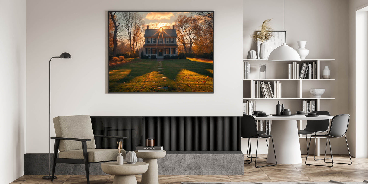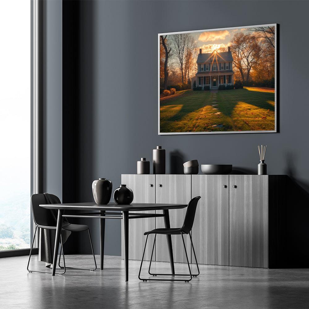 Transform your living space with the timeless beauty of this house wall art. Capturing a classic home bathed in the golden rays of the setting sun, this artwork radiates warmth and tranquility. The sunlit scene, with its well-manicured lawn and majestic trees, evokes a sense of peace and nostalgia, making it a perfect addition to any room in need of a serene and elegant touch.