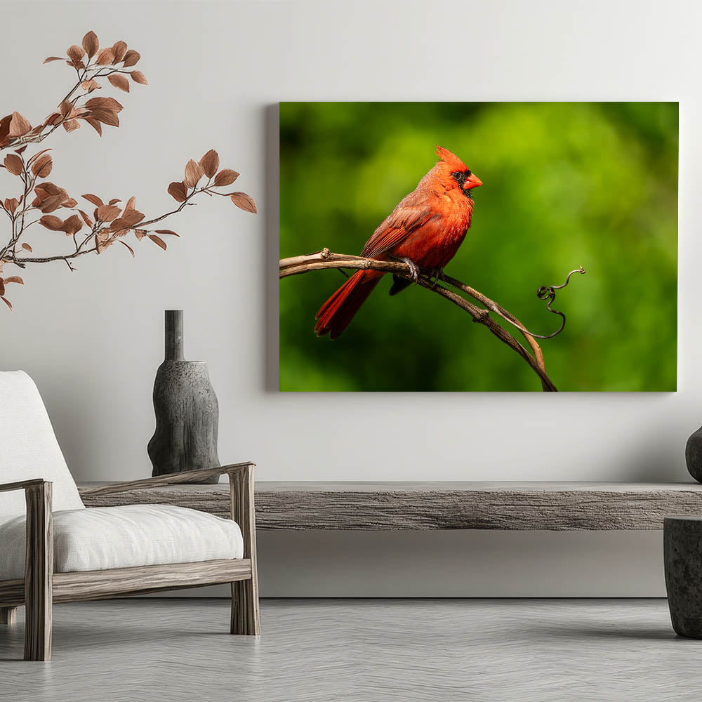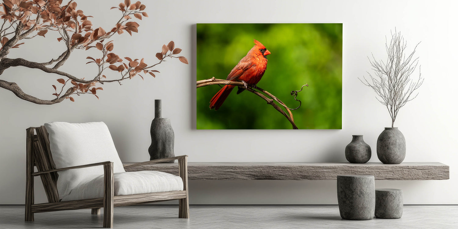 Add a touch of nature's elegance to your home with this Vibrant Cardinal Wall Art. This captivating artwork features a striking male cardinal perched gracefully on a twisted vine, set against a lush green background. The vivid red of the cardinal contrasts beautifully with the natural greens, making this piece a stunning focal point for any room.