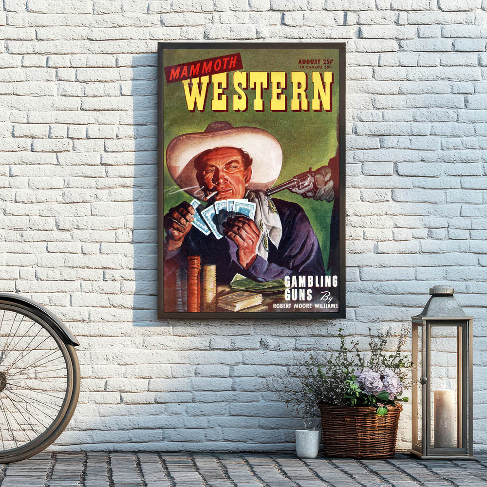 This Vintage Magazine Cover Wall Art showcases a thrilling Mammoth Western Magazine cover, capturing the high-stakes world of saloons, poker, and gunslingers. The intense illustration features a cowboy deep in a poker game, unaware of the revolver pointed at him, making this classic magazine cover artwork a bold and dramatic statement piece. This iconic magazine cover reproduction is a must-have for collectors and fans of retro prints for home decor who love Western-themed art.