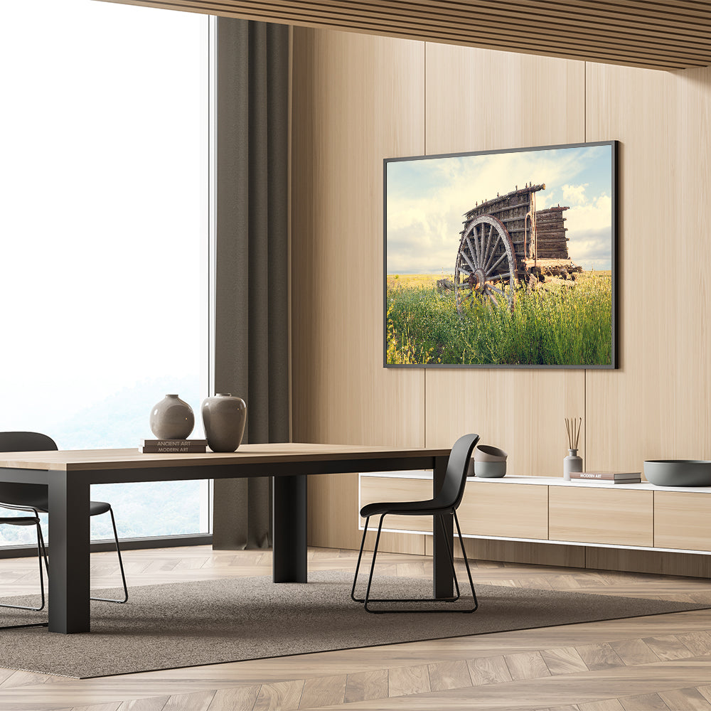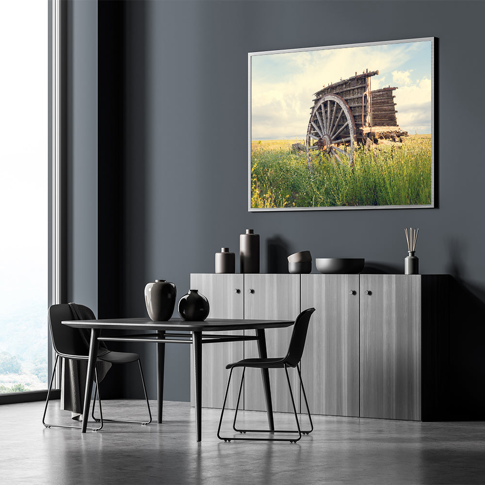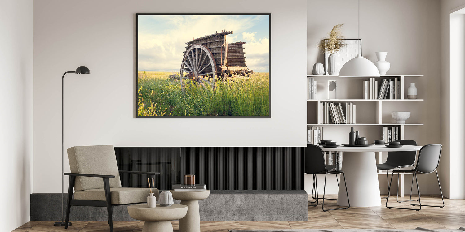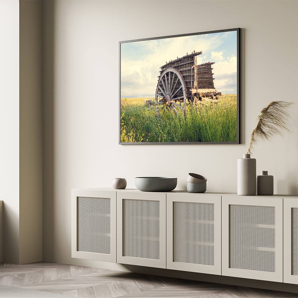 - High-resolution printing that brings out the intricate details of the wagon, the texture of the wood, and the softness of the surrounding grass.