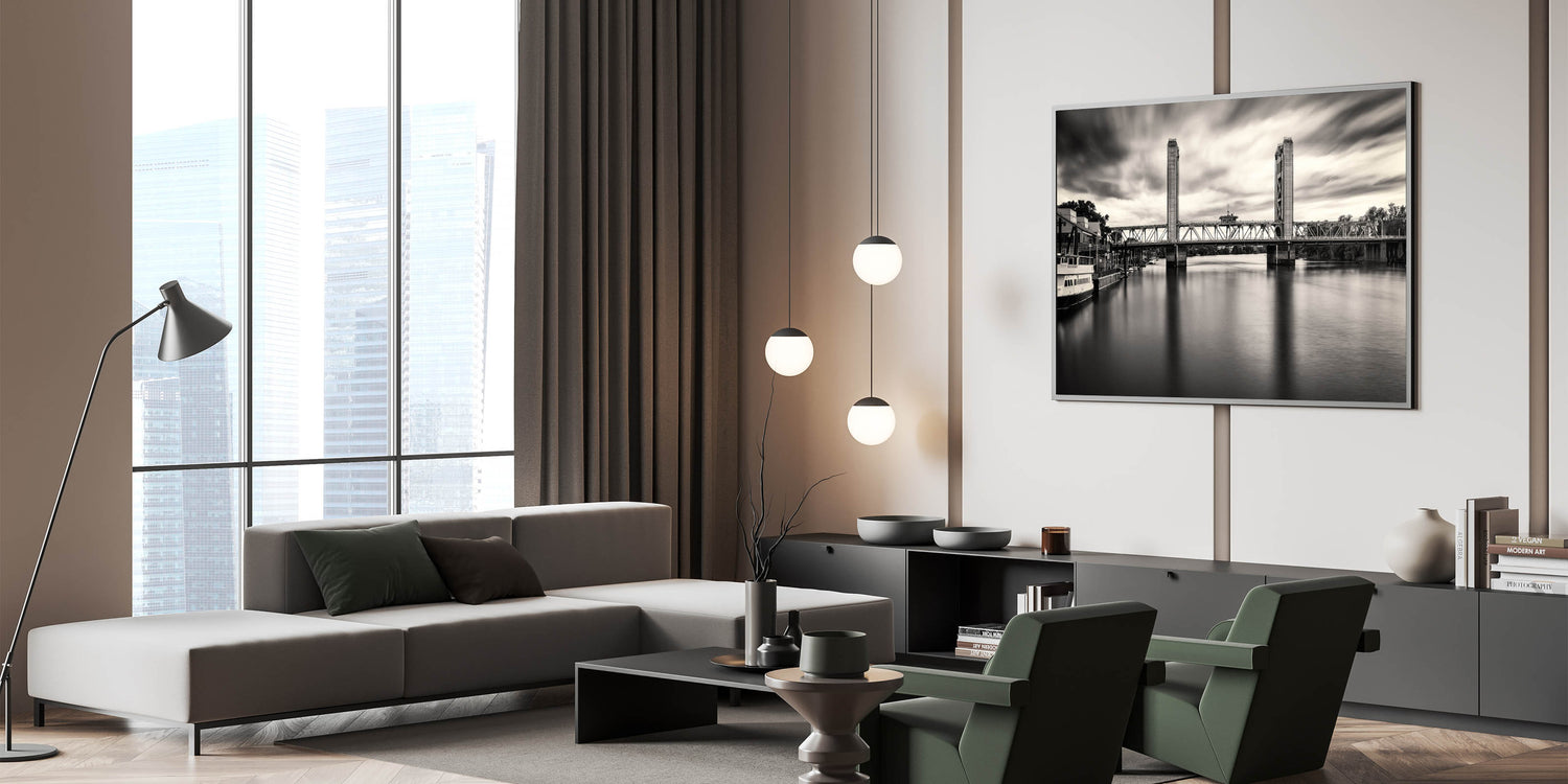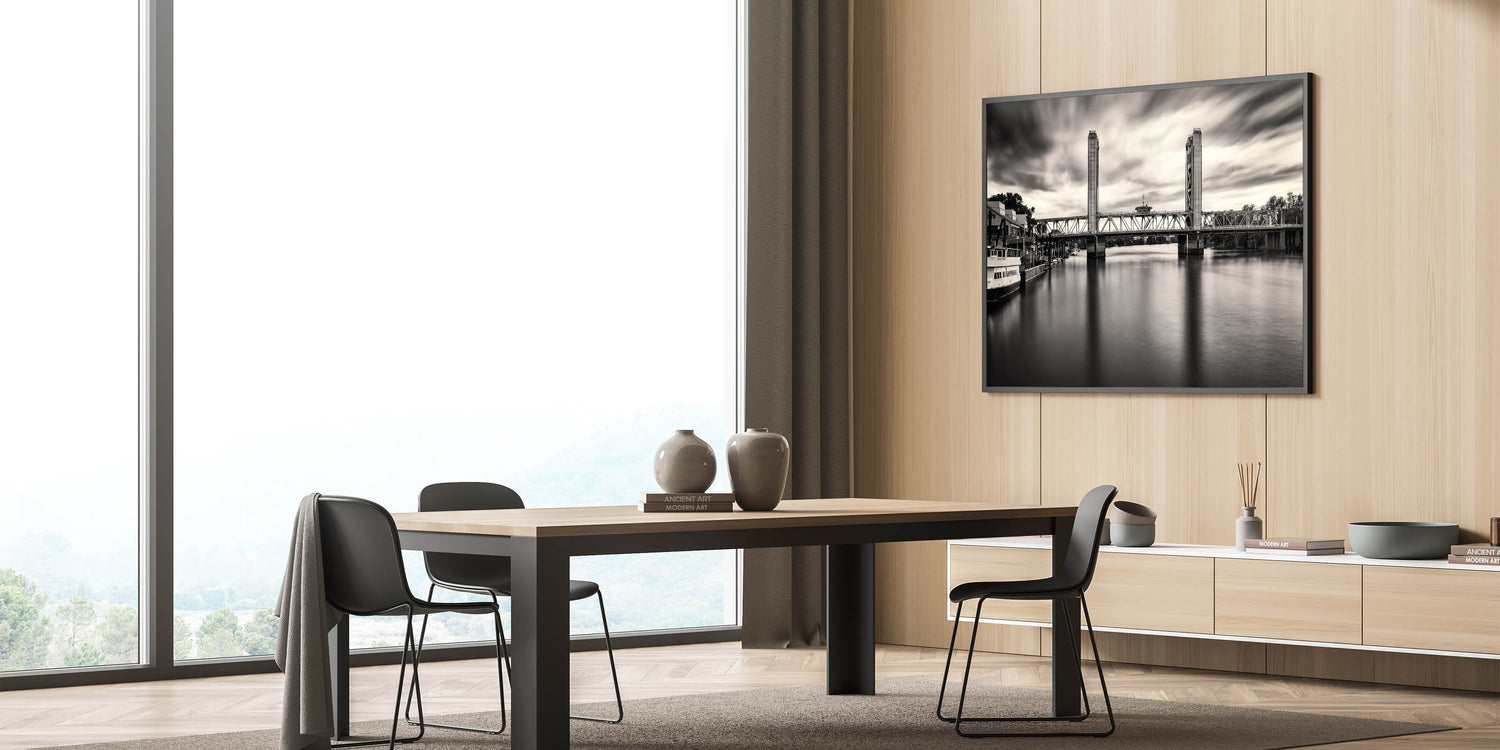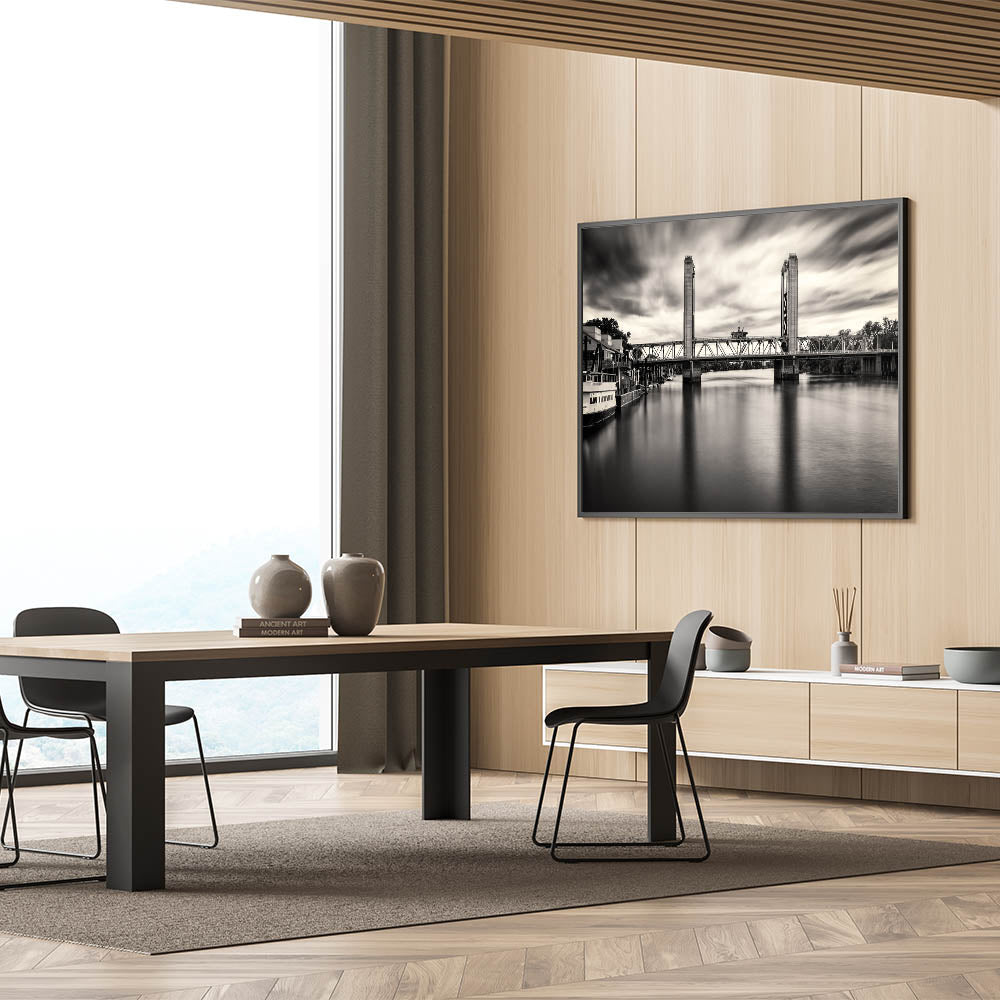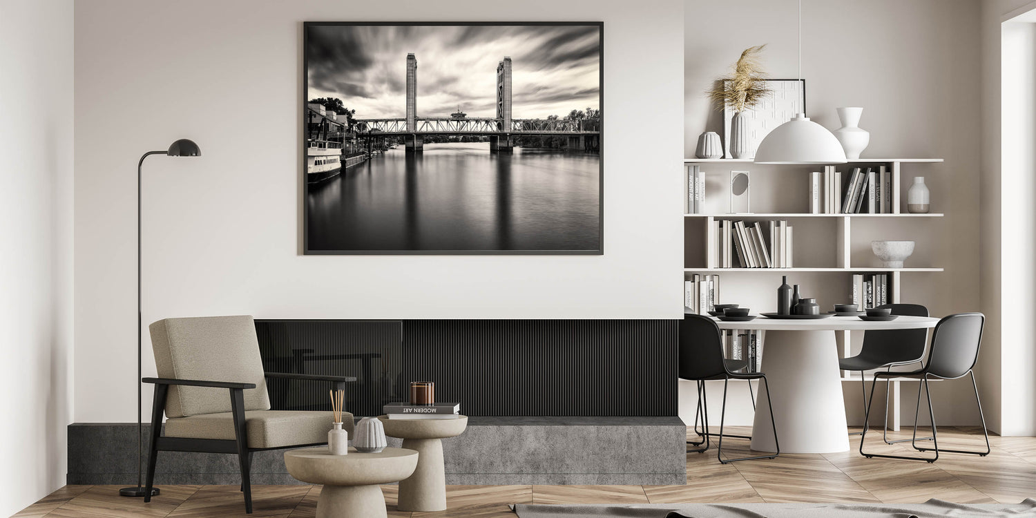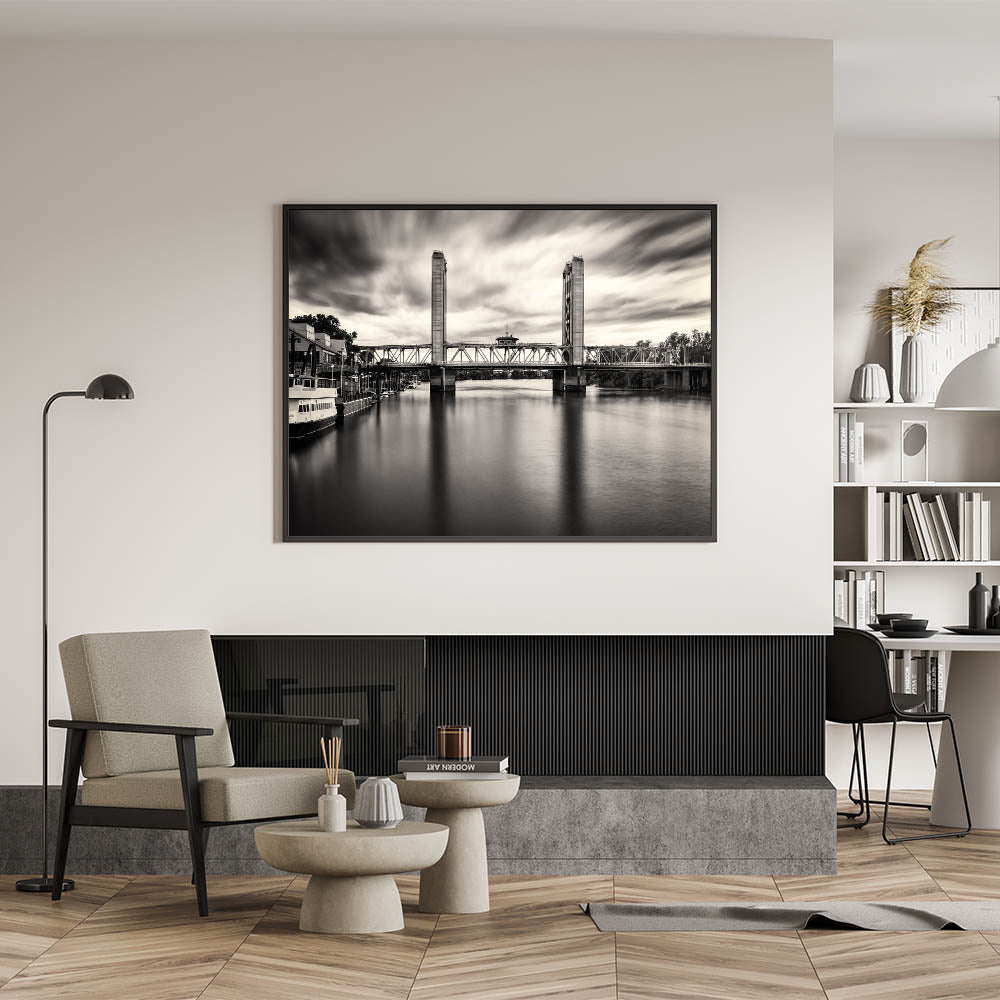 Elevate your decor with this stunning black-and-white wall art of Sacramento’s iconic Tower Bridge. The smooth water, combined with the dramatic sky, creates a serene yet powerful image, showcasing the architectural beauty of the bridge in timeless monochrome. This piece exudes sophistication, making it perfect for those who appreciate classic, minimalist art.