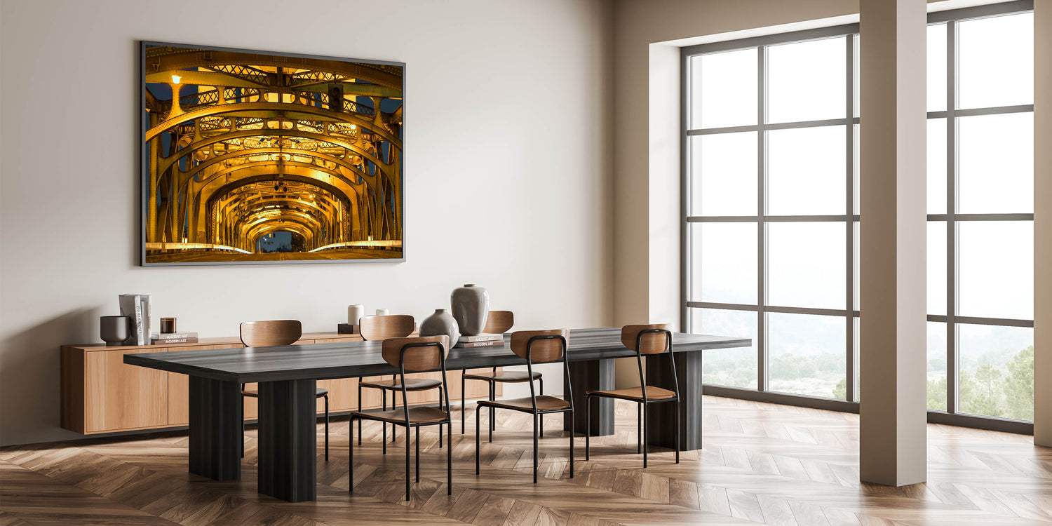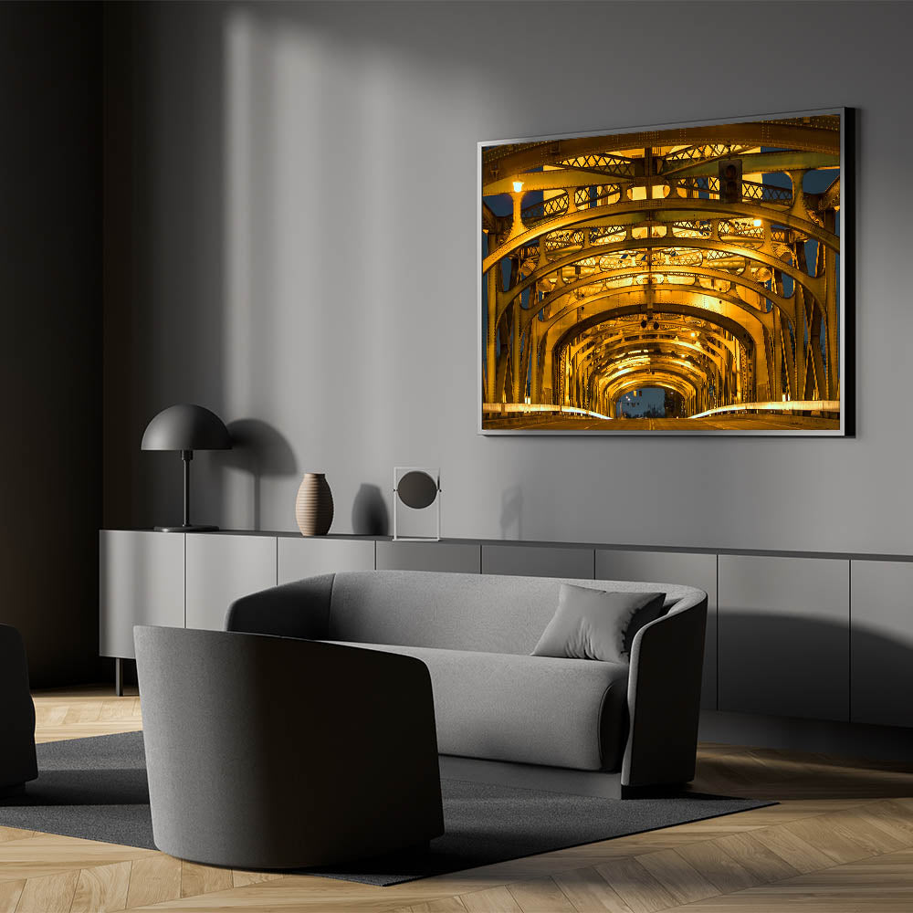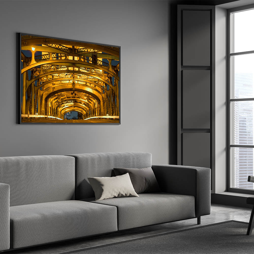 Bring the architectural beauty of Sacramento’s Tower Bridge into your space with this stunning close-up view of its illuminated structure. The golden glow of the bridge’s intricate steel framework creates a visually captivating composition that blends industrial design with urban elegance. This Sacramento cityscape art captures the iconic bridge in a unique and modern way, making it perfect for adding sophistication to any decor.
