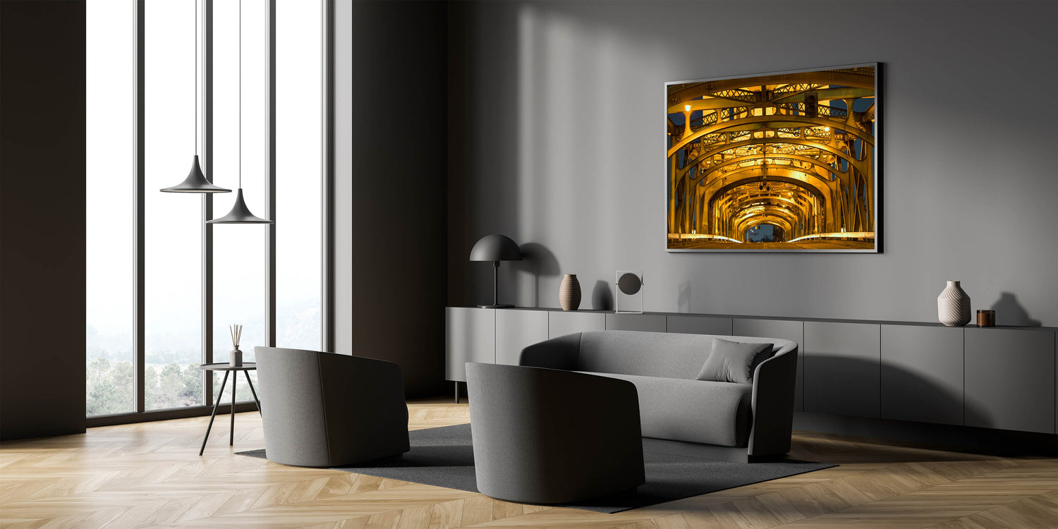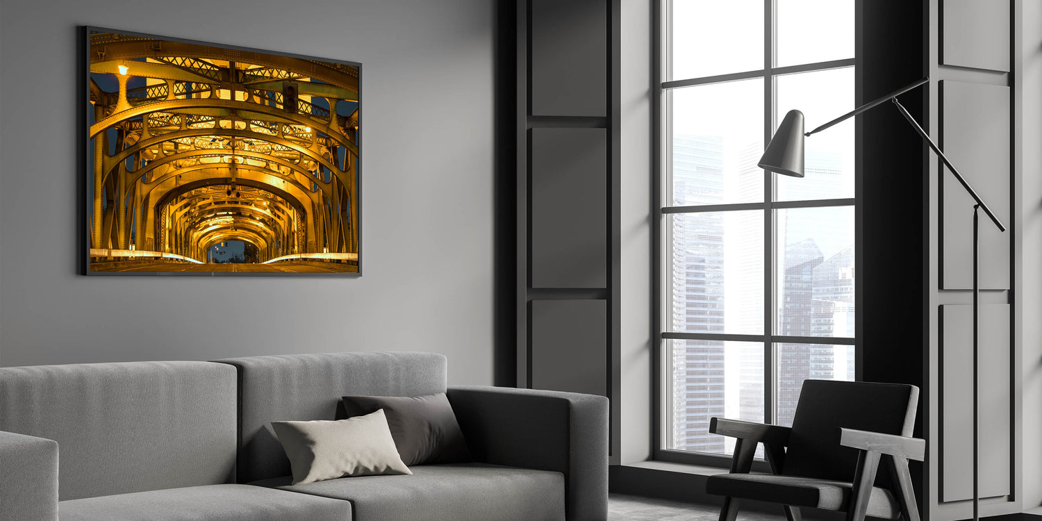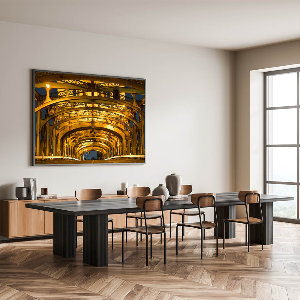 Bring the architectural beauty of Sacramento’s Tower Bridge into your space with this stunning close-up view of its illuminated structure. The golden glow of the bridge’s intricate steel framework creates a visually captivating composition that blends industrial design with urban elegance. This Sacramento cityscape art captures the iconic bridge in a unique and modern way, making it perfect for adding sophistication to any decor.