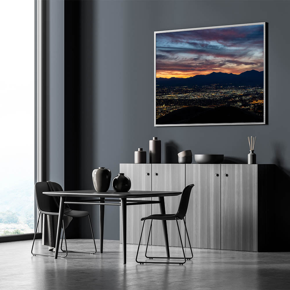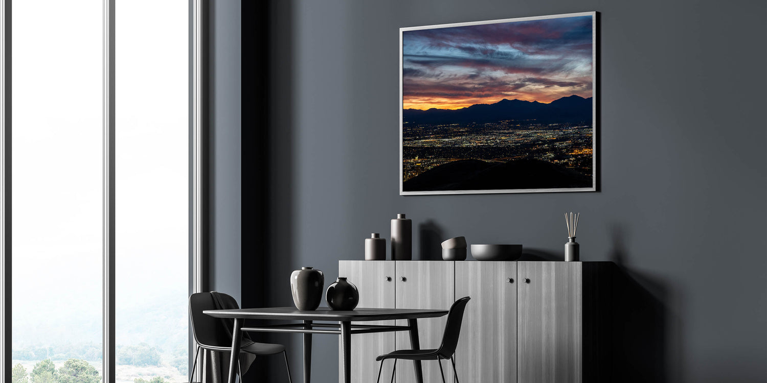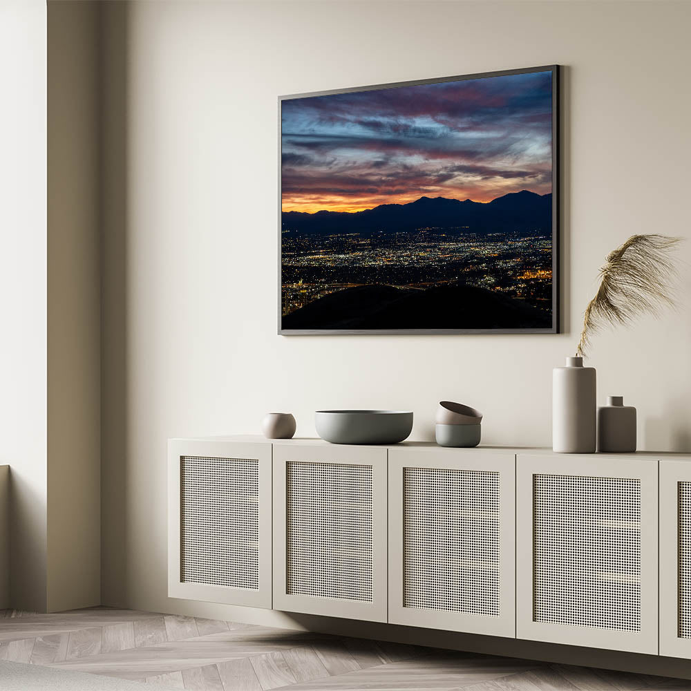 Transform your living space with this unique piece of Salt Lake City wall decor. The fusion of bright sunset hues and twinkling city lights brings warmth and elegance to any room. Whether you’re a fan of urban landscapes or serene sunsets, this high-quality Utah nature photography print will be a striking addition to your art collection.