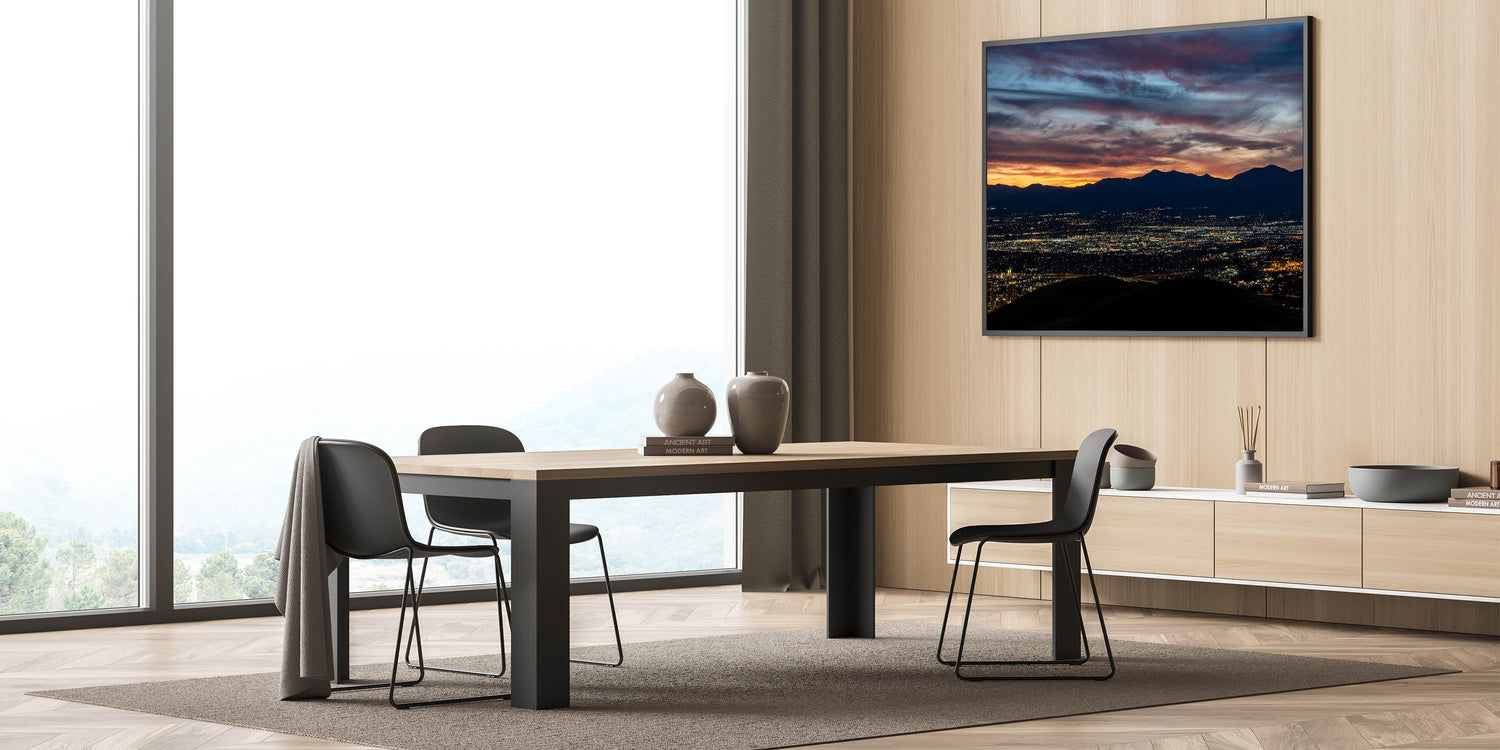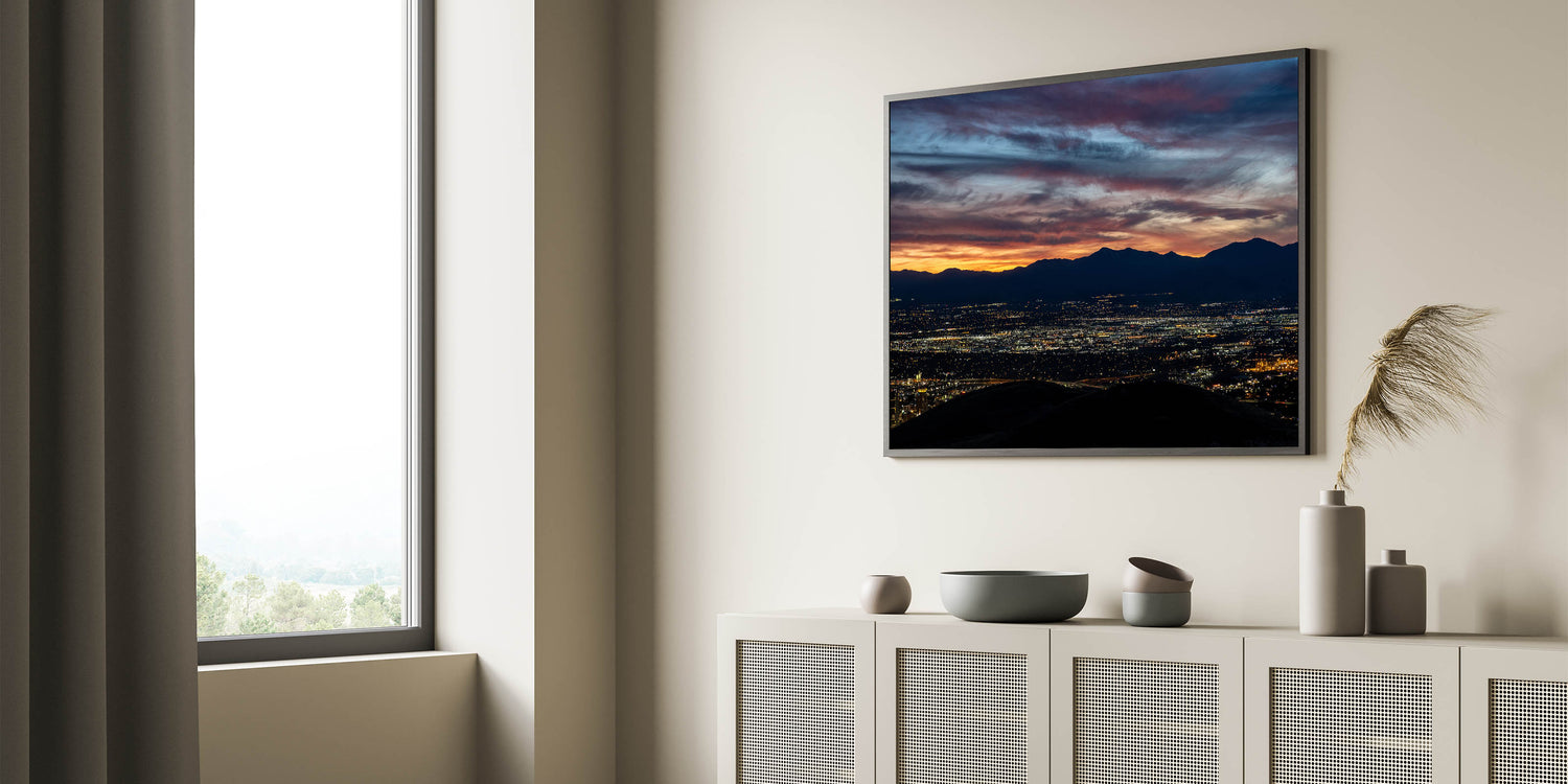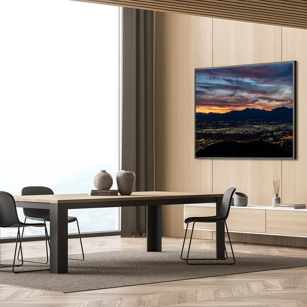 Transform your living space with this unique piece of Salt Lake City wall decor. The fusion of bright sunset hues and twinkling city lights brings warmth and elegance to any room. Whether you’re a fan of urban landscapes or serene sunsets, this high-quality Utah nature photography print will be a striking addition to your art collection.