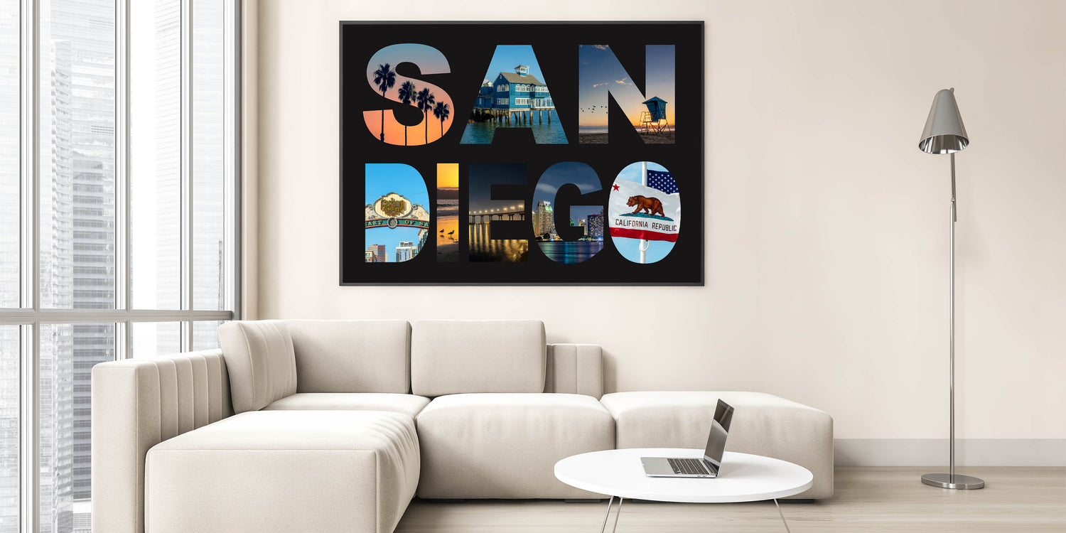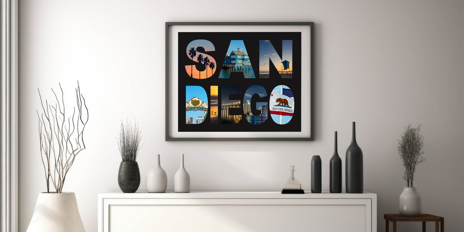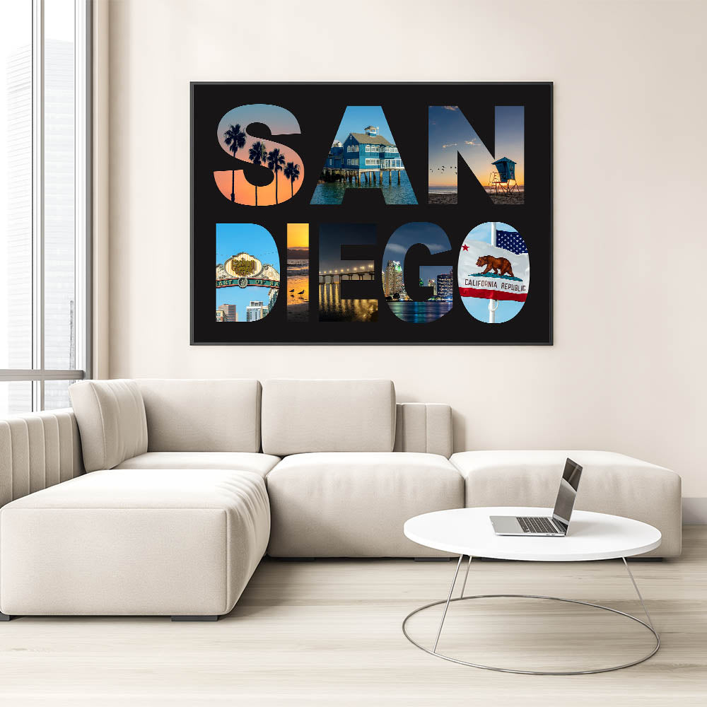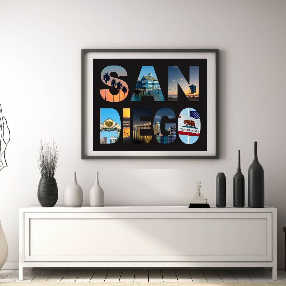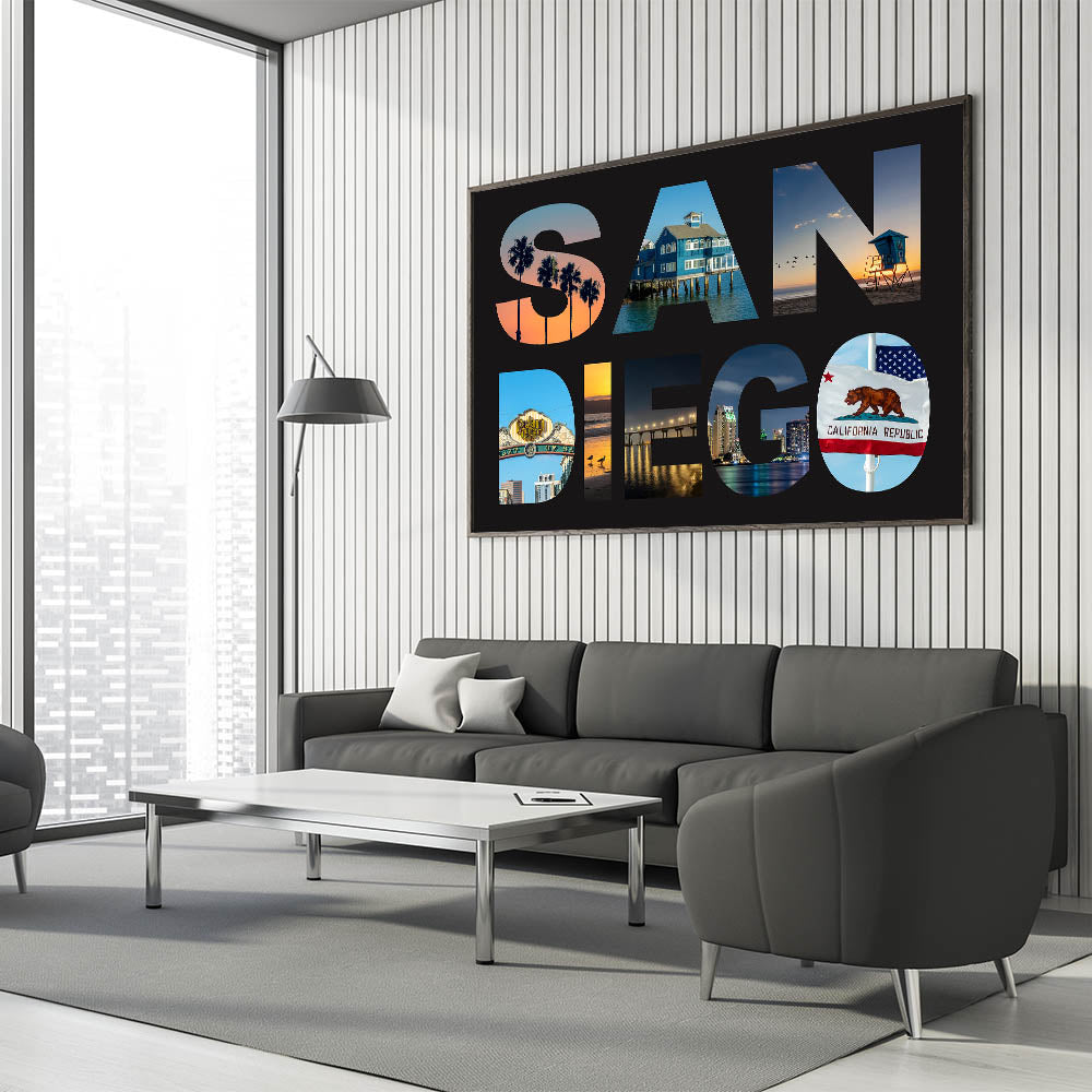 Celebrate the essence of San Diego with this striking collage wall art, part of our San Diego in Scenery by Region collection. This design creatively uses bold lettering filled with images of San Diego’s most iconic sights, including sunsets, palm trees, and beloved city landmarks. Perfect for San Diego enthusiasts or anyone who appreciates California’s coastal charm, this artwork adds a lively and unique touch to any decor.