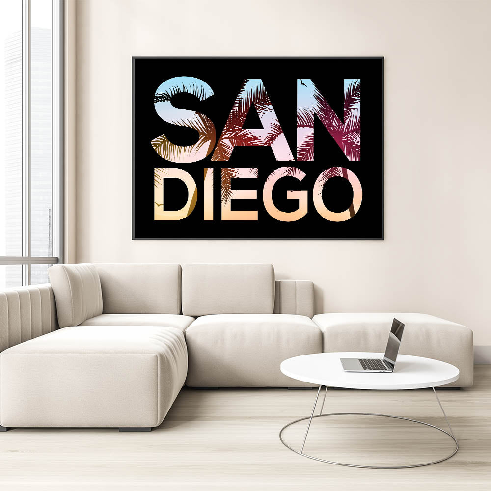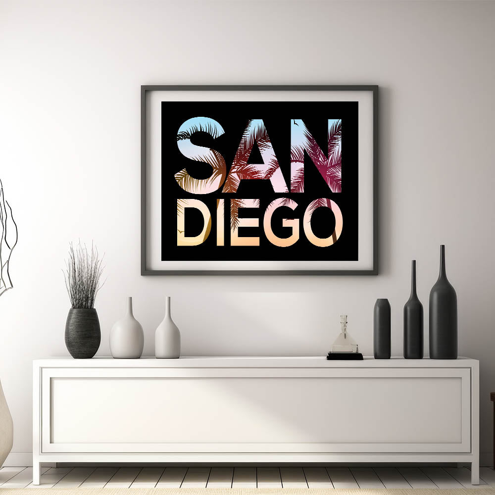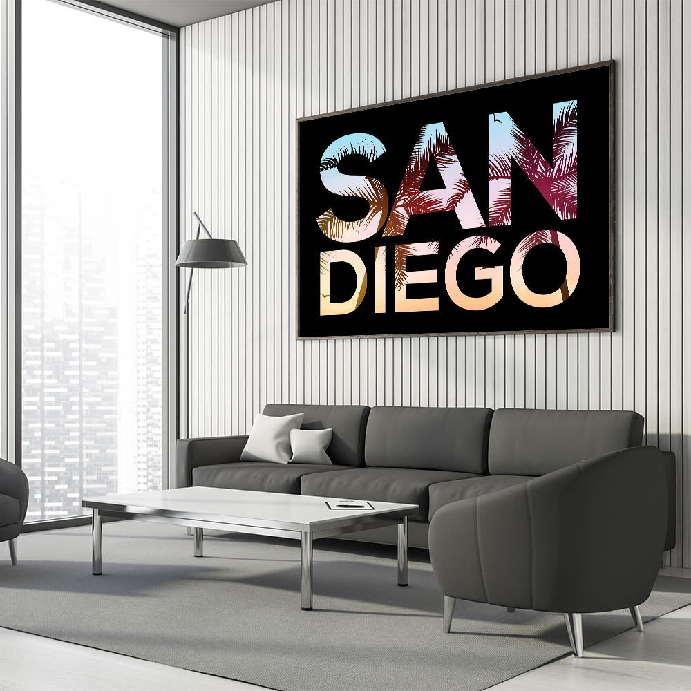 Add a contemporary touch to your decor with this San Diego typography art. The tropical elements and modern design make it a perfect statement piece for any coastal or urban-themed room.