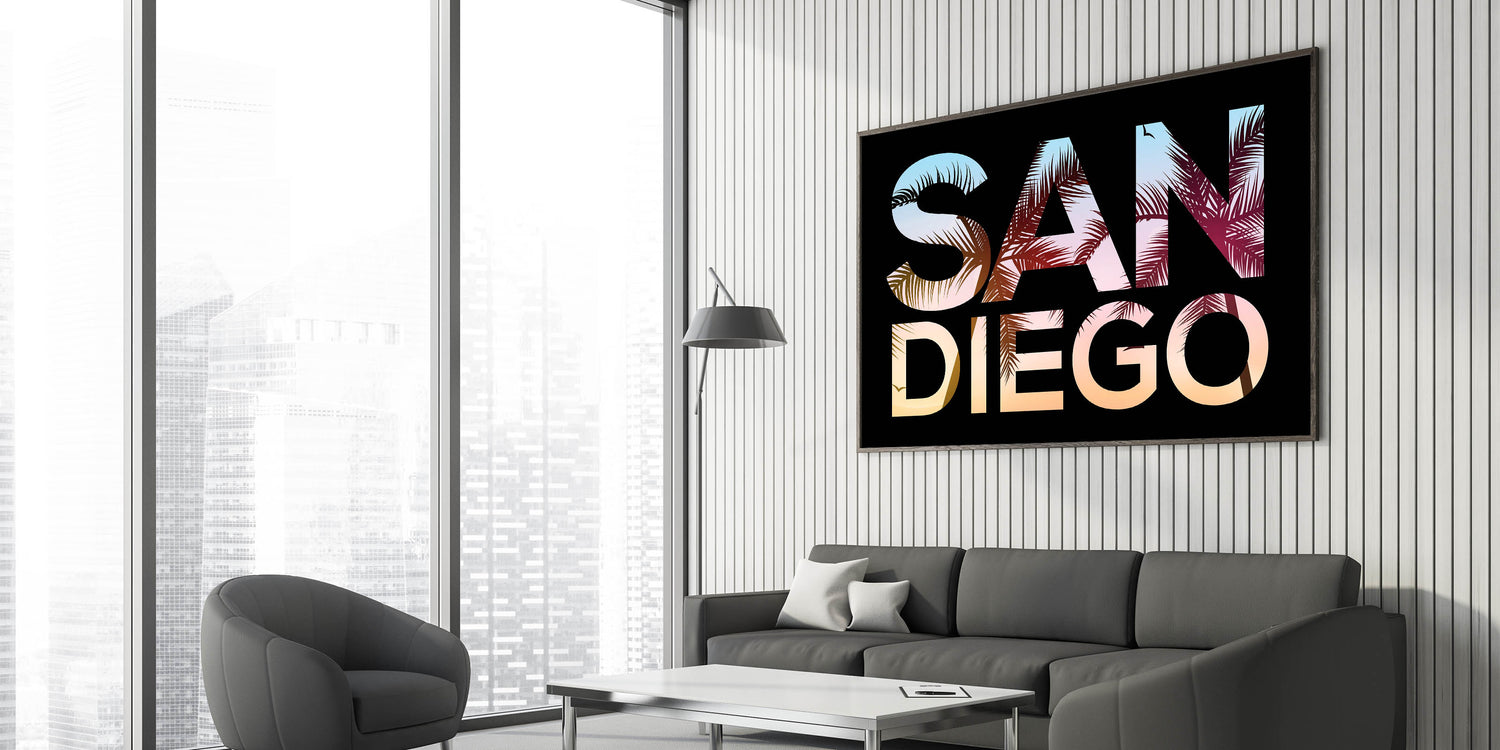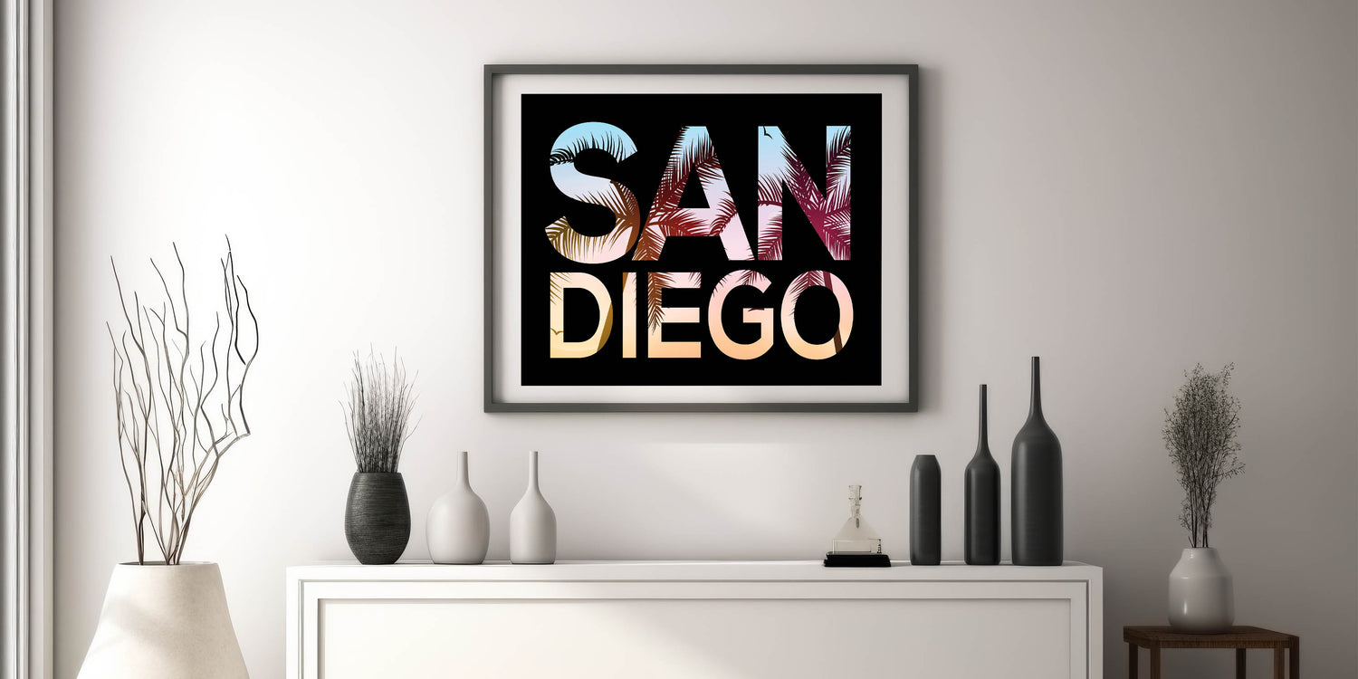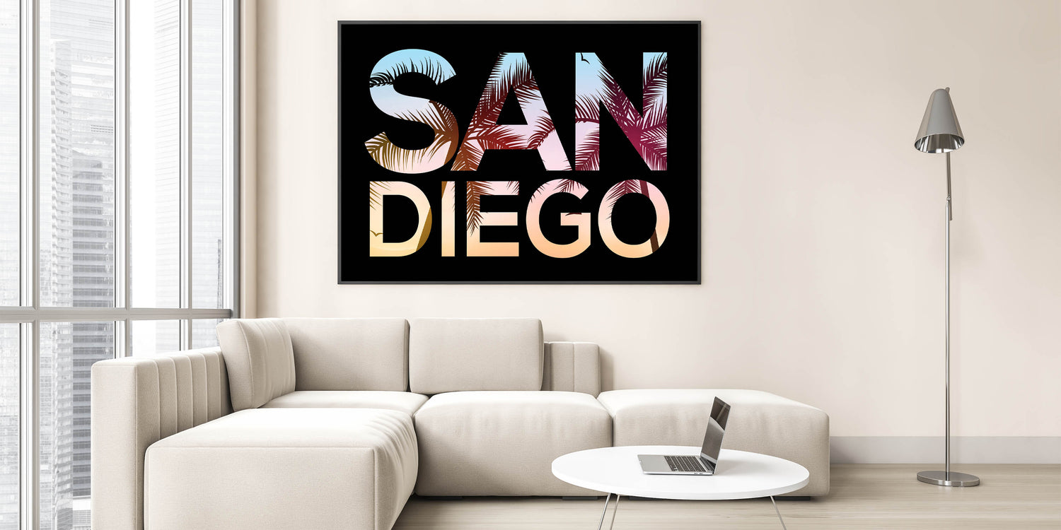 Add a contemporary touch to your decor with this San Diego typography art. The tropical elements and modern design make it a perfect statement piece for any coastal or urban-themed room.