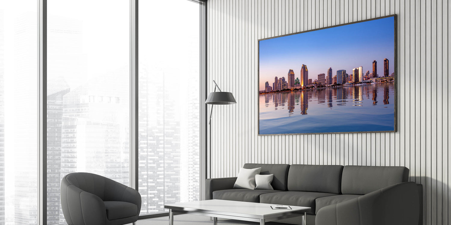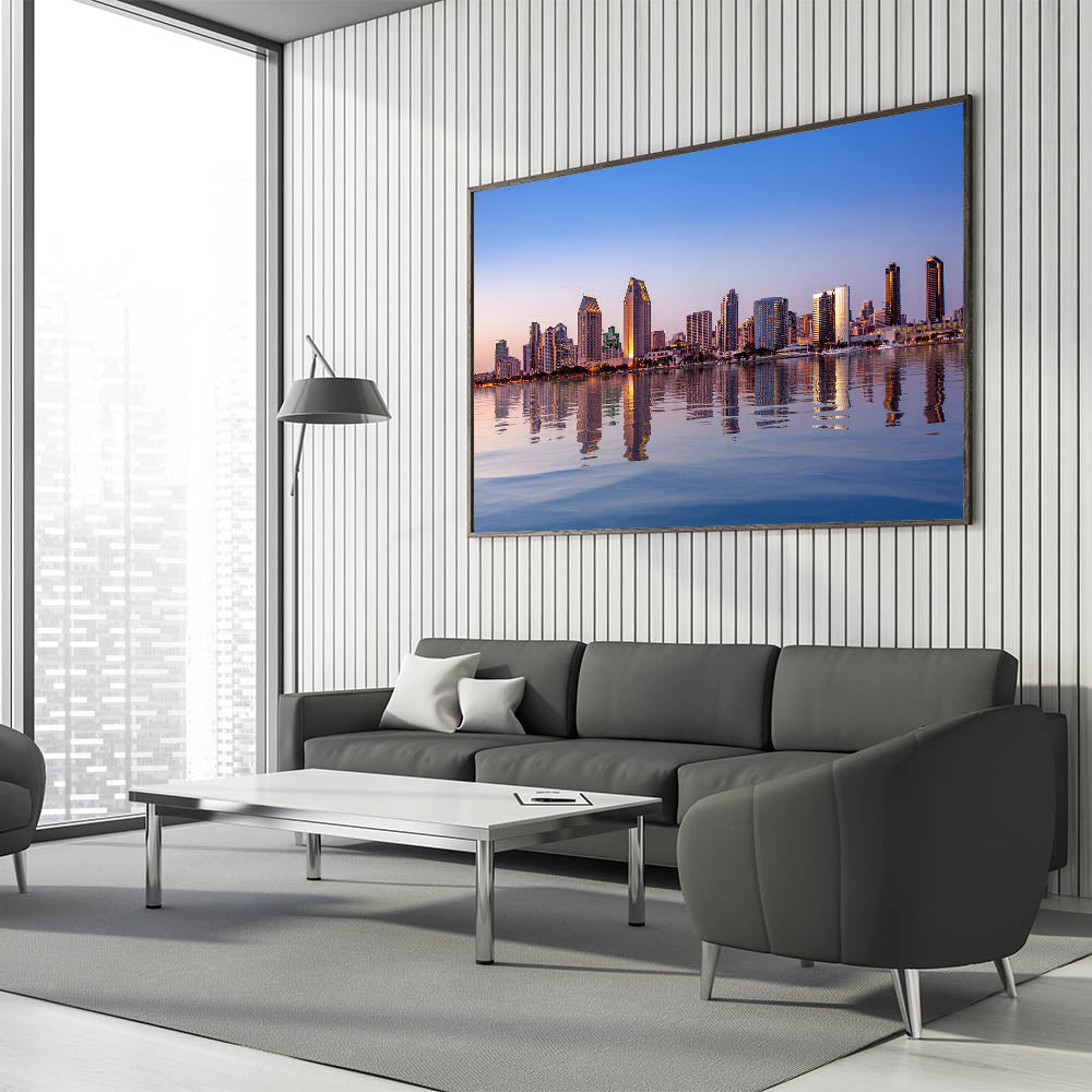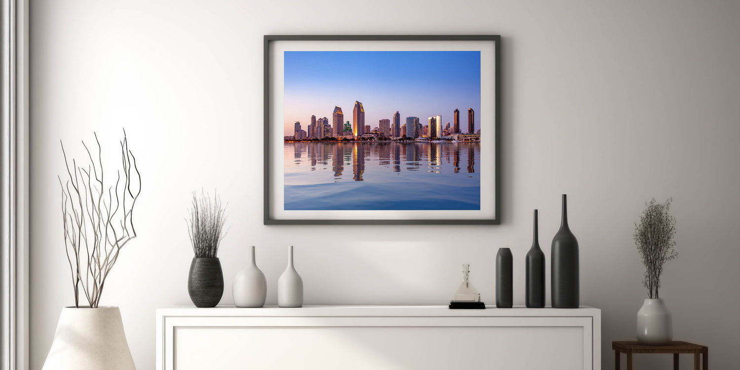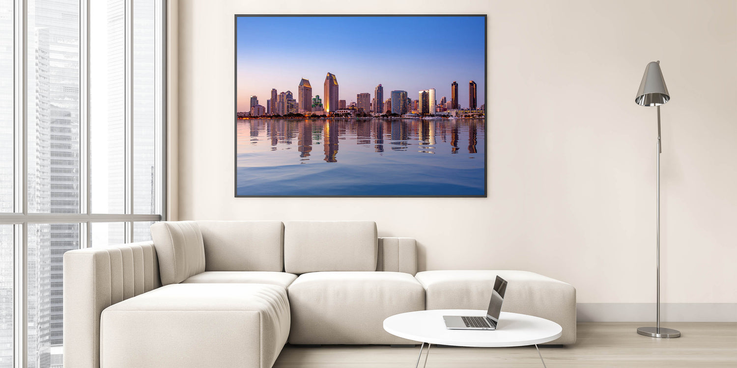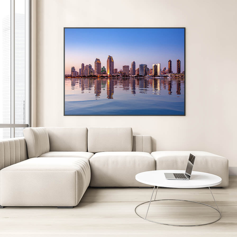 Enhance your decor with this serene view of San Diego’s skyline at dusk. The soft colors and calm water reflections create a peaceful ambiance, making it a perfect addition to any contemporary or coastal-themed space.