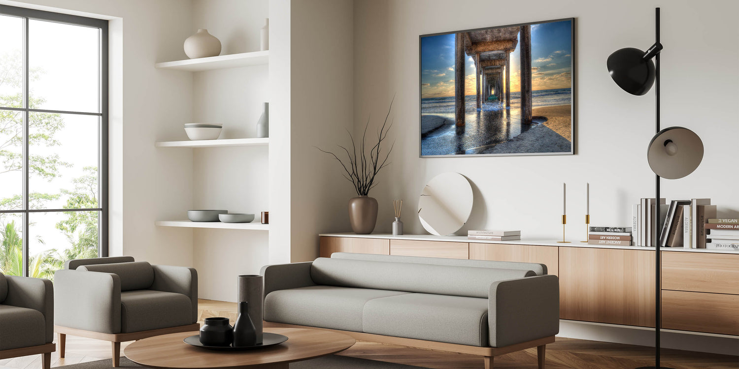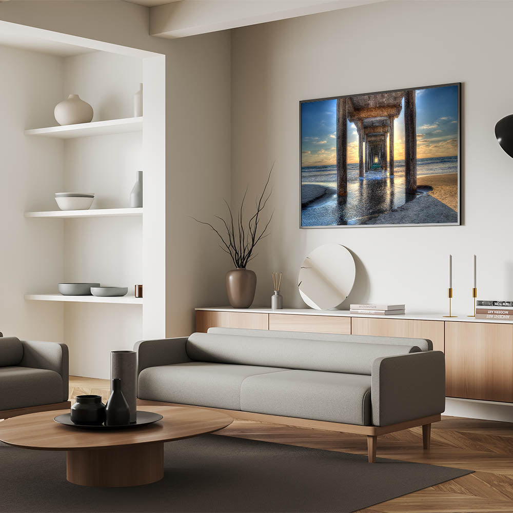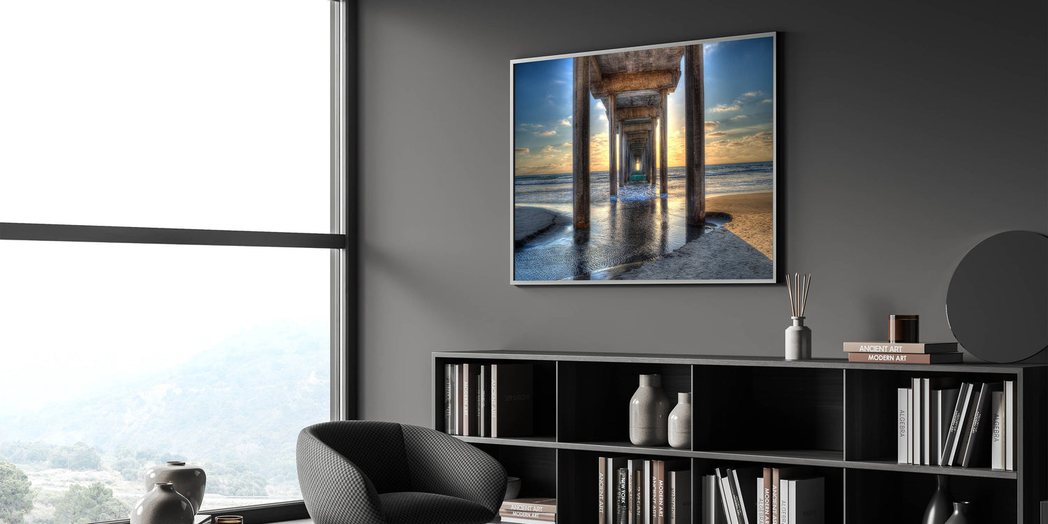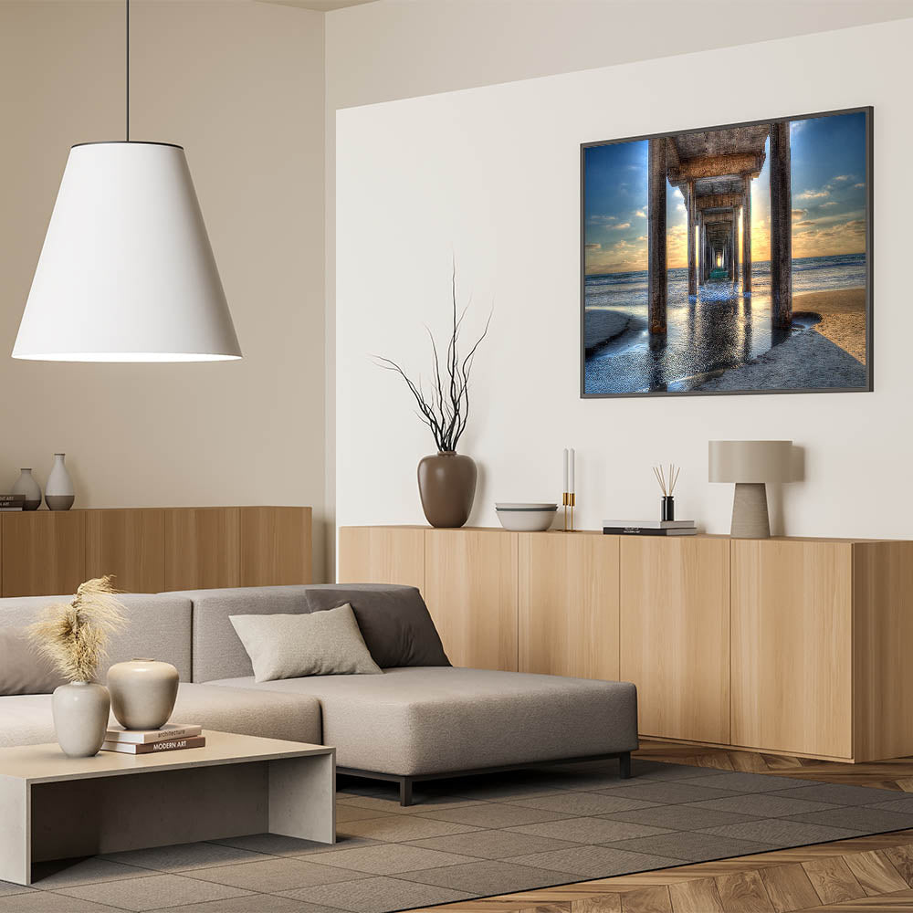 Enhance your space with this peaceful view of the San Diego shoreline, seen from beneath a pier at sunset. This artwork brings a unique perspective and a calming vibe, making it a perfect addition to any coastal-themed decor.