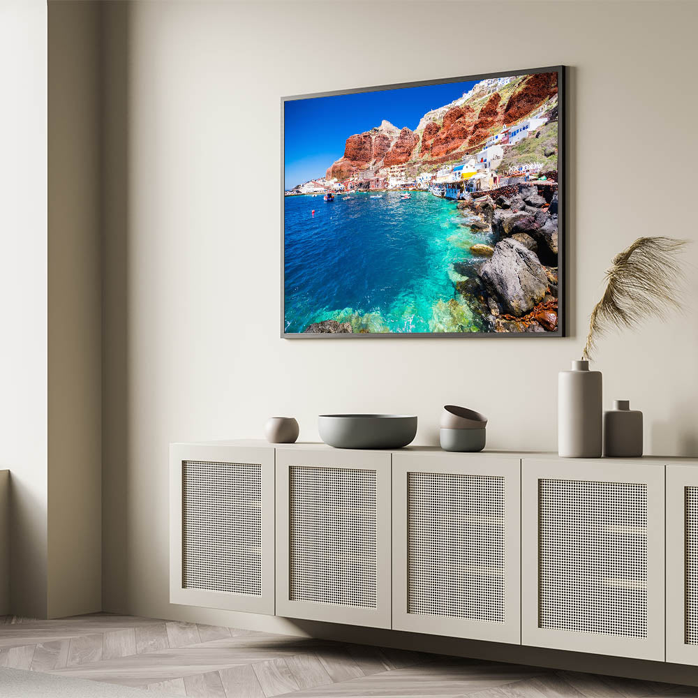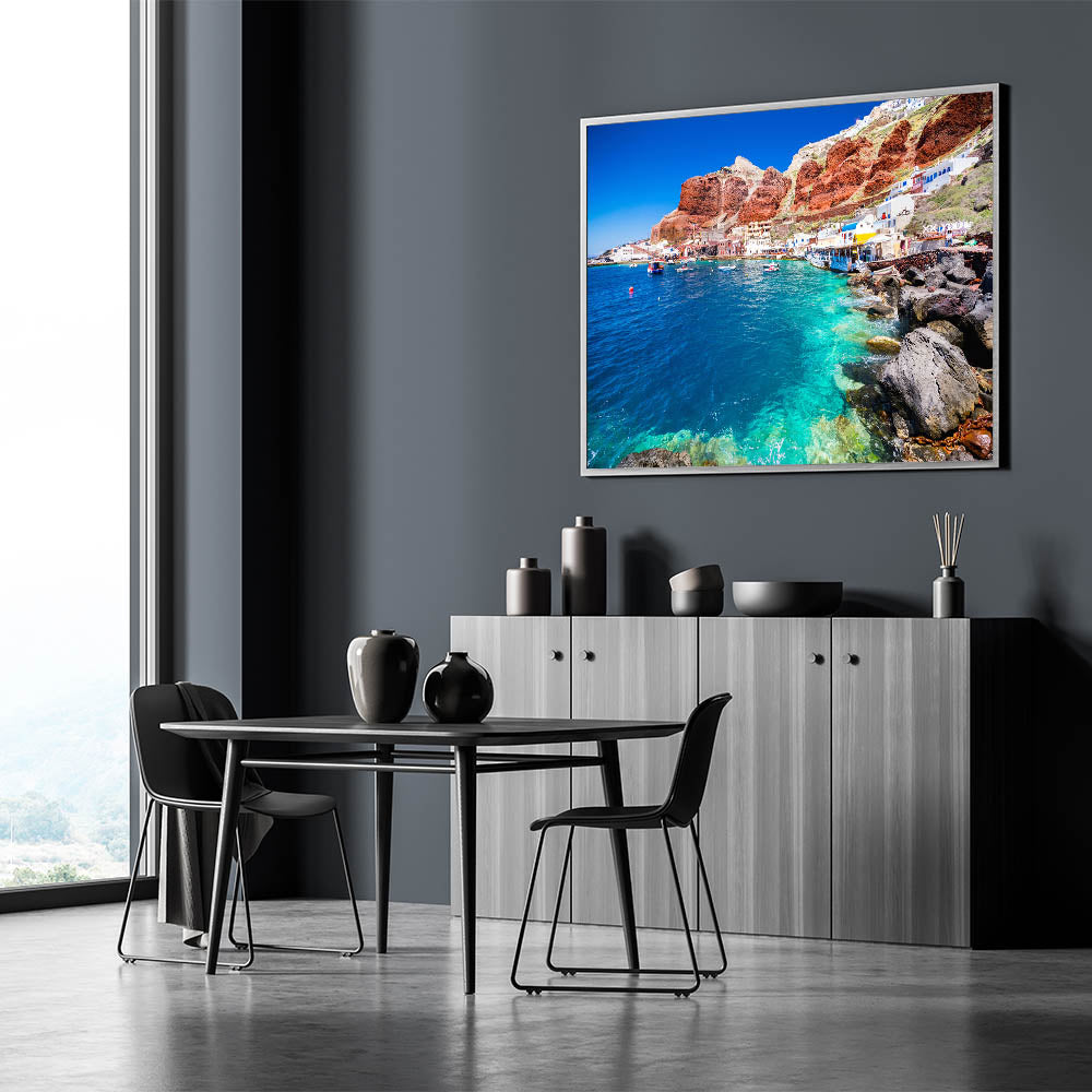 Discover the vibrant charm of Santorini with this captivating Santorini wall art, showcasing a colorful coastal village set against the crystal-clear waters of the Aegean Sea. This piece of Greece landscape art brings the energy and beauty of the island’s rugged coastline into your home. The rich hues of the red cliffs and turquoise waters create a dynamic and eye-catching display, making this Greek island artwork a perfect addition to any room seeking a Mediterranean flair.