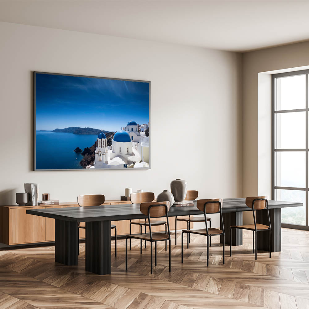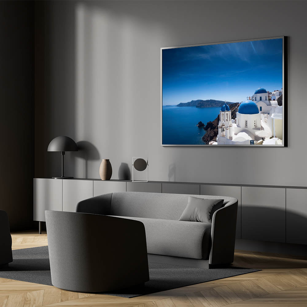 This Scenic Santorini print will enhance any space with its captivating view and timeless beauty. Its peaceful, coastal vibe makes it a great choice for anyone looking to bring the serenity of the Greek islands into their home.