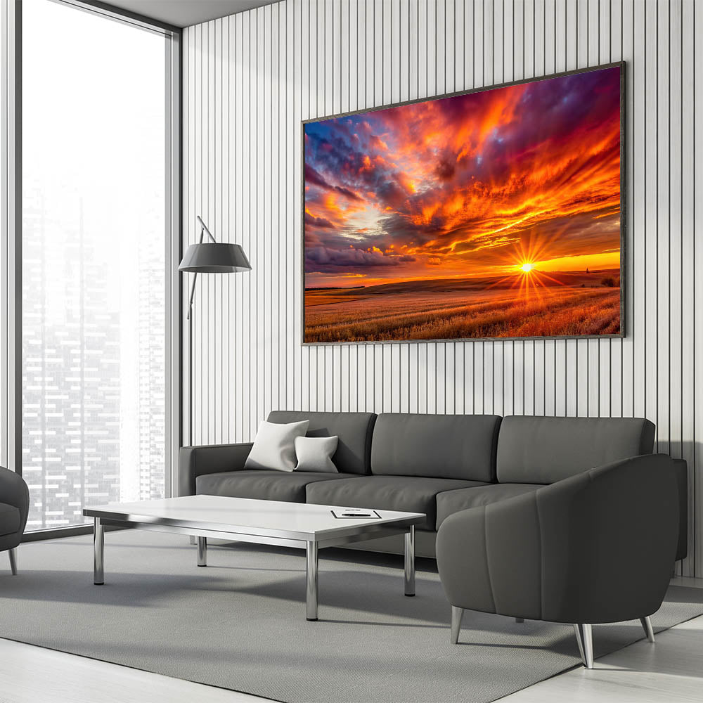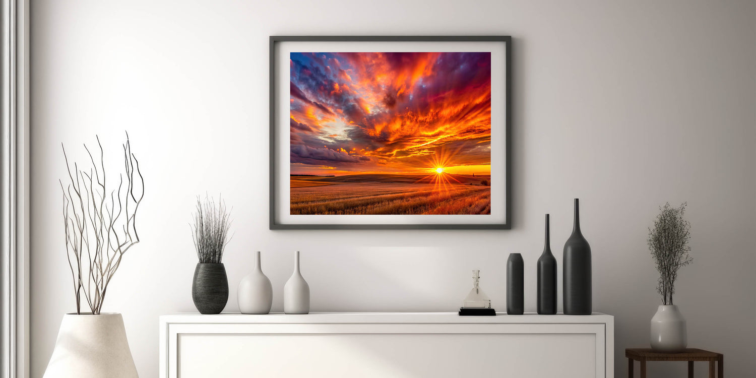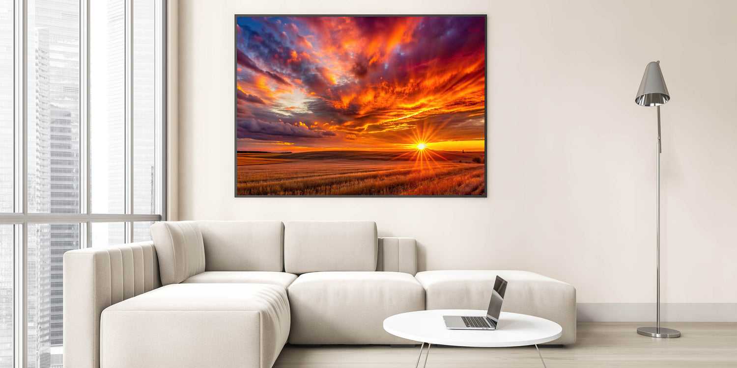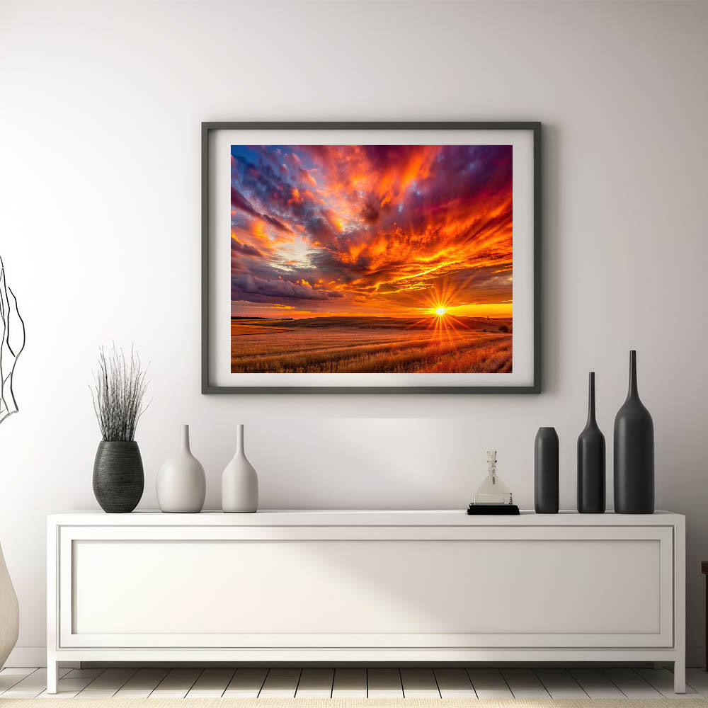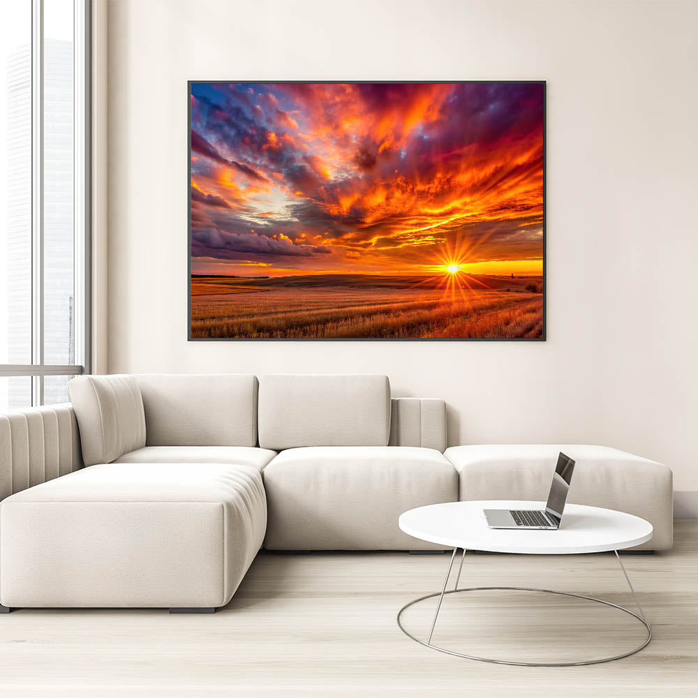 - High-quality Saskatchewan prints showcasing a fiery prairie sunset in vivid colors.