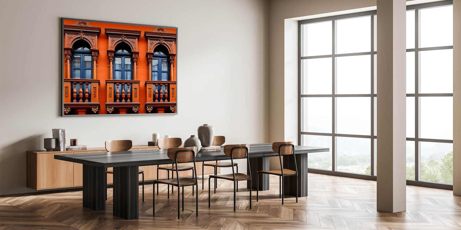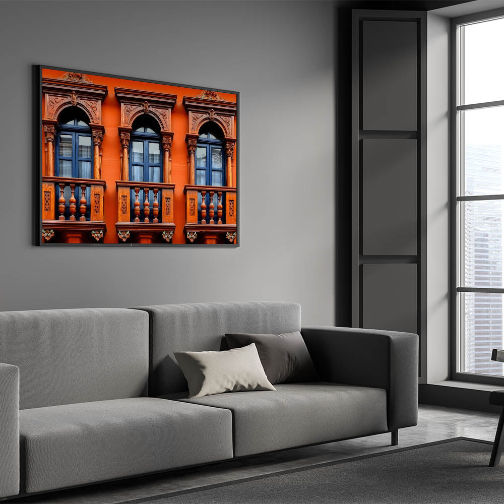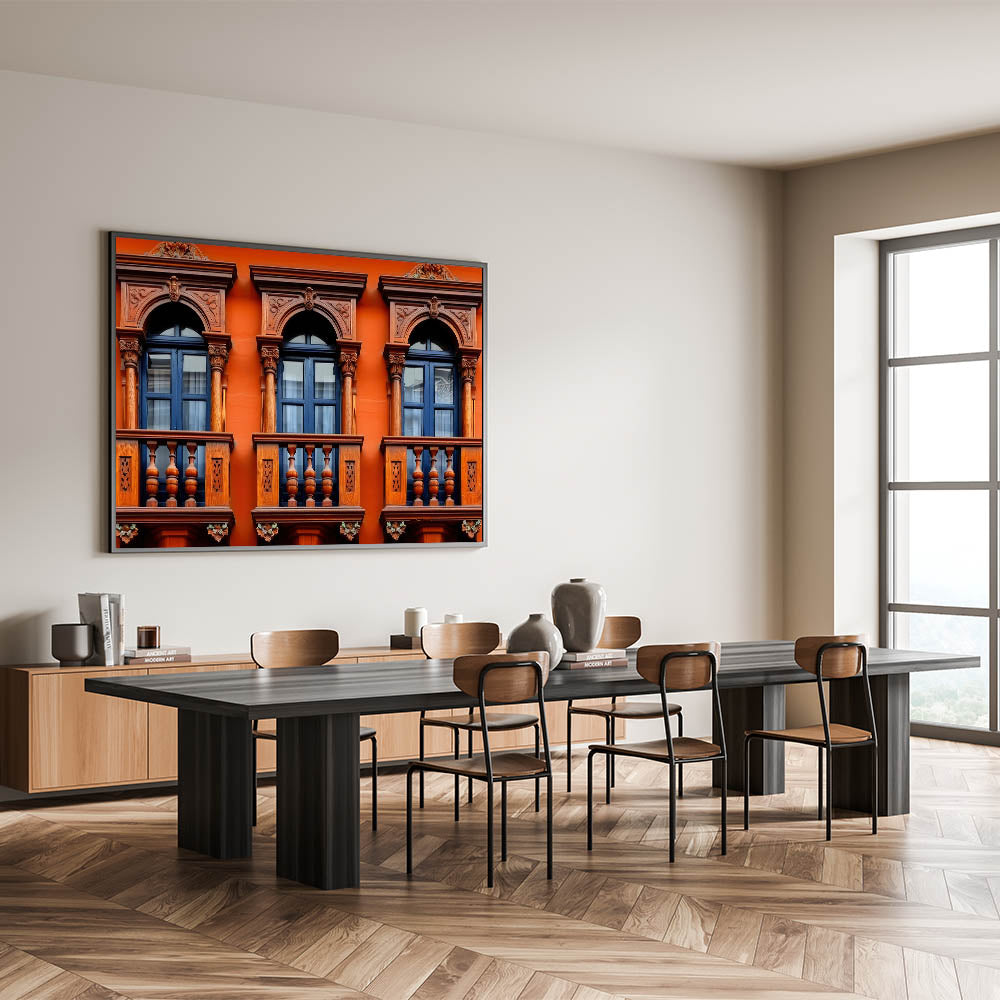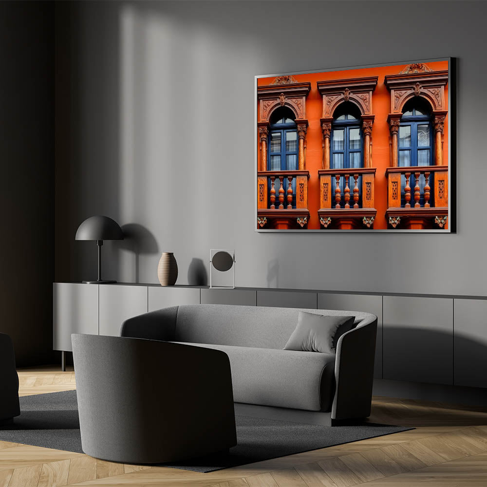 This eye-catching Middle Eastern art print features a vibrant and intricate window facade, blending classical design with bold, modern colors. The rich woodwork and detailed carvings surrounding the windows highlight the craftsmanship that is synonymous with Arabian architecture. The deep blue window frames offer a striking contrast against the bright orange walls, creating a unique and visually appealing balance. Perfect for art lovers who appreciate both tradition and modern aesthetics, this artwork adds a splash of architectural elegance to any home or office.