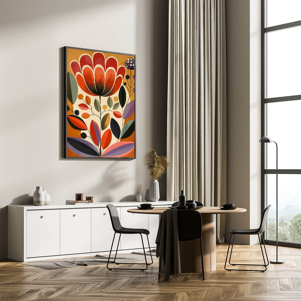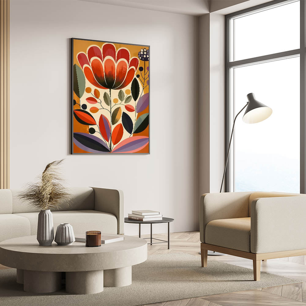 Brighten your home with this vibrant Scandinavian floral wall art, featuring bold red, orange, and purple hues against a warm, inviting background. This Nordic-inspired design highlights a stunning flower surrounded by abstract leaf patterns, blending modern aesthetics with traditional Scandinavian design elements. The bold use of color and clean lines make this art piece an eye-catching addition to any space, perfect for adding warmth and personality to your home.
