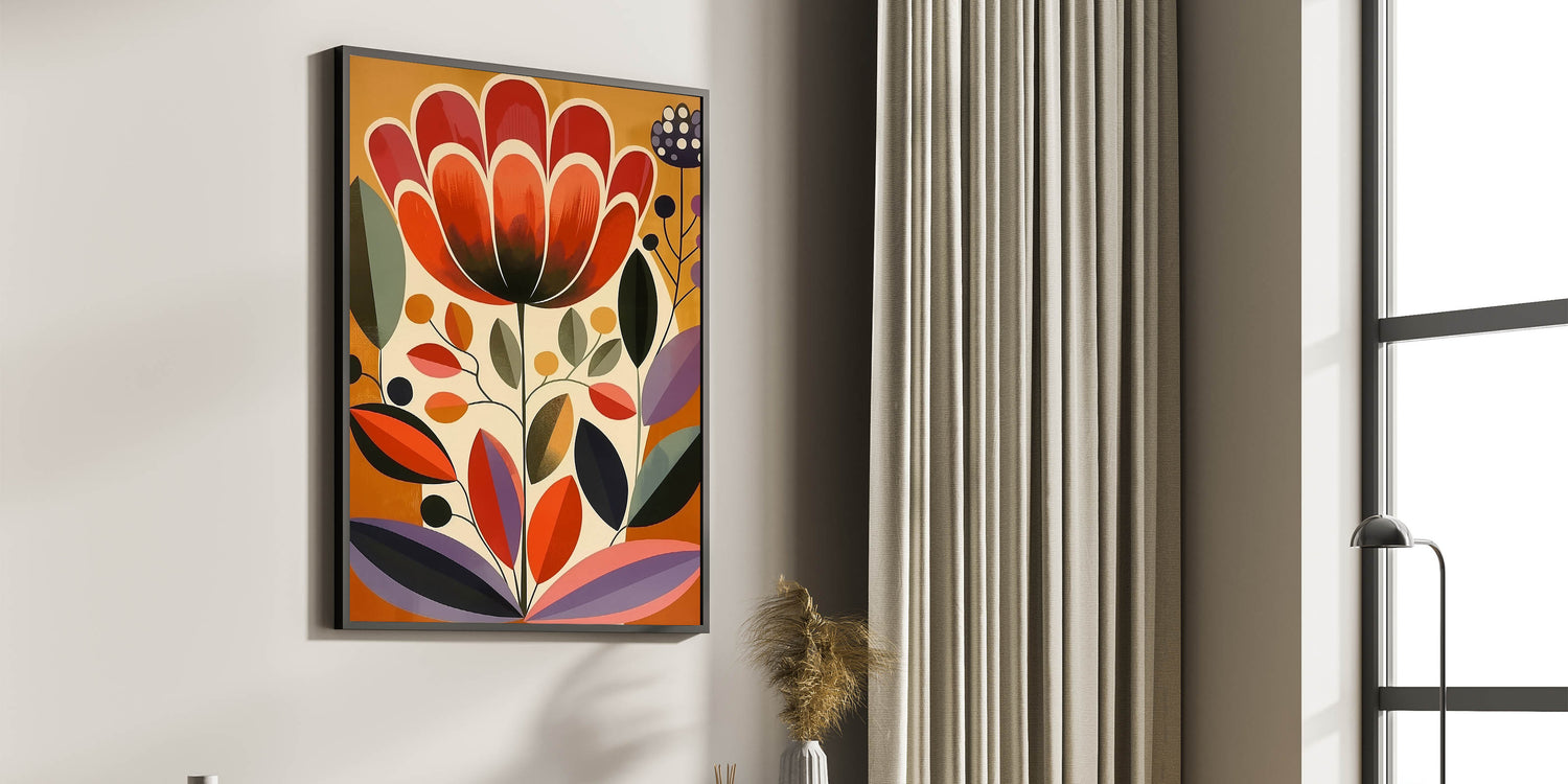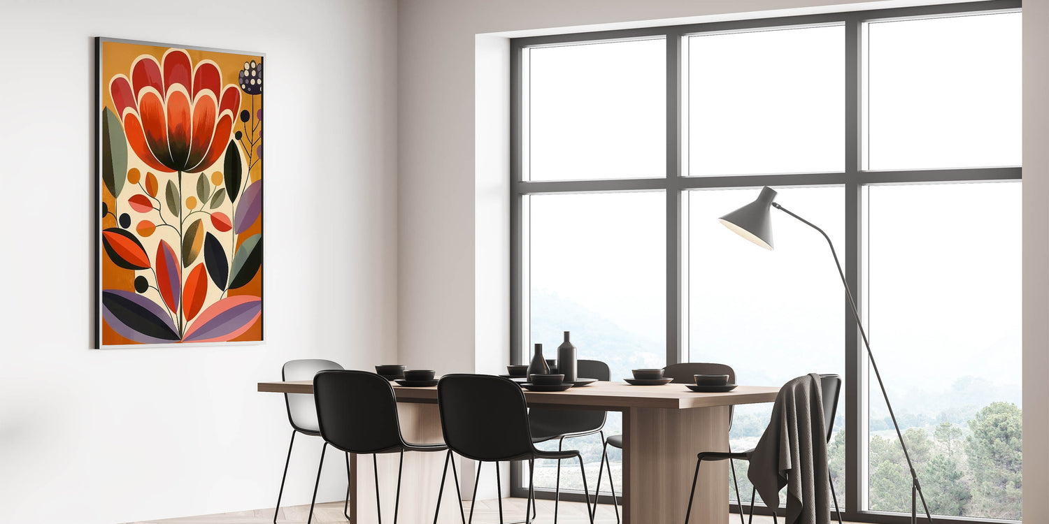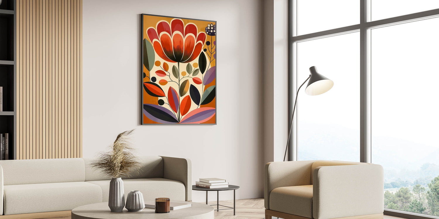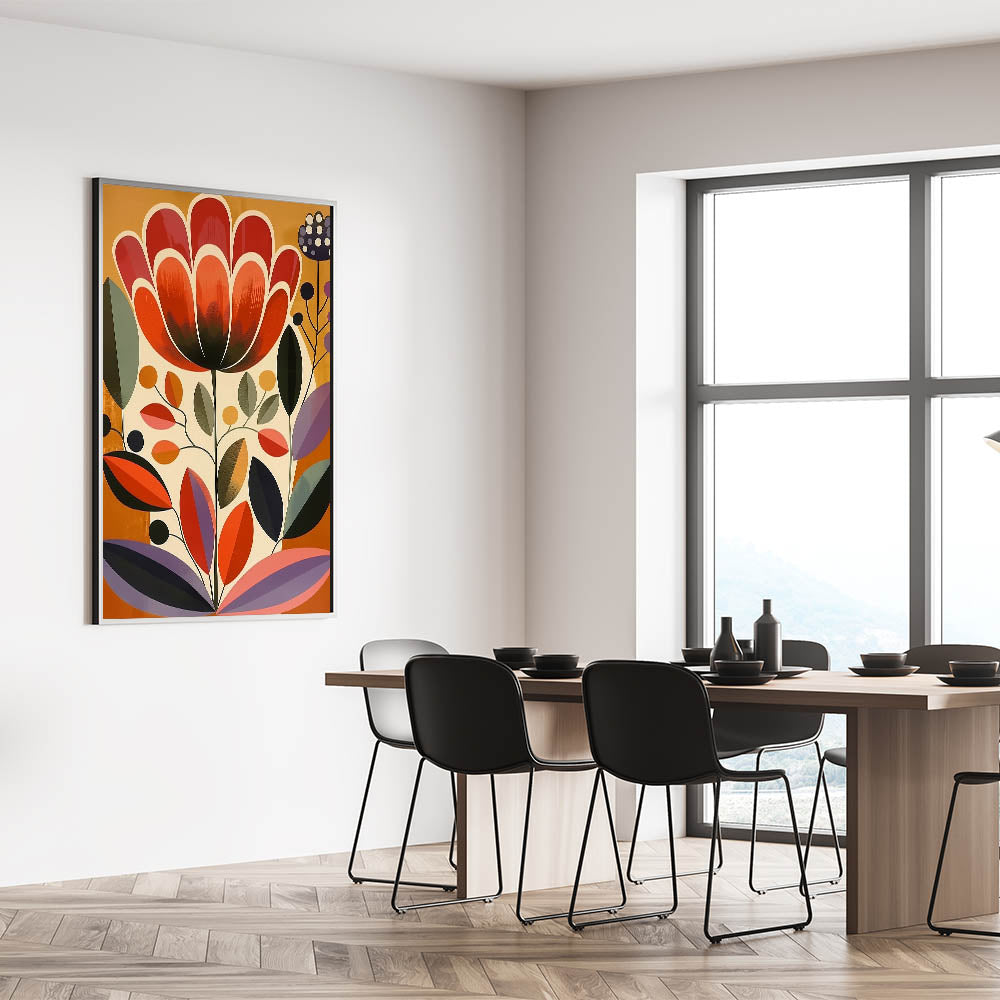 This floral art print is perfect for anyone looking to add a burst of color and sophistication to their space while embracing the warmth of Scandinavian design.