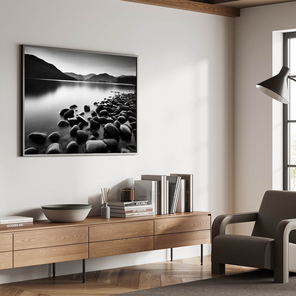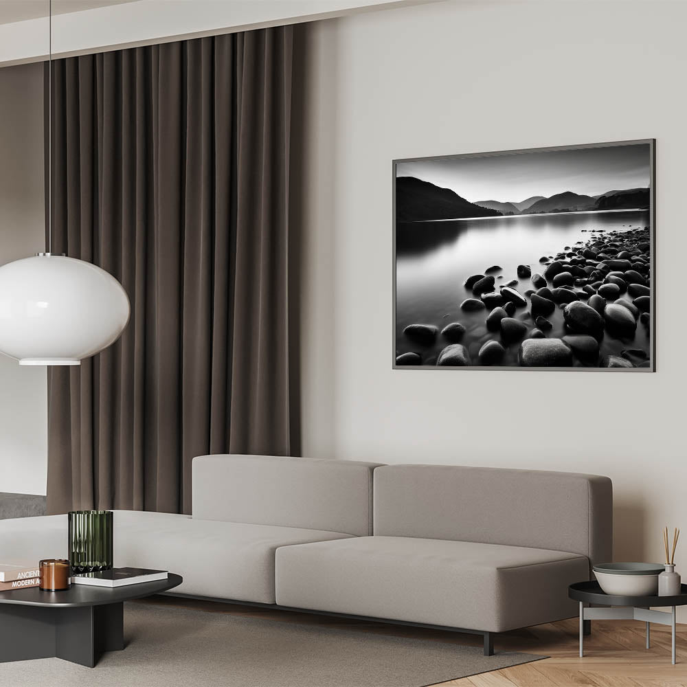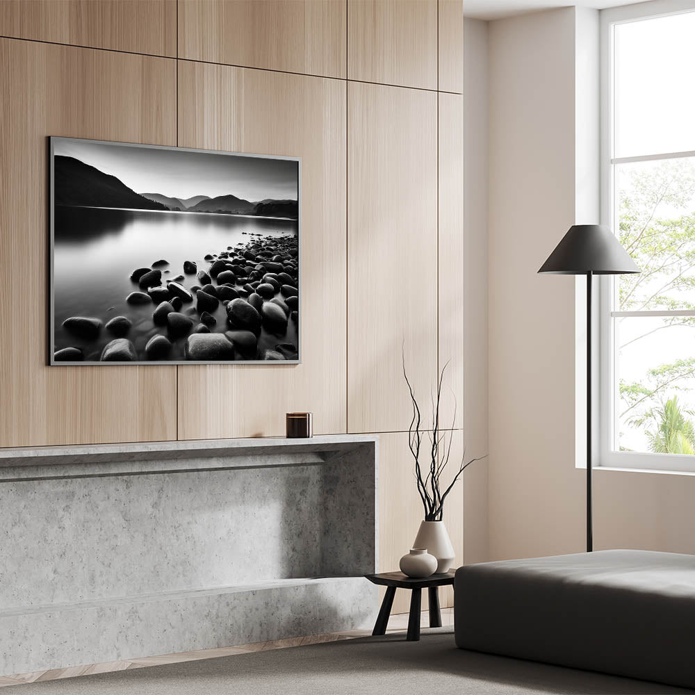 Elevate your home decor with this captivating monochrome seascape wall art. The black-and-white coastal scene features smooth stones along a tranquil shoreline, set against misty mountains in the distance. The absence of color enhances the serene atmosphere, making this piece a perfect addition to modern or minimalist spaces.