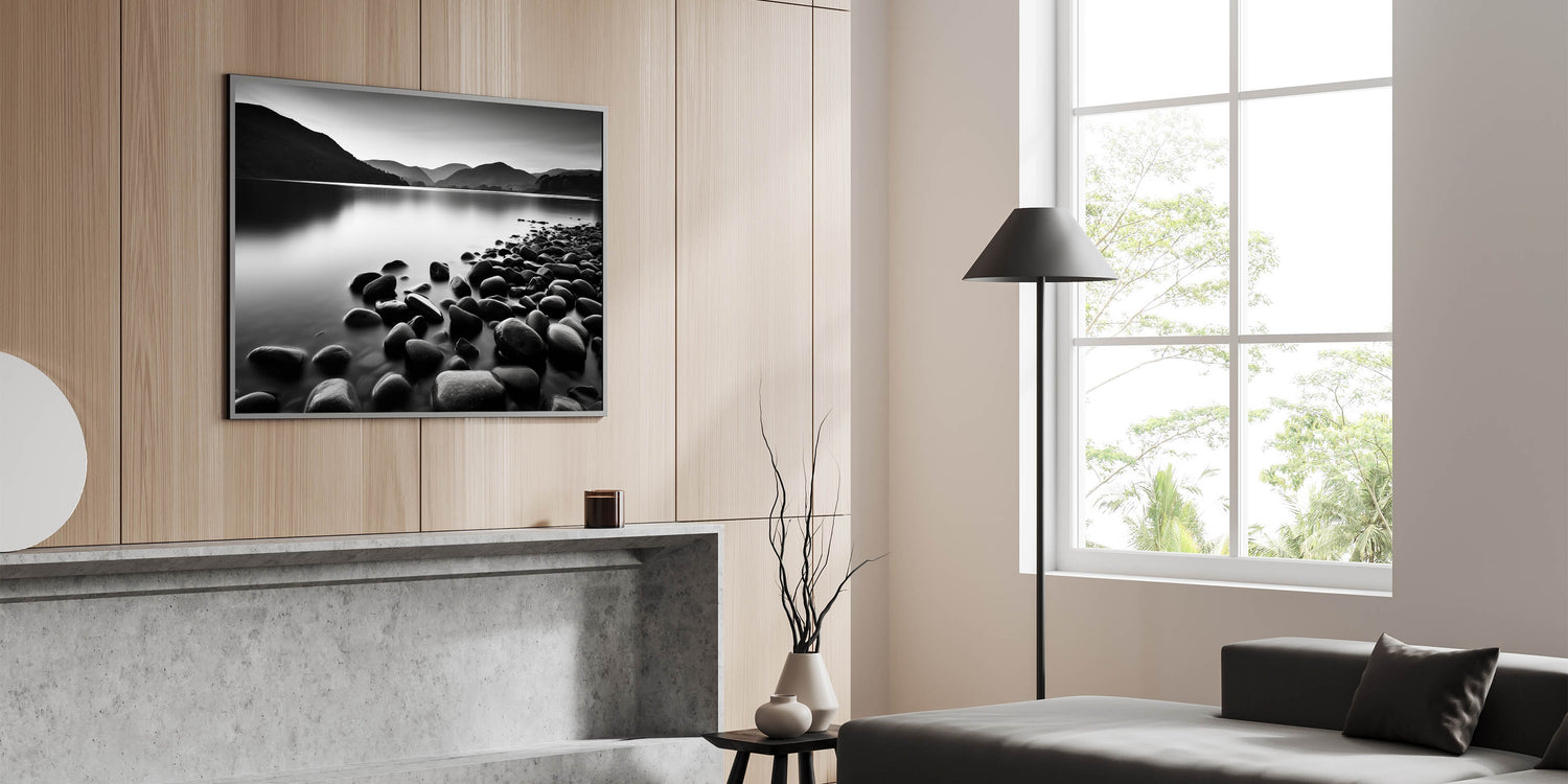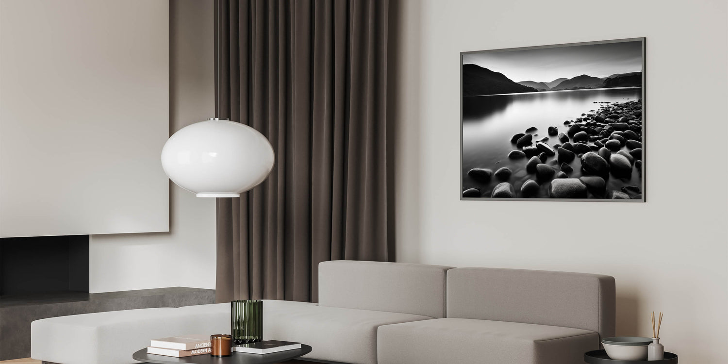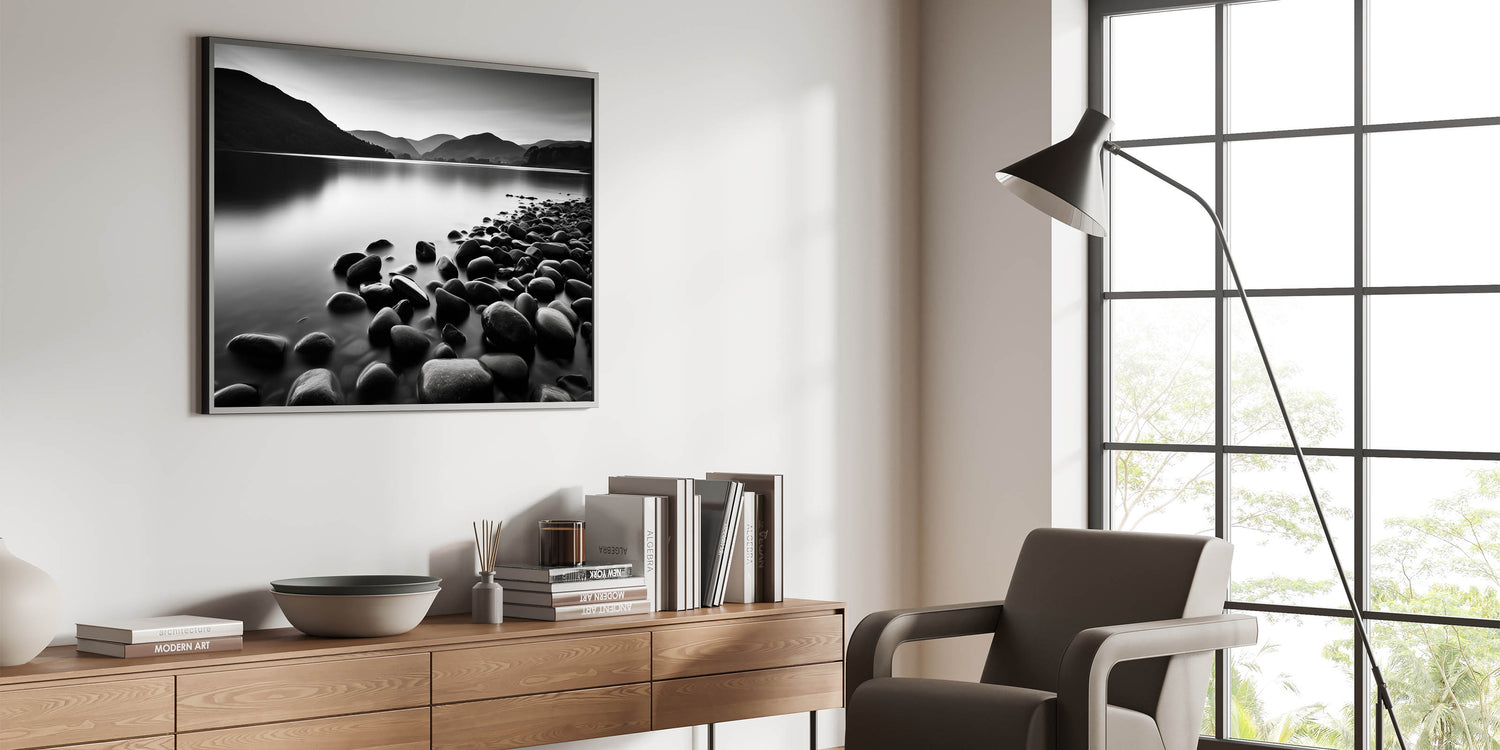 Elevate your home decor with this captivating monochrome seascape wall art. The black-and-white coastal scene features smooth stones along a tranquil shoreline, set against misty mountains in the distance. The absence of color enhances the serene atmosphere, making this piece a perfect addition to modern or minimalist spaces.