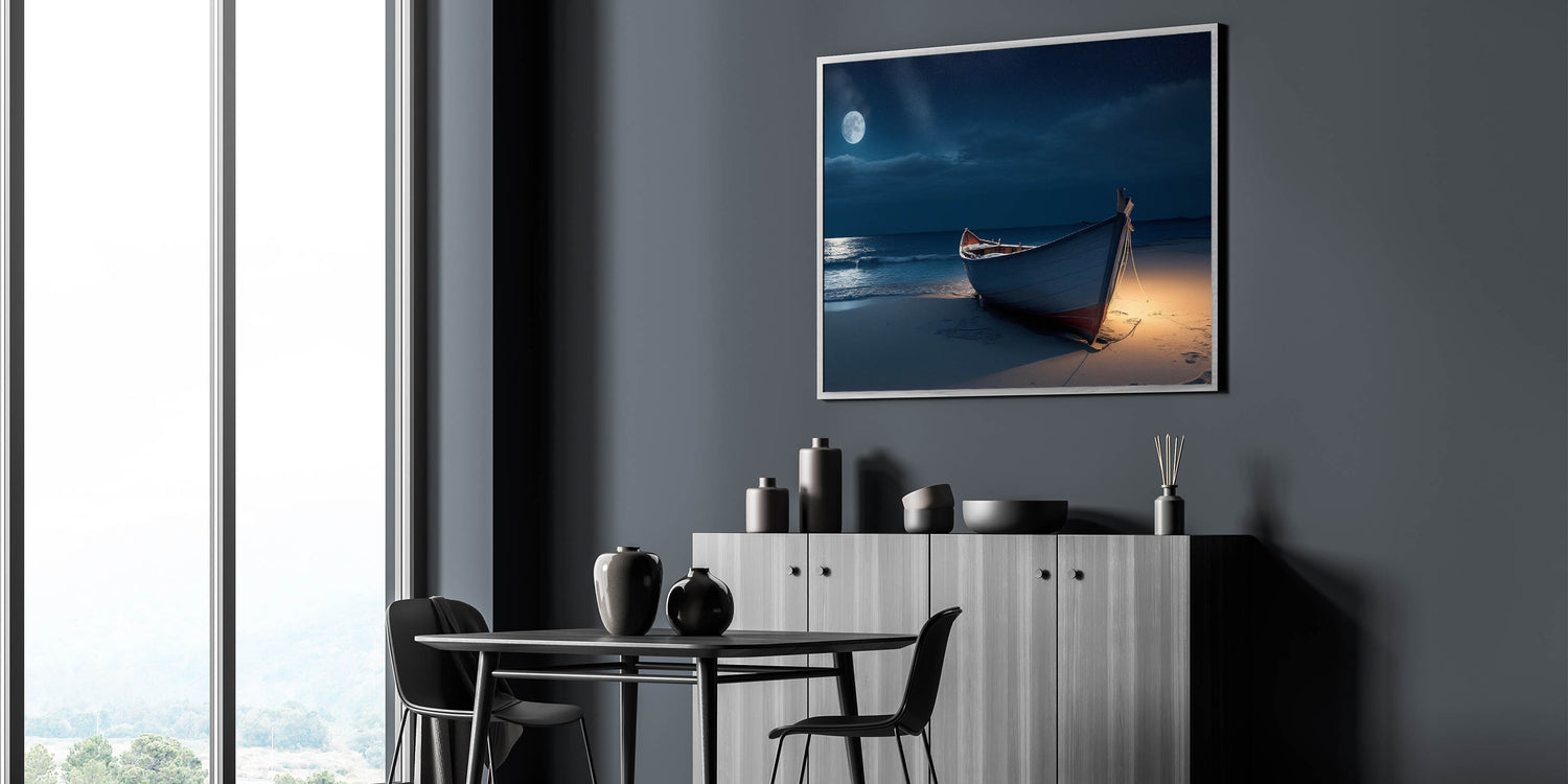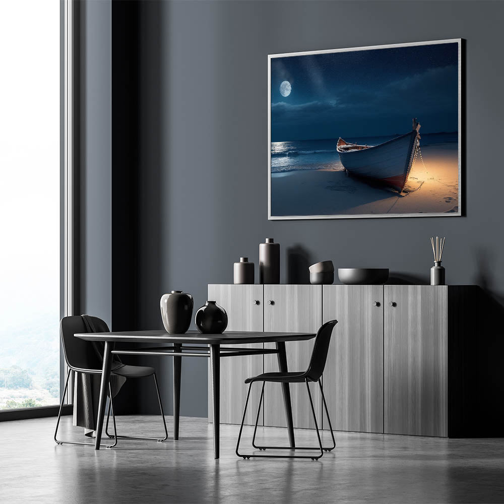 Embrace the quiet serenity of the night with this moonlit boat on beach canvas. The artwork beautifully captures a solitary boat resting on the shore, bathed in the soft glow of the full moon. The calm ocean and starry night sky create a peaceful and reflective atmosphere, making this piece perfect for adding a touch of tranquility to your home. Whether you display it in your living room, bedroom, or study, this nighttime coastal art will evoke a sense of calm and wonder, transporting you to a peaceful beach under the stars.