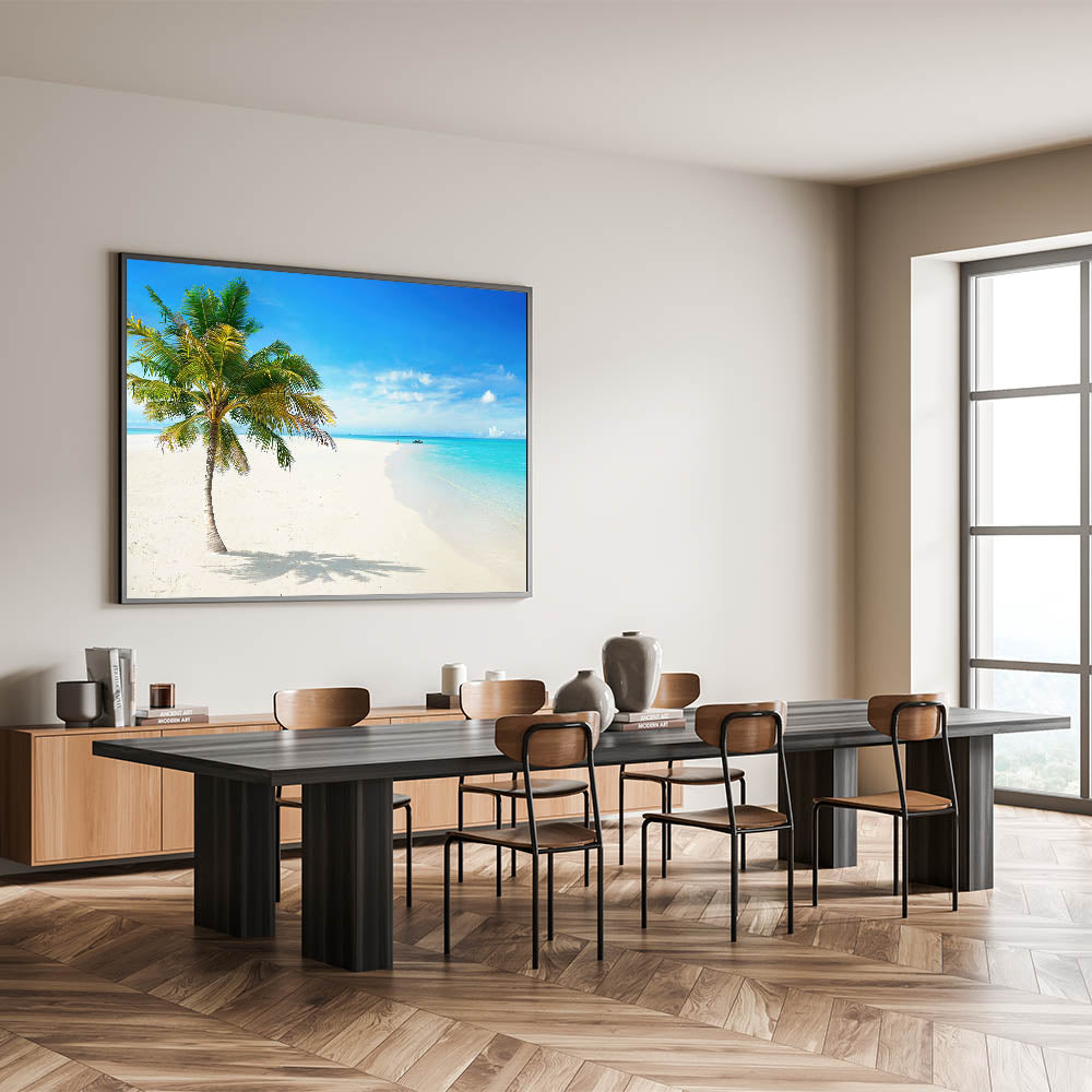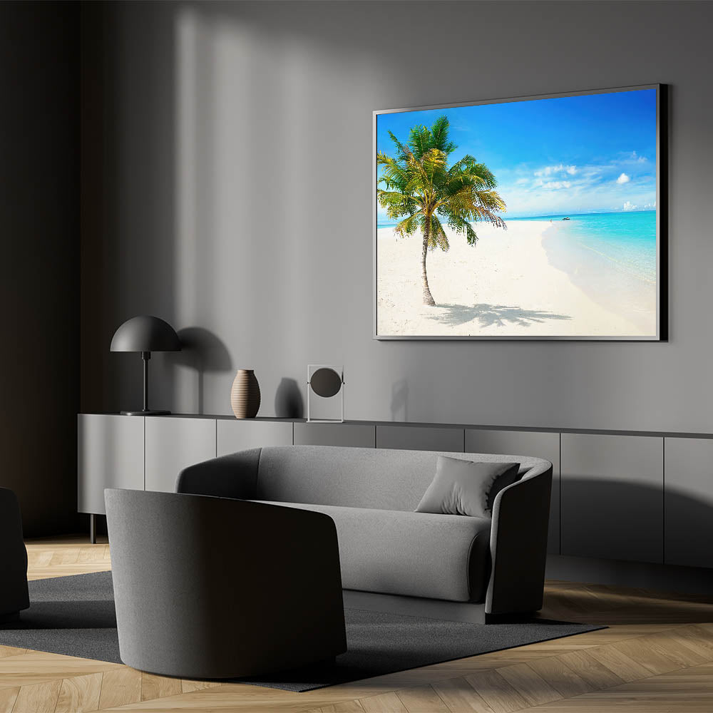 Transform your space into a tropical oasis with this stunning beach scene wall art. Featuring a lone palm tree swaying gently over a pristine white sandy beach, with crystal-clear turquoise waters stretching into the horizon, this artwork captures the essence of paradise. The vibrant blues and greens of the ocean and palm tree contrast beautifully with the soft, sandy shore, creating a tranquil and inviting atmosphere.