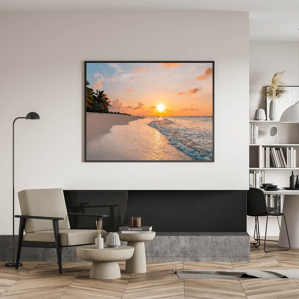 Bring the tranquil beauty of a tropical sunrise into your home with this stunning beach scene canvas. This artwork captures the serene moment when the sun rises over the horizon, casting a warm glow over the sandy shores and calm waves. Ideal for any space in need of a coastal touch, this piece evokes the peaceful ambiance of a morning walk along the beach, making it a perfect addition to your living room, bedroom, or beach house decor.