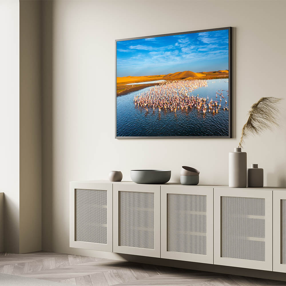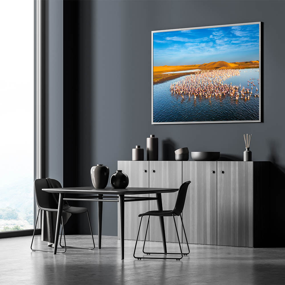 Bring the vibrant beauty of nature into your home with this stunning depiction of flamingos in a desert oasis. The artwork captures the contrast between the rich blue waters and the golden sands of the desert, with a flock of flamingos adding a splash of color and life to the scene. This unique piece of wildlife wall art is perfect for those who appreciate the wonders of nature and the beauty of wildlife. Whether displayed in a living room, office, or study, this artwork will add a touch of exotic charm and vibrant color to your space.