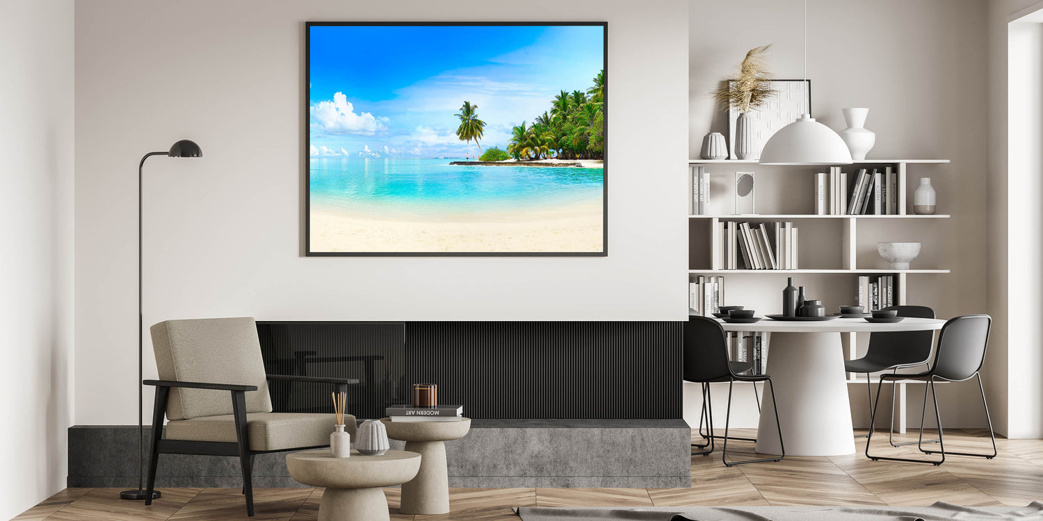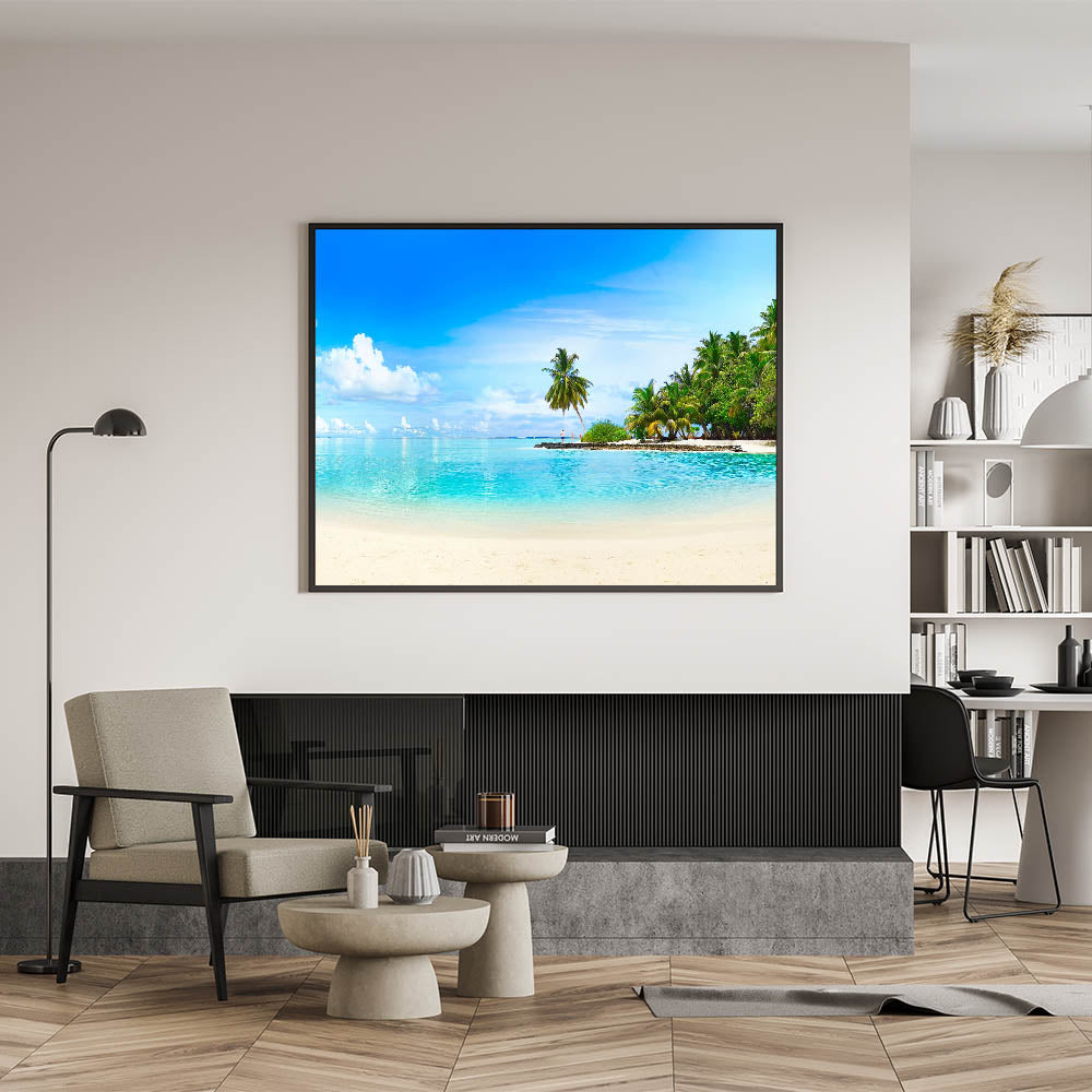 Bring the beauty of a tropical paradise into your home with this vibrant seascape wall art. Featuring a stunning beach scene with crystal-clear blue waters, soft sandy shores, and lush green palm trees under a bright blue sky, this coastal art print captures the essence of a serene island getaway.