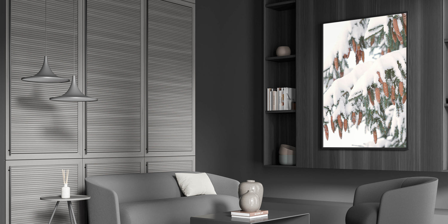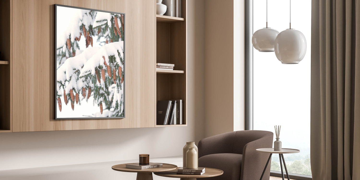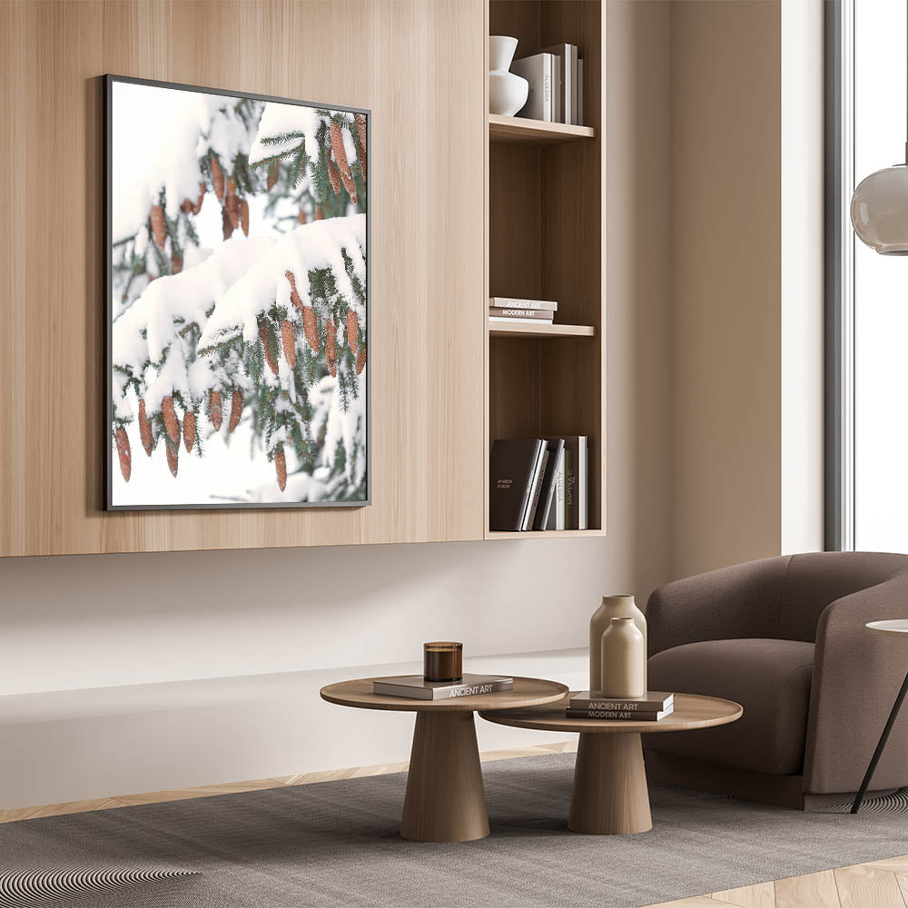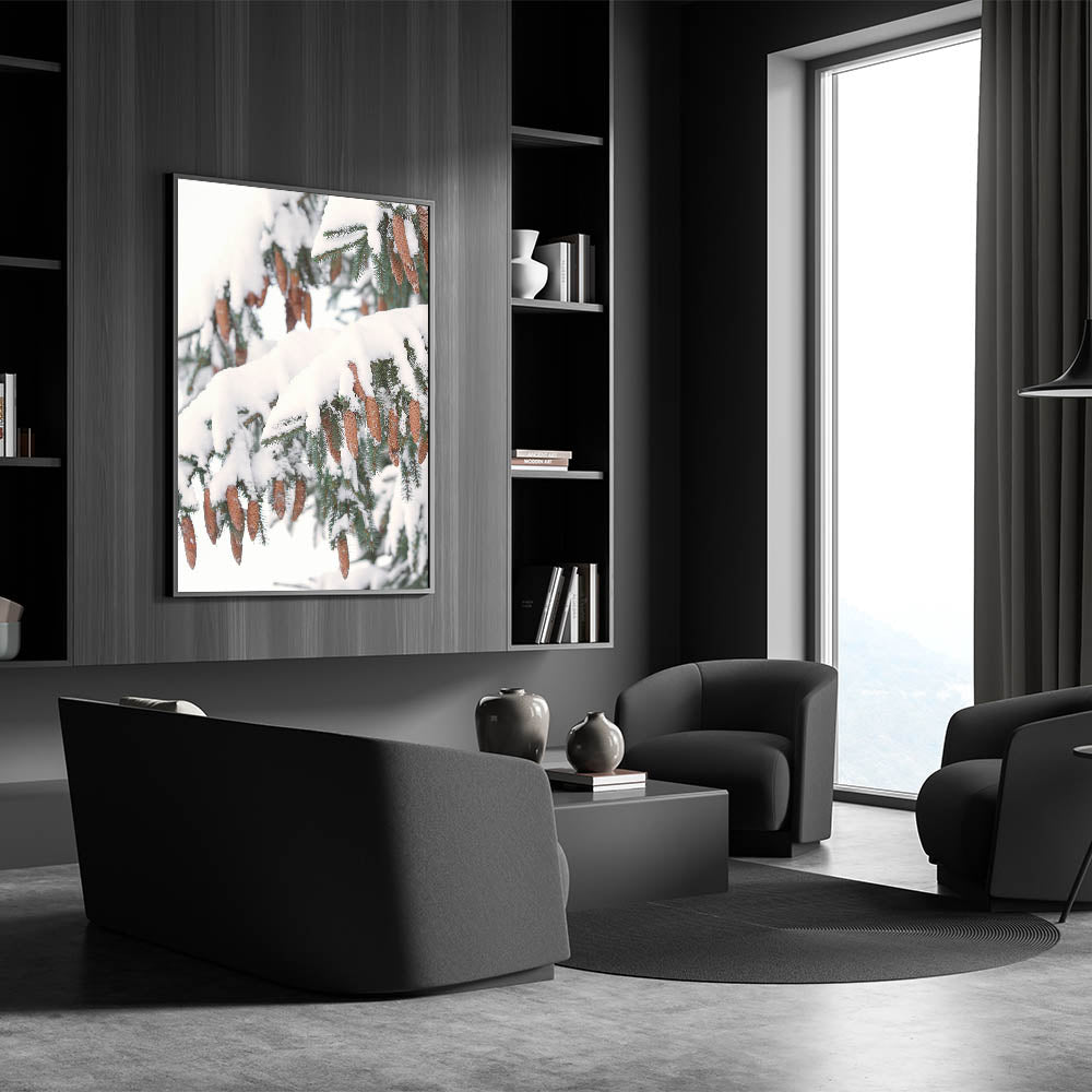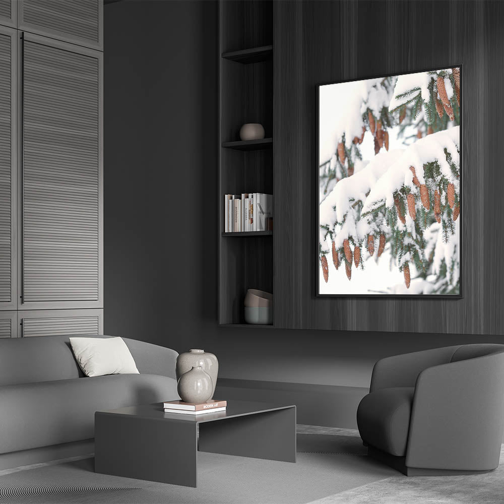 Celebrate the beauty of winter nature with this Winter Wall Art featuring snow-laden pine branches adorned with delicate pine cones. The rich brown tones of the cones contrast beautifully with the crisp white snow, creating a stunning Winter Scene Wall Art that brings warmth and serenity into your space. This Winter Wall Decor is perfect for nature lovers and those who appreciate the quiet elegance of the season.