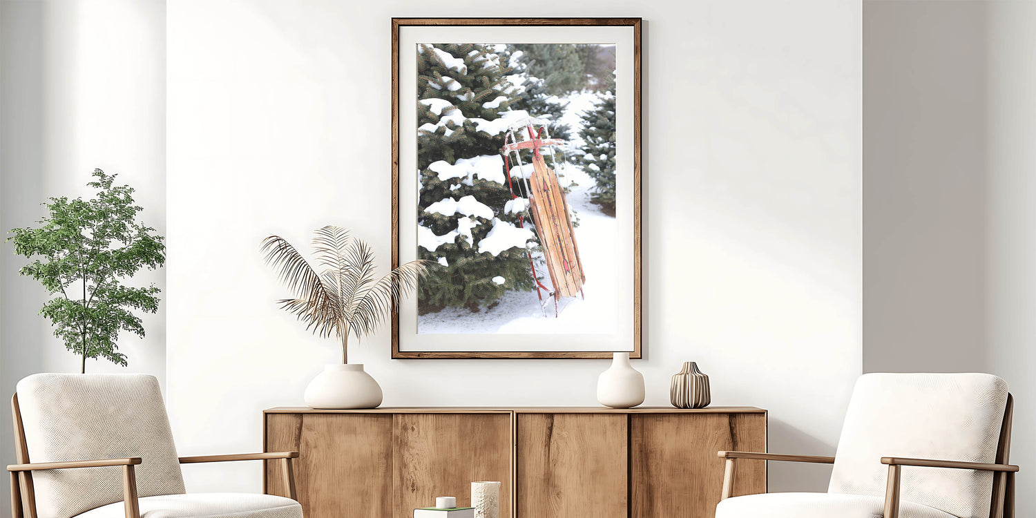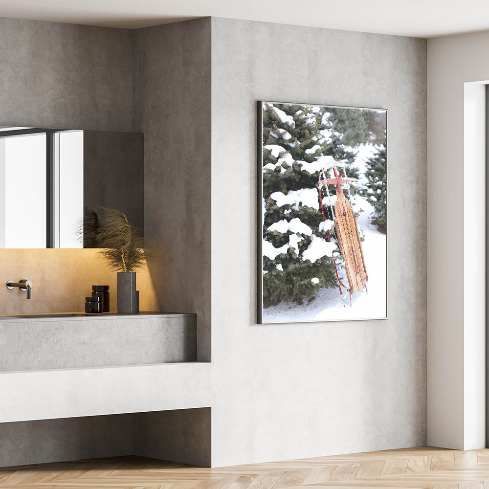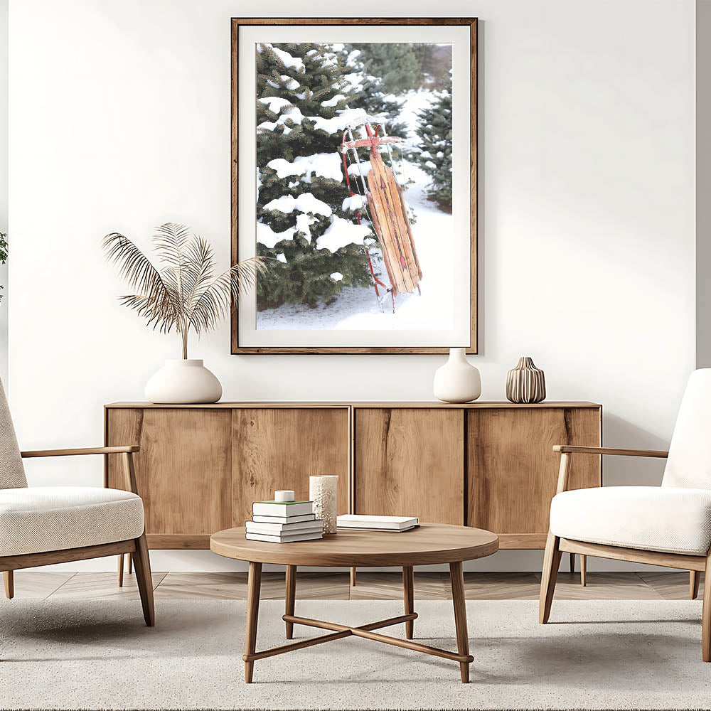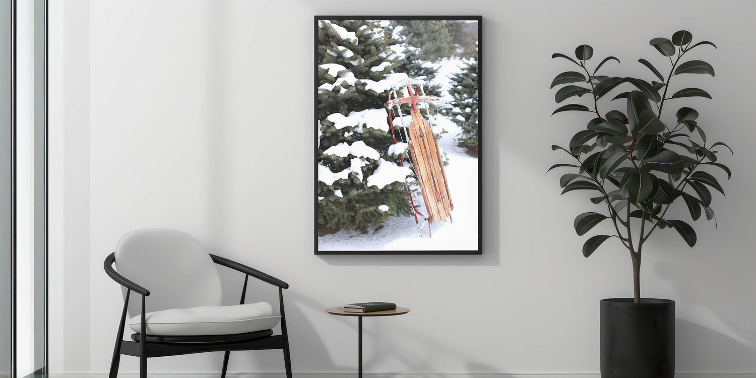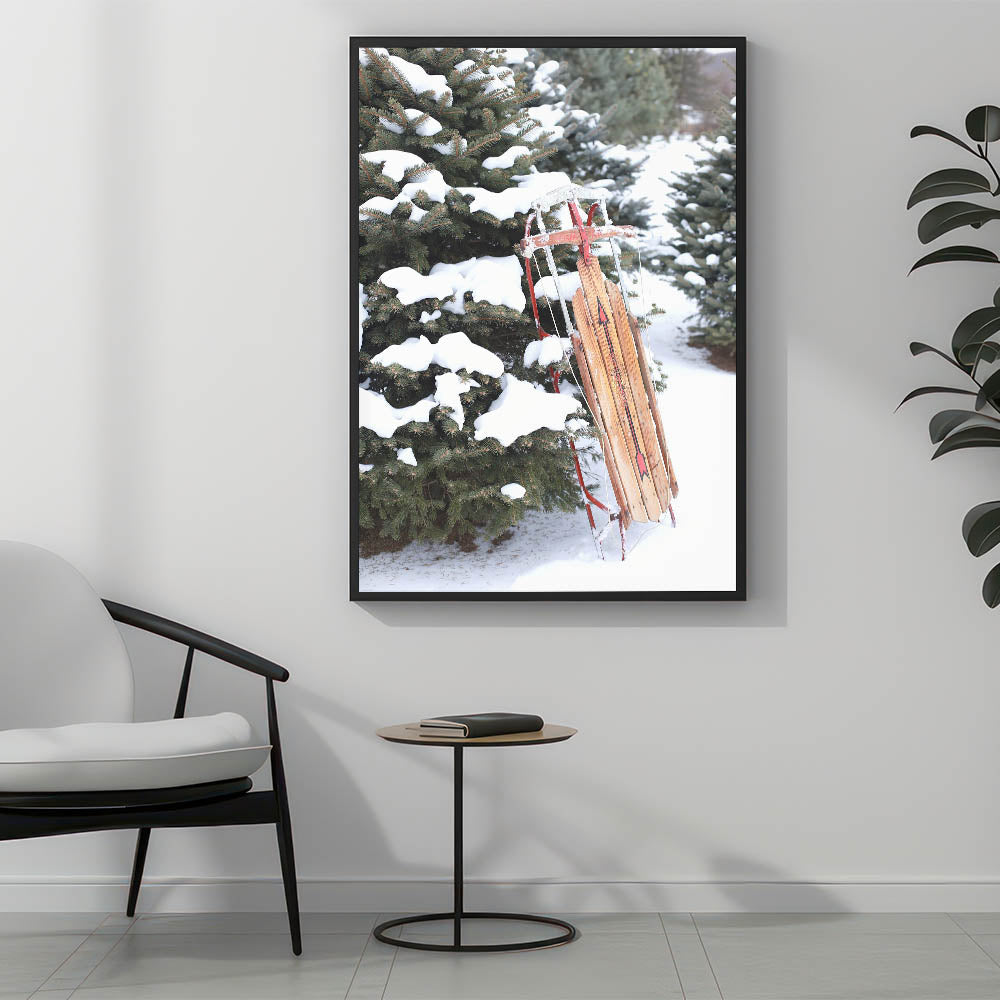 Capture the nostalgia of winter with this Winter Wall Art featuring a vintage wooden sled leaning against a snow-covered pine tree. The classic red sled, combined with the serene backdrop of evergreen trees, creates a heartwarming Winter Scene Wall Art that evokes memories of childhood adventures. This Winter Wall Decor is perfect for adding a cozy, rustic charm to your home.