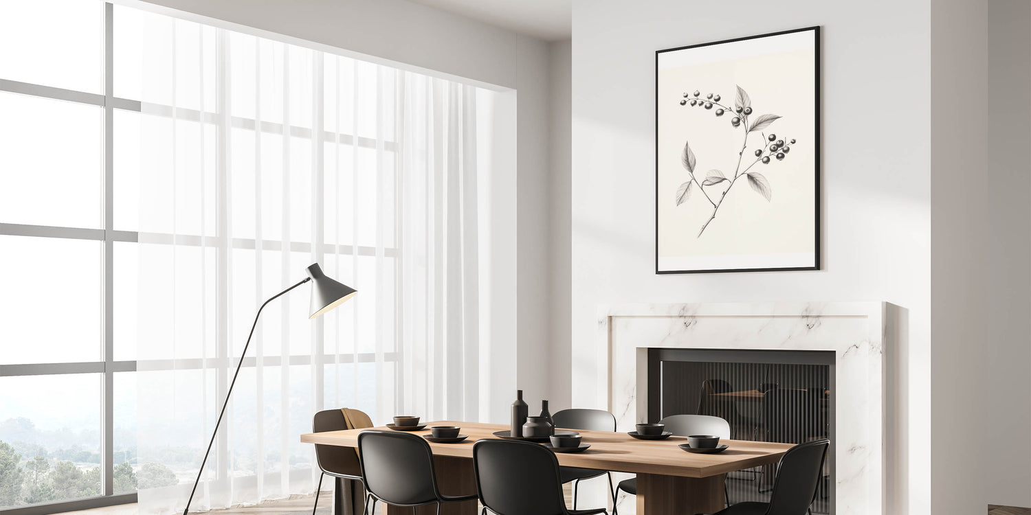 Elevate your space with this Winter Wall Decor, featuring a finely detailed black-and-white botanical sketch of a berry branch. This Winter Canvas Art captures the delicate beauty of nature, combining intricate shading with minimalist elegance. The monochrome tones make this Winter Scene Wall Art a perfect fit for both contemporary and classic interiors.