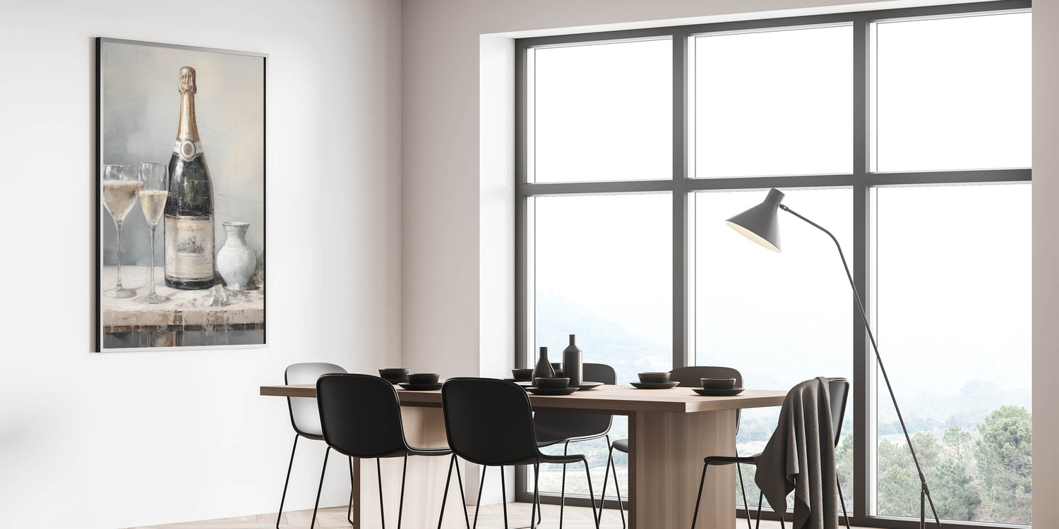 Celebrate luxury and elegance with this Winter Wall Decor, featuring a beautifully detailed still life of a champagne bottle and two glasses filled with bubbly. This Winter Canvas Art exudes sophistication with its gold, black, and muted blue tones, making it a perfect statement piece for Winter Wonderland Wall Art. The soft reflections and textured background create a refined yet inviting atmosphere, ideal for modern and classic interiors.