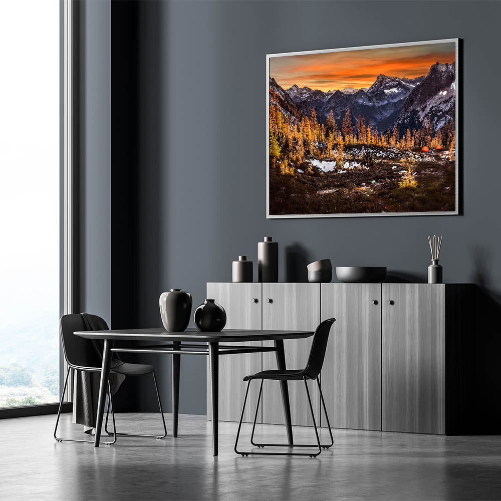 Experience the breathtaking beauty of the Pacific Northwest with this stunning landscape photography of the Cascade Mountains at sunset. The vibrant autumn trees are illuminated by the warm hues of the setting sun, contrasting against the snow-capped peaks in the background. This Seattle landscape art offers a picturesque view that captures the rugged beauty of the mountains, perfect for nature lovers and outdoor enthusiasts.