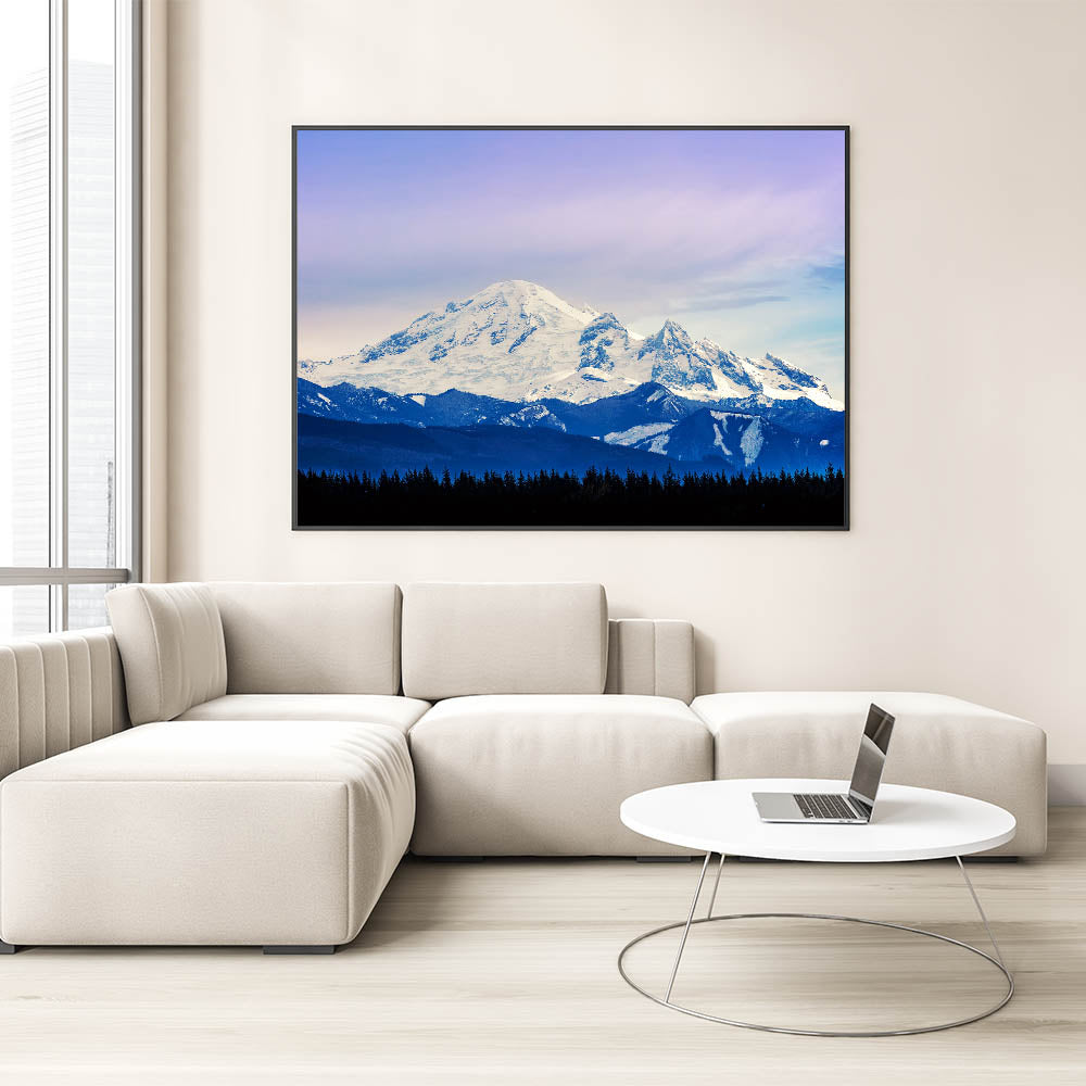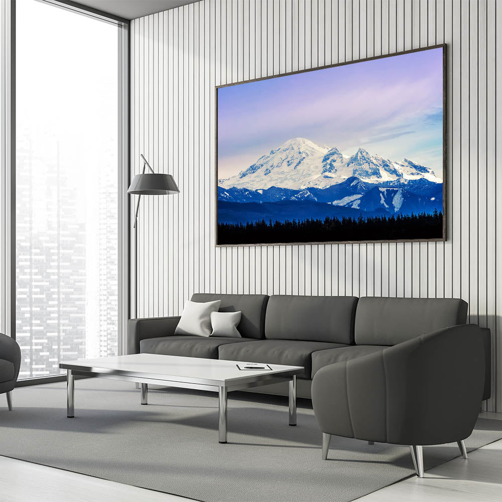 Celebrate the grandeur of Mount Rainier with this breathtaking Seattle landscape art featuring the snow-capped peak of Washington's most famous mountain. Captured in the calm of winter, this Seattle wall art offers a serene view of the majestic mountain against a peaceful sky. The soft blues and whites create a tranquil atmosphere, perfect for bringing the natural beauty of the Pacific Northwest into your home or office.