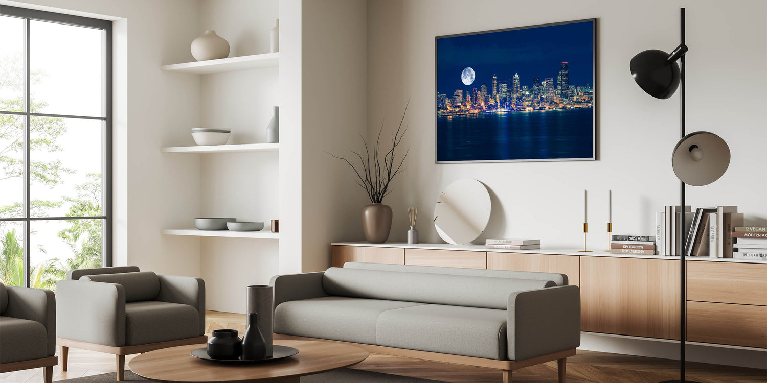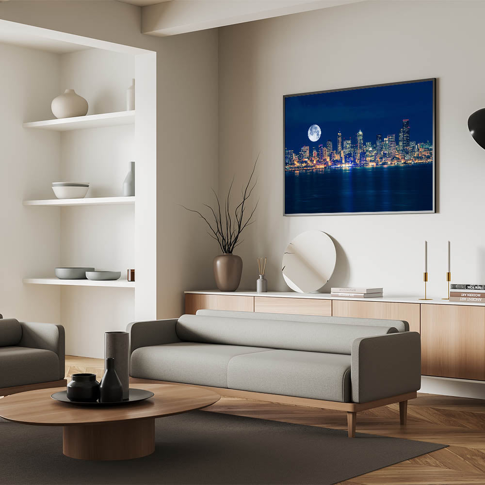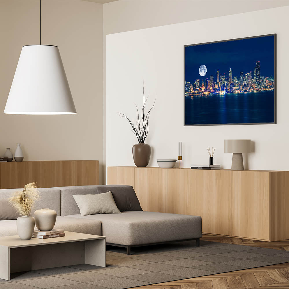Add a touch of magic to your space with this mesmerizing Seattle skyline wall art. Featuring the full moon shining brightly over the illuminated Seattle cityscape, this breathtaking scene is a perfect reflection of the city's night-time beauty. Whether for your home or office, this artwork brings a serene yet vibrant atmosphere to any room.