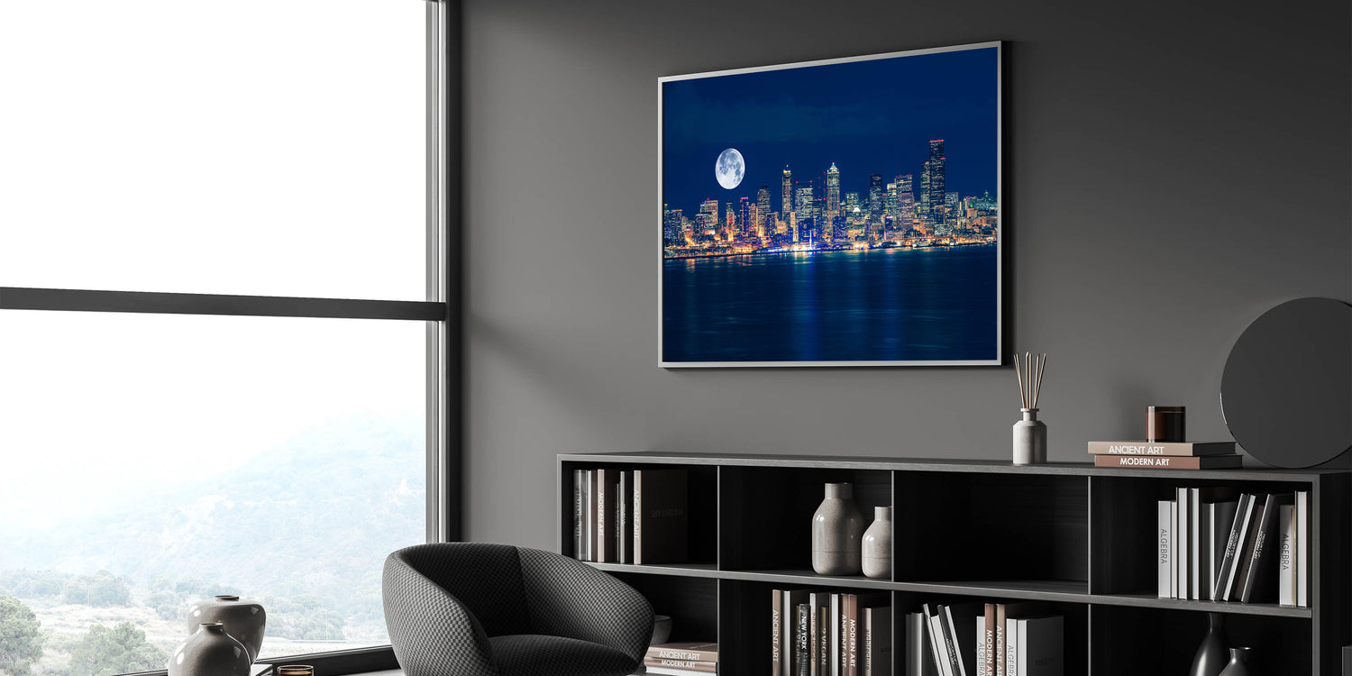 Seattle Skyline Wall Art - Full Moon Over Seattle Cityscape Print