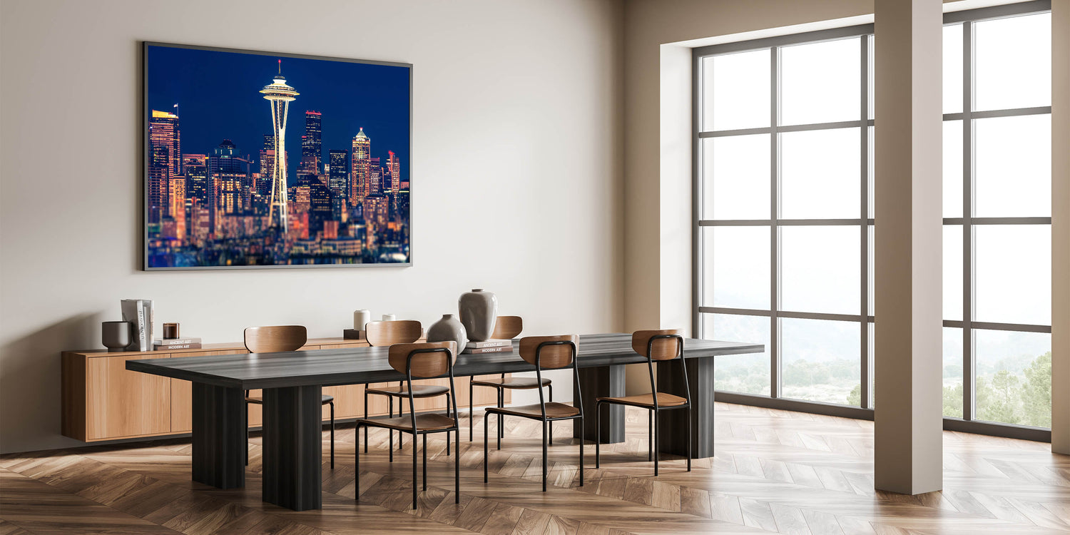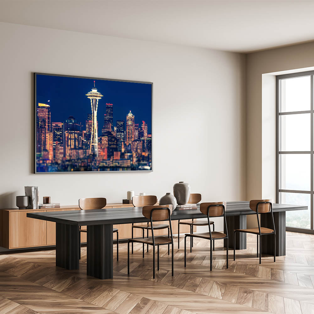 Elevate your space with this vibrant Seattle skyline wall art, featuring the iconic Space Needle glowing against a backdrop of the city’s illuminated skyline. The vivid colors and sharp details of this artwork capture the energy and beauty of Seattle at night, making it a perfect focal point for any room. Whether for your home, office, or commercial space, this striking piece brings the essence of Seattle into your décor.