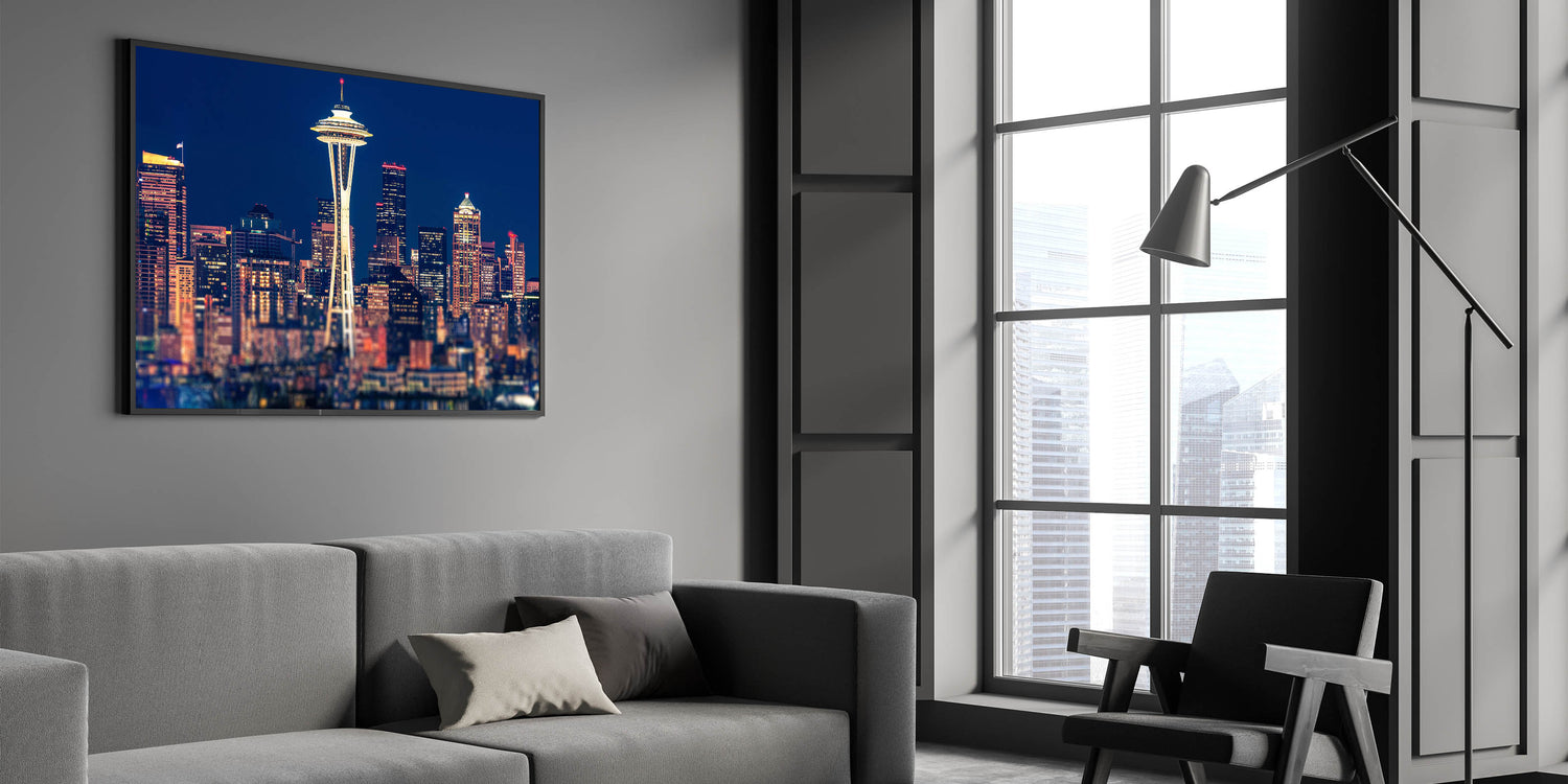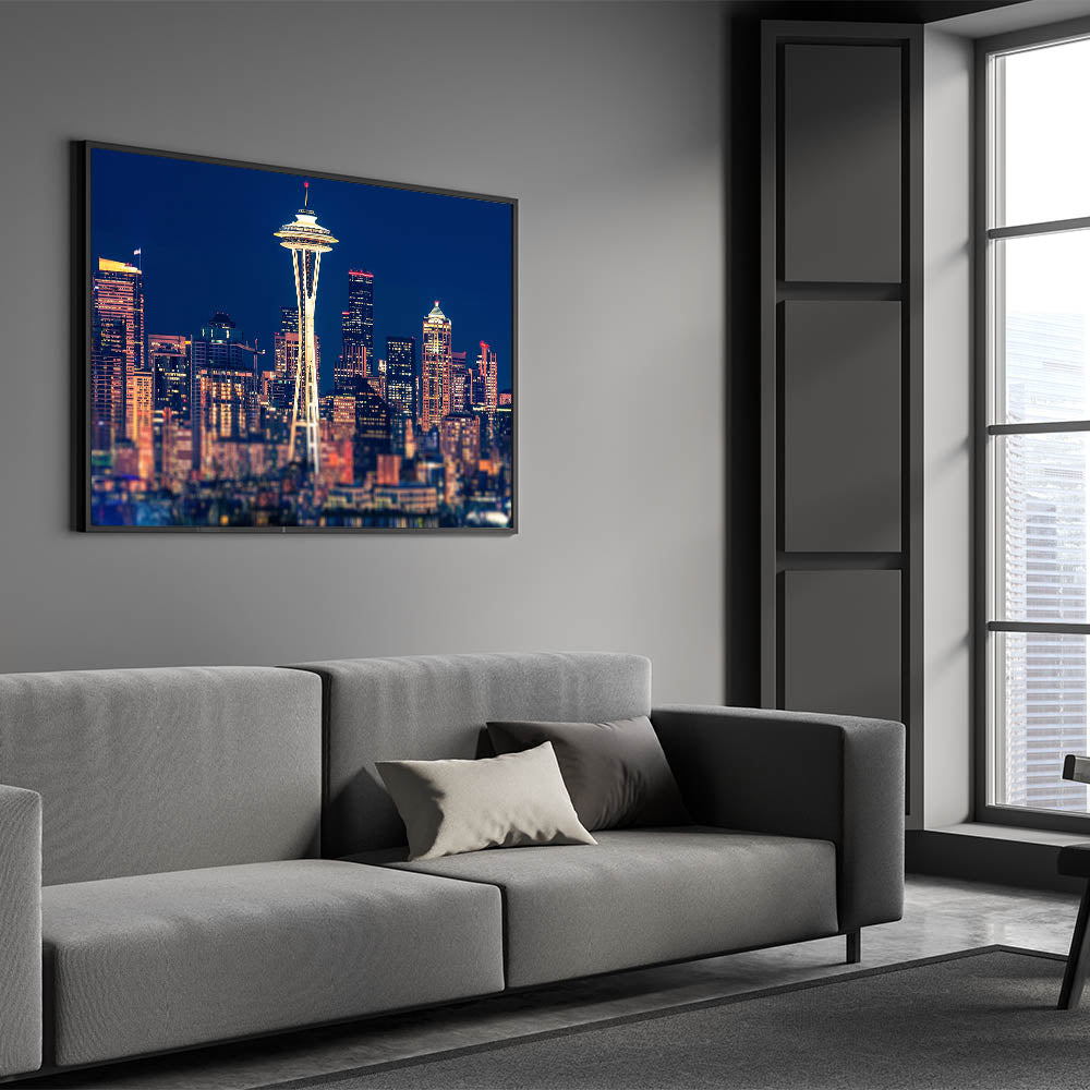 • Stunning Seattle Skyline: Showcases the Space Needle and the bright city lights of Seattle.