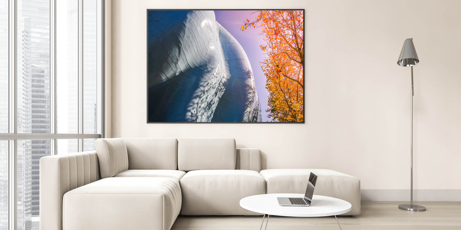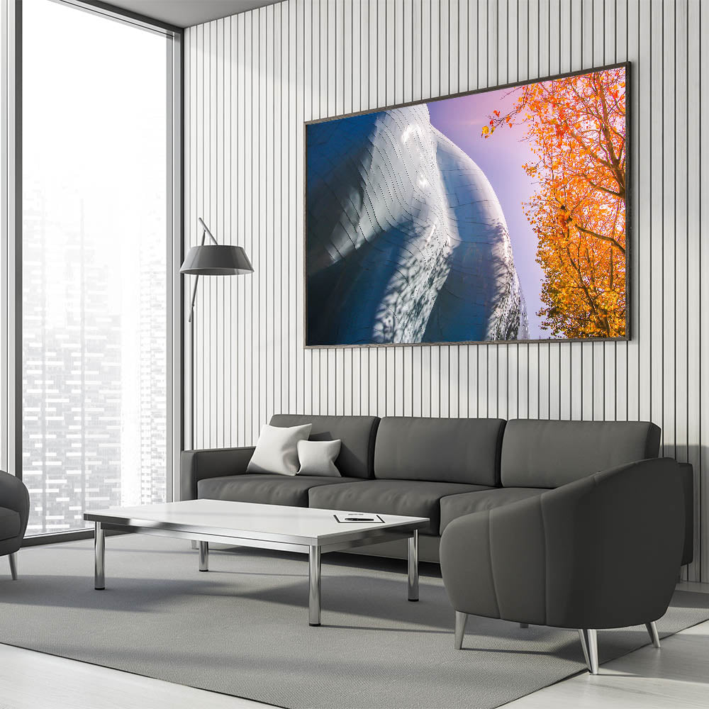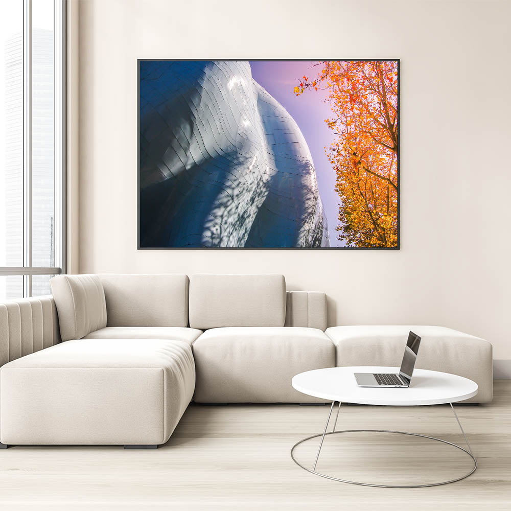 Enhance your living space with this vibrant Seattle cityscape photography capturing the dynamic curves of the iconic Seattle architecture set against a striking autumn backdrop. This piece of Seattle wall art is a blend of modern architectural design and the natural beauty of the city's seasons. Whether you're looking for a stunning Seattle skyline or an artistic addition to your home decor, this artwork delivers a visual experience that brings the essence of the city into your space.