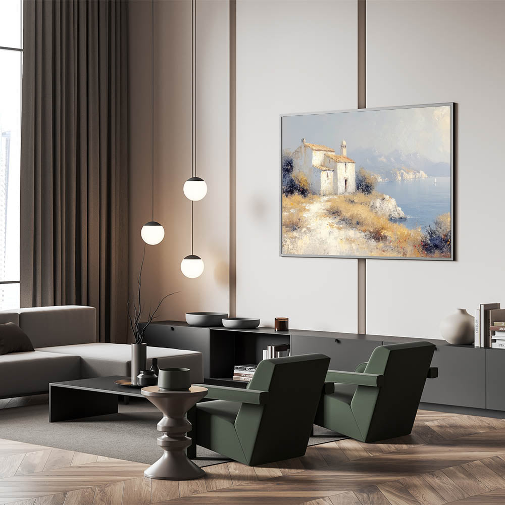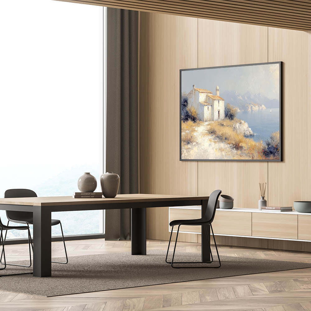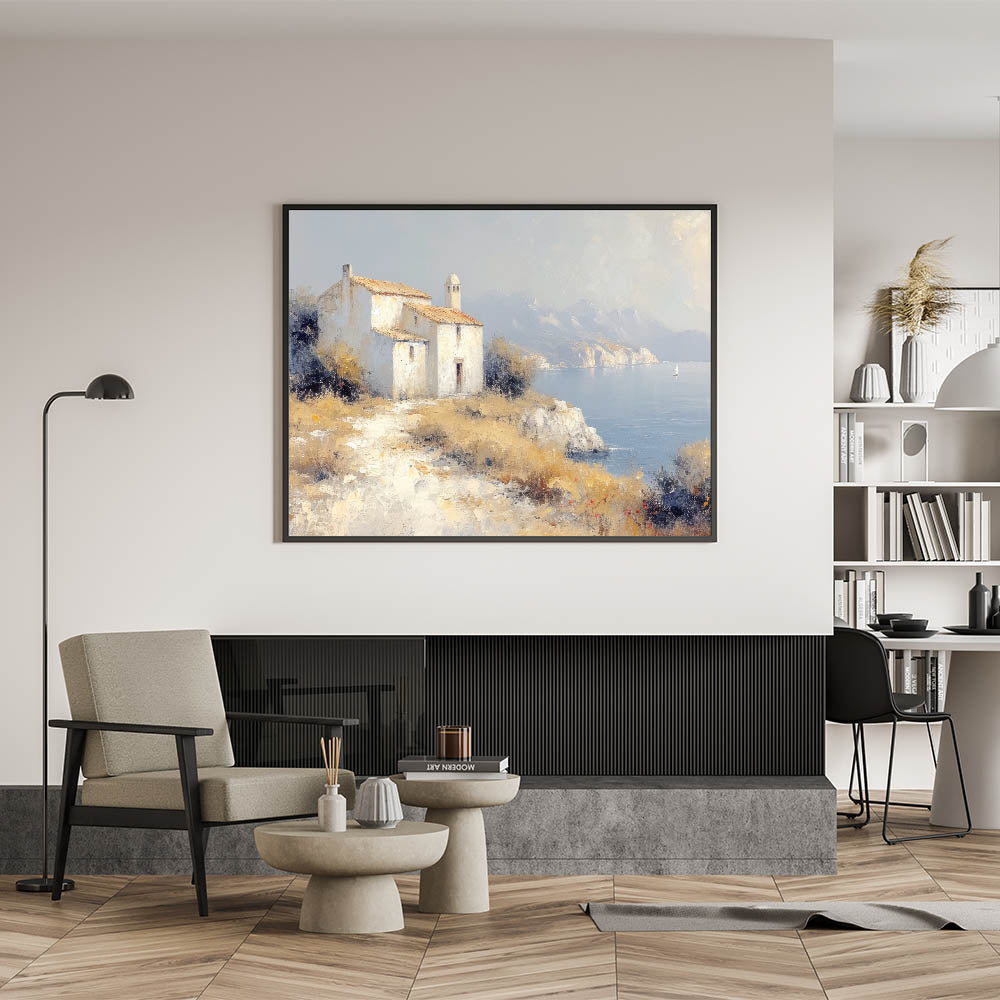 Transform your home with the timeless charm of this countryside wall art, featuring a rustic chapel perched on a coastal cliff. The artwork captures a serene view of tranquil waters, distant mountains, and natural earthy tones, creating a harmonious blend of nature and architecture. Perfect for those who adore peaceful rural landscapes, this piece is ideal for enhancing any living space.