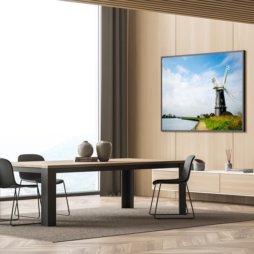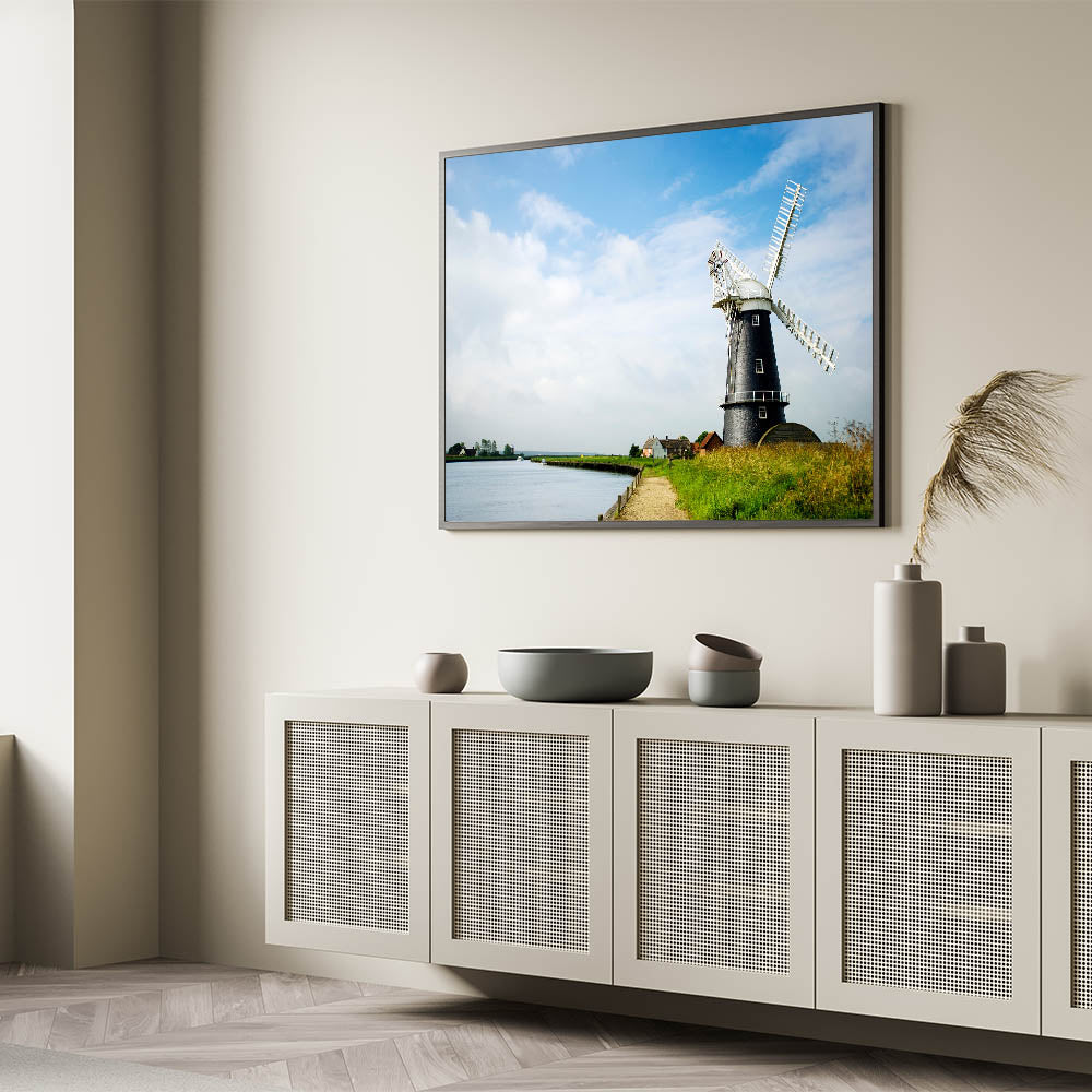Add a touch of coastal charm to your home with this serene windmill wall art, featuring a picturesque windmill by tranquil waters. The bright blue sky and gentle waters create a calming atmosphere, making this artwork an ideal addition to any room seeking to evoke the peace and beauty of a coastal landscape. The detailed windmill and the quiet riverside setting bring a sense of relaxation and timeless beauty to your living room, bedroom, or office.