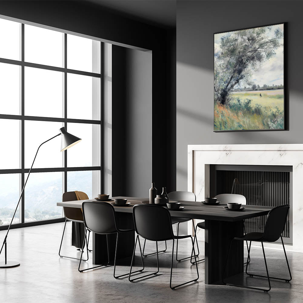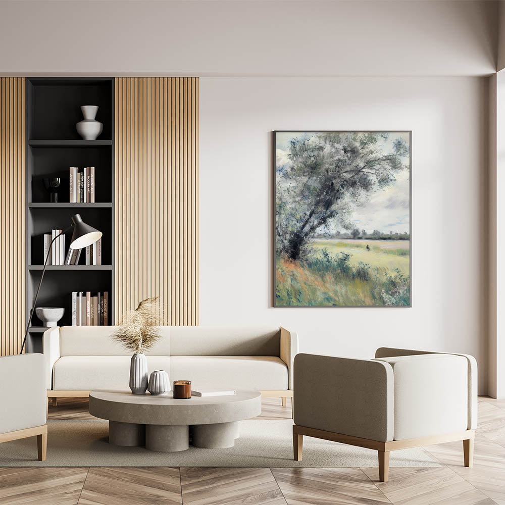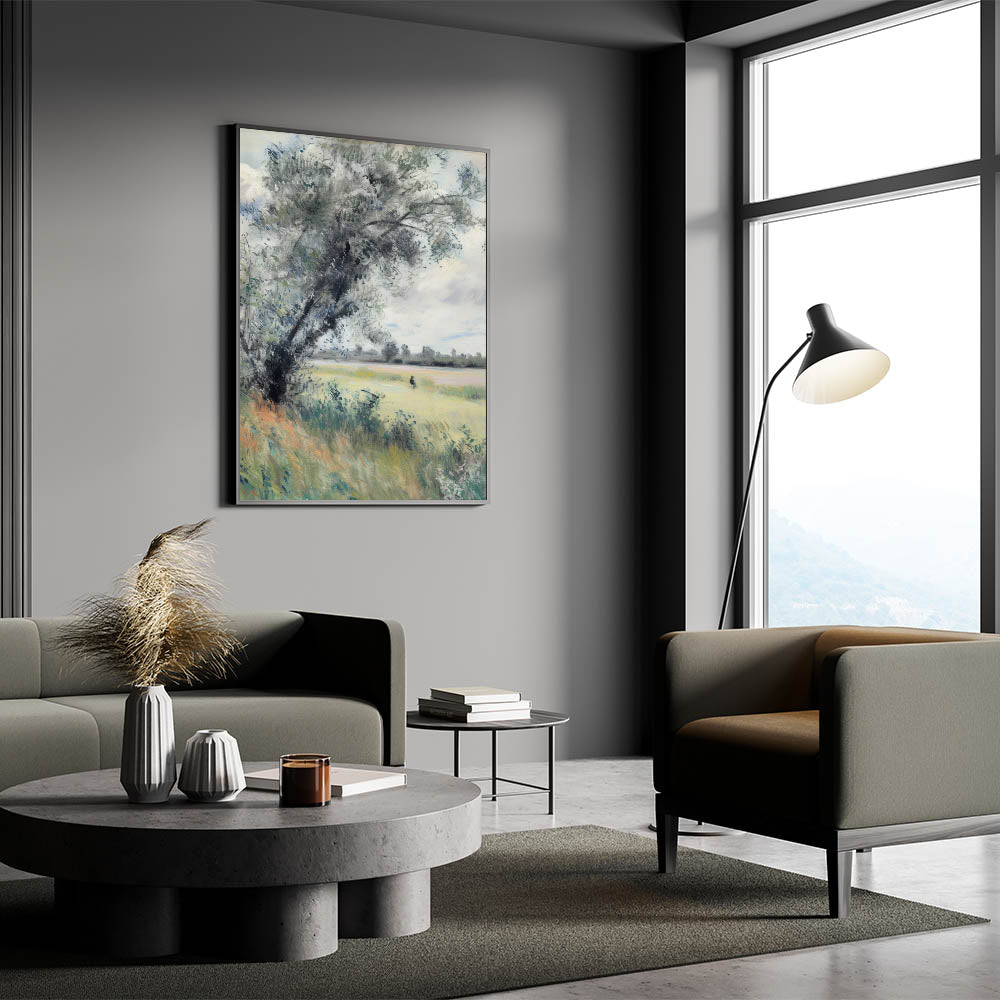 Infuse your space with the serene beauty of the countryside with this tranquil meadow landscape canvas print. Featuring soft greens, gentle blues, and earthy tones, this artwork portrays a peaceful meadow with a lone tree swaying in the breeze. Its impressionistic style and soothing palette make it a perfect choice for rustic, modern, or nature-inspired interiors.