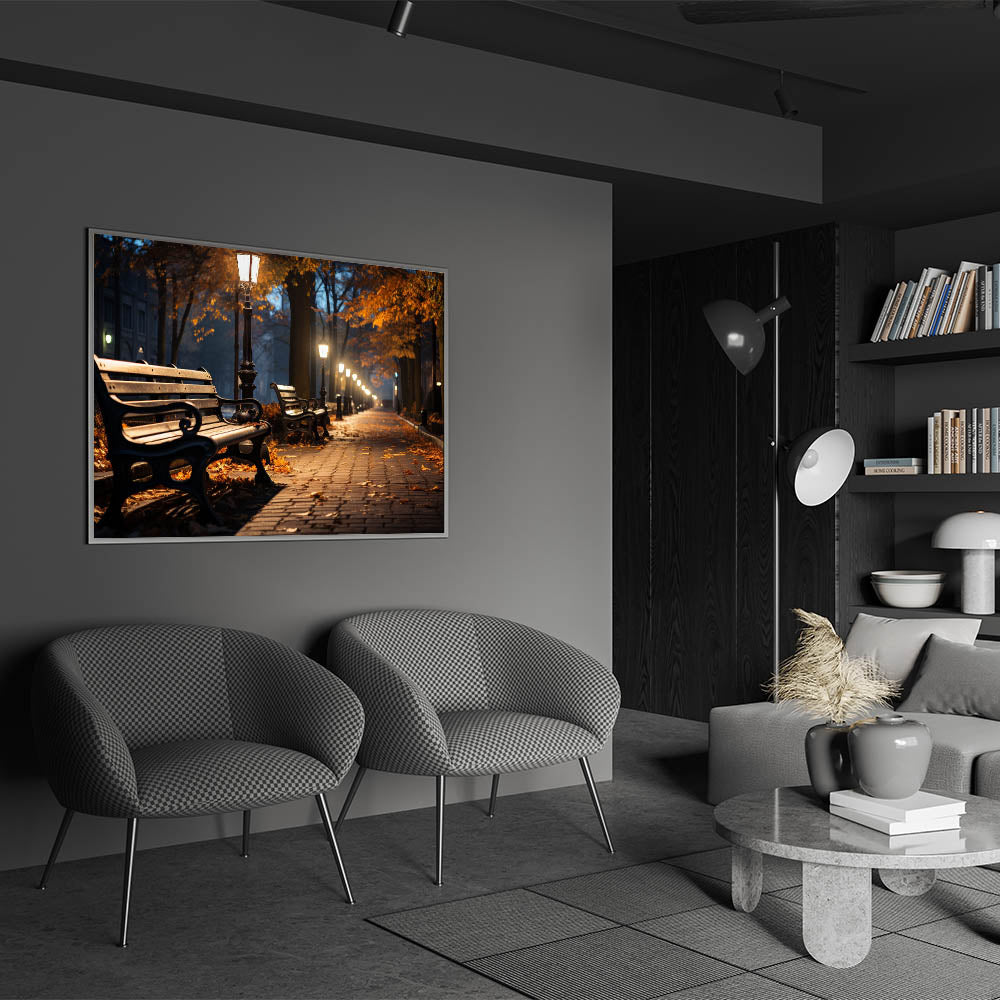 Capture the peaceful ambiance of a quiet evening in the park with this Tranquil Night Street Photography Art. This artwork features a row of inviting benches illuminated by the soft glow of street lamps, with autumn leaves gently scattered on the path. The serene scene invites you to pause and reflect, making it an ideal addition to any space that could benefit from a calming presence.