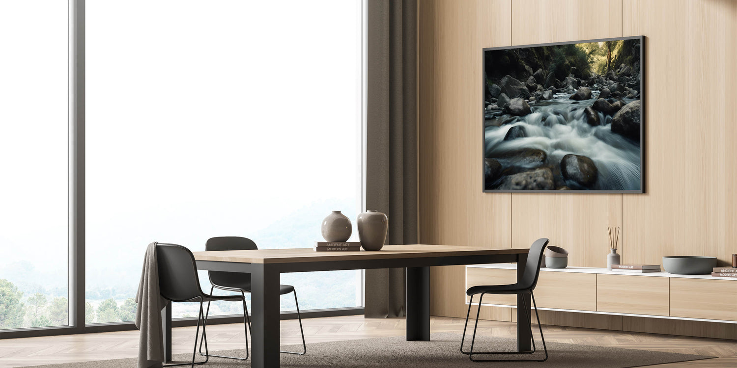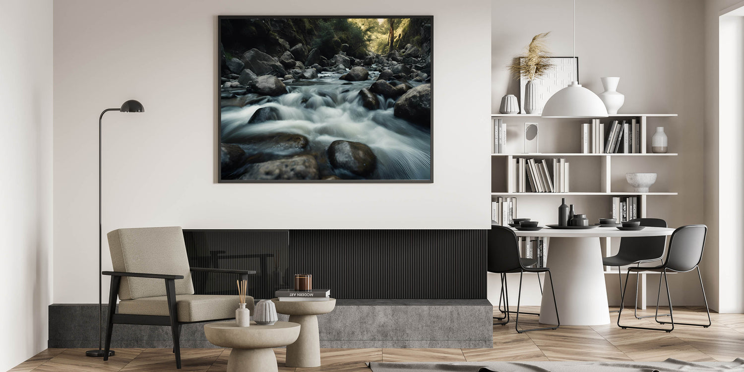 Introduction: Bring the peaceful energy of nature into your space with this stunning wall art, capturing the tranquil flow of a river over smooth rocks. This piece, part of our Rocks in Landscapes collection, beautifully illustrates the calming effect of water moving through a rugged landscape, making it an ideal choice for any room.