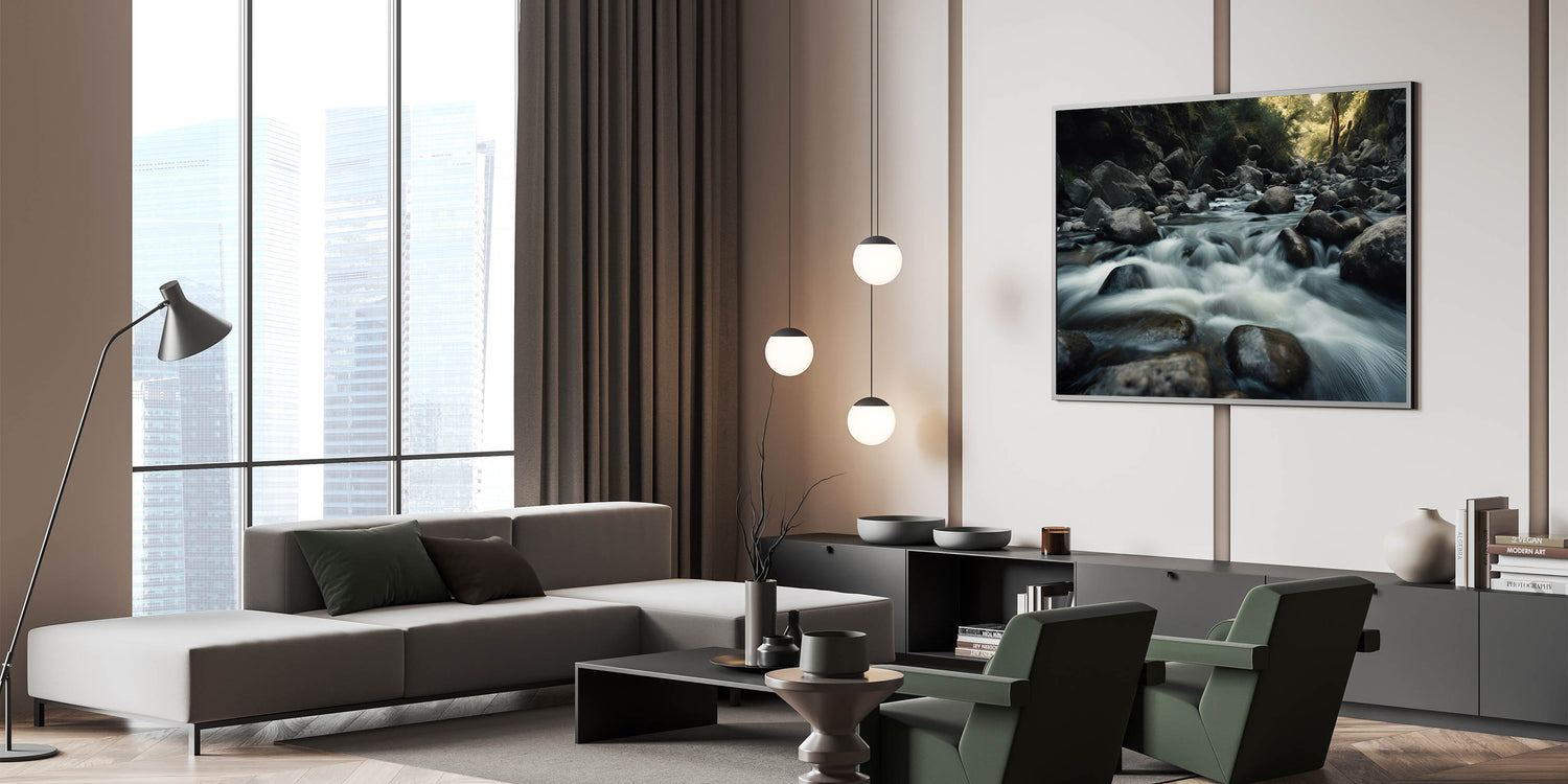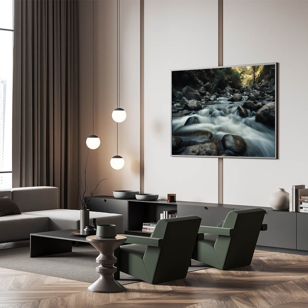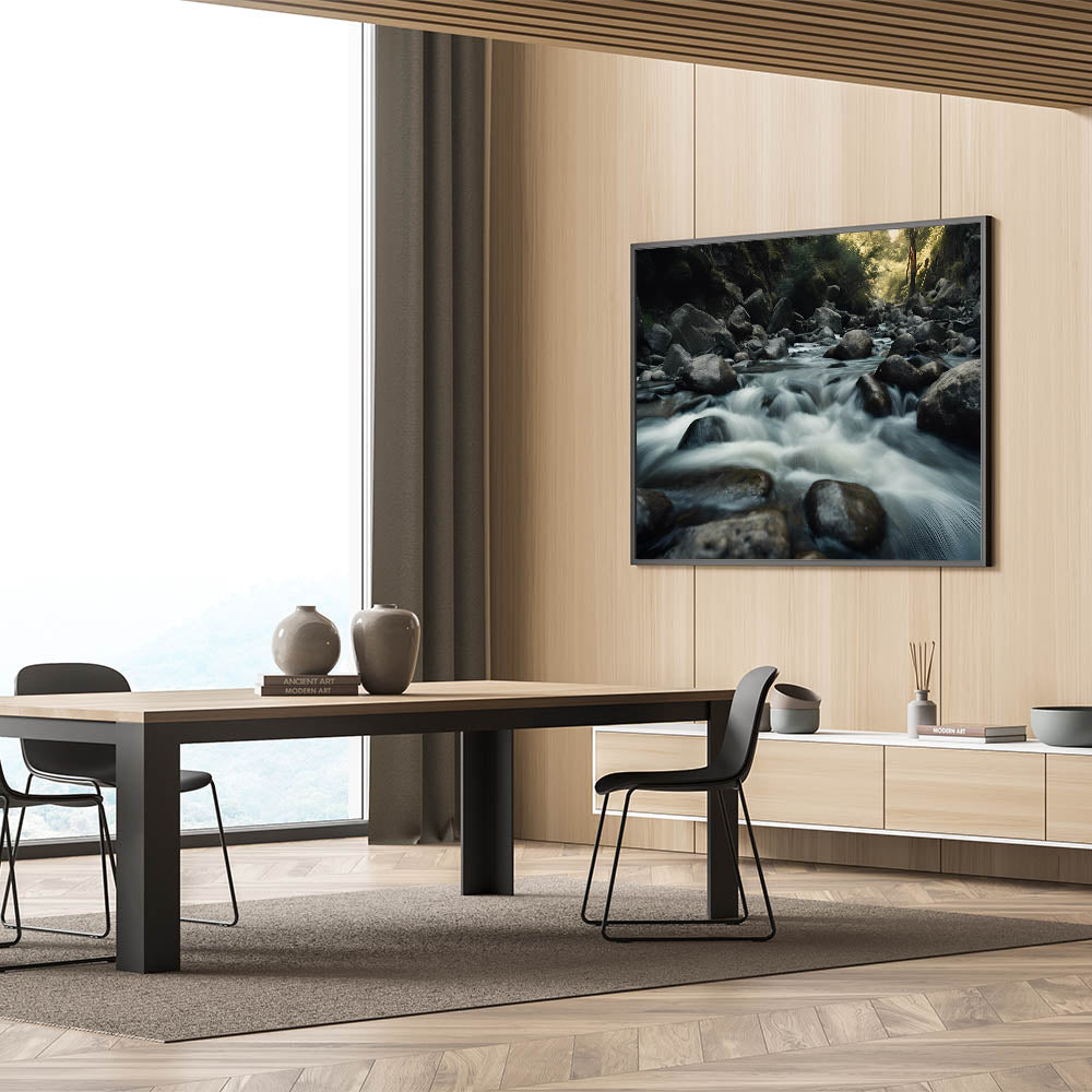 Closing: This nature-inspired wall art is ideal for anyone looking to add a touch of tranquility to their space. Whether you display it in your living room, bedroom, or office, the serene imagery of flowing water over rocks will bring a sense of peace and calm to your decor.